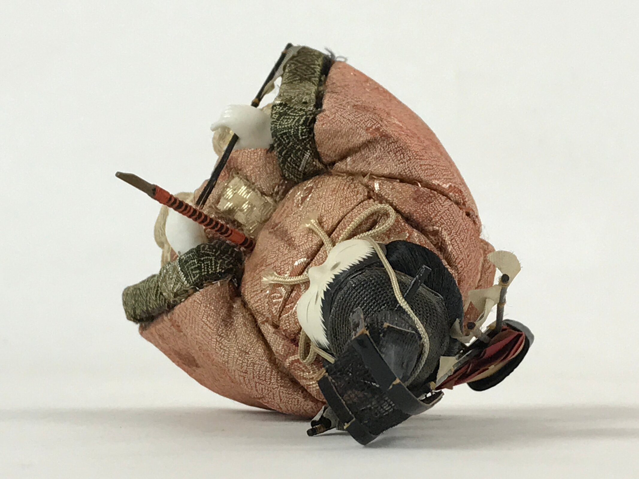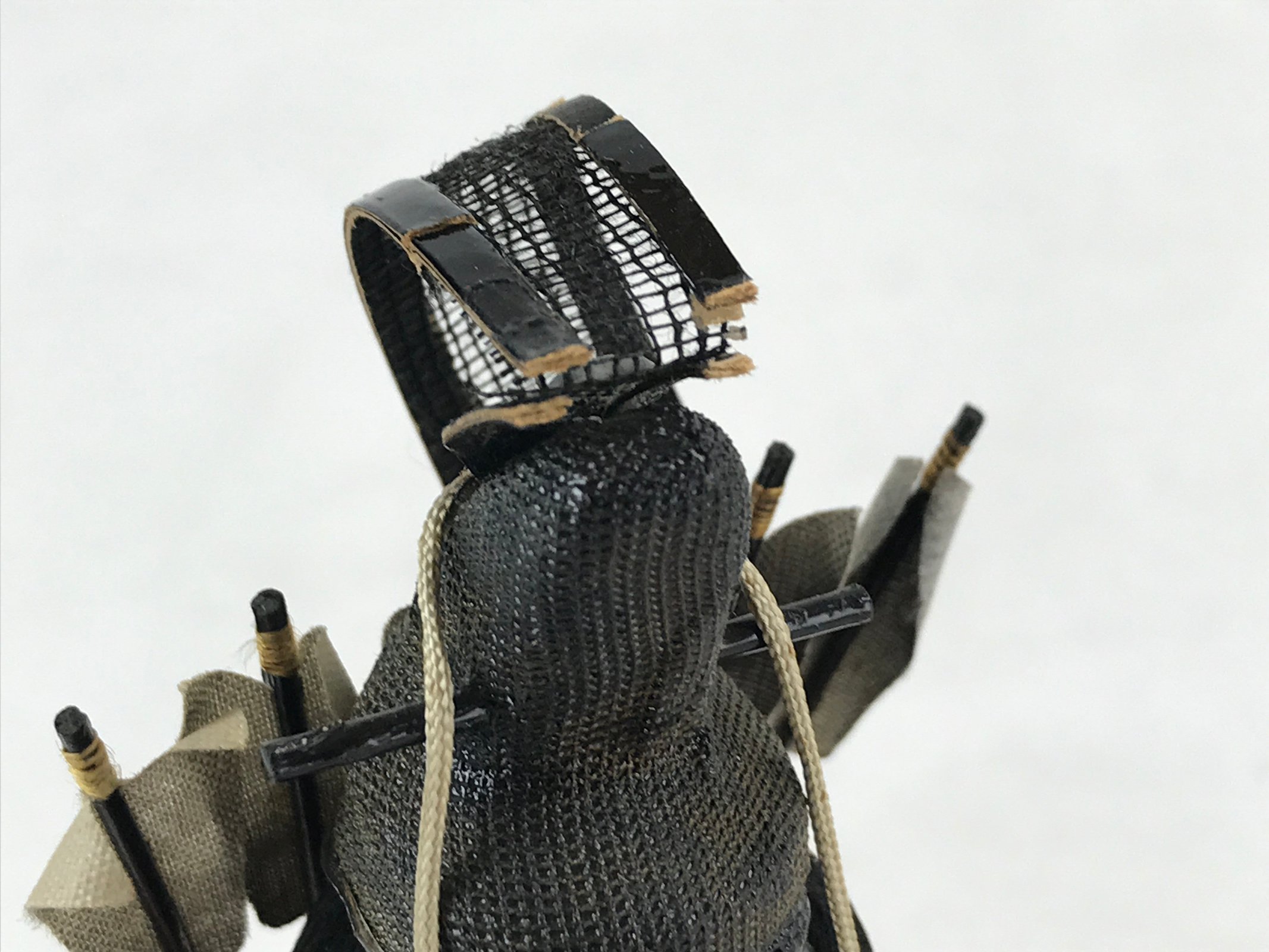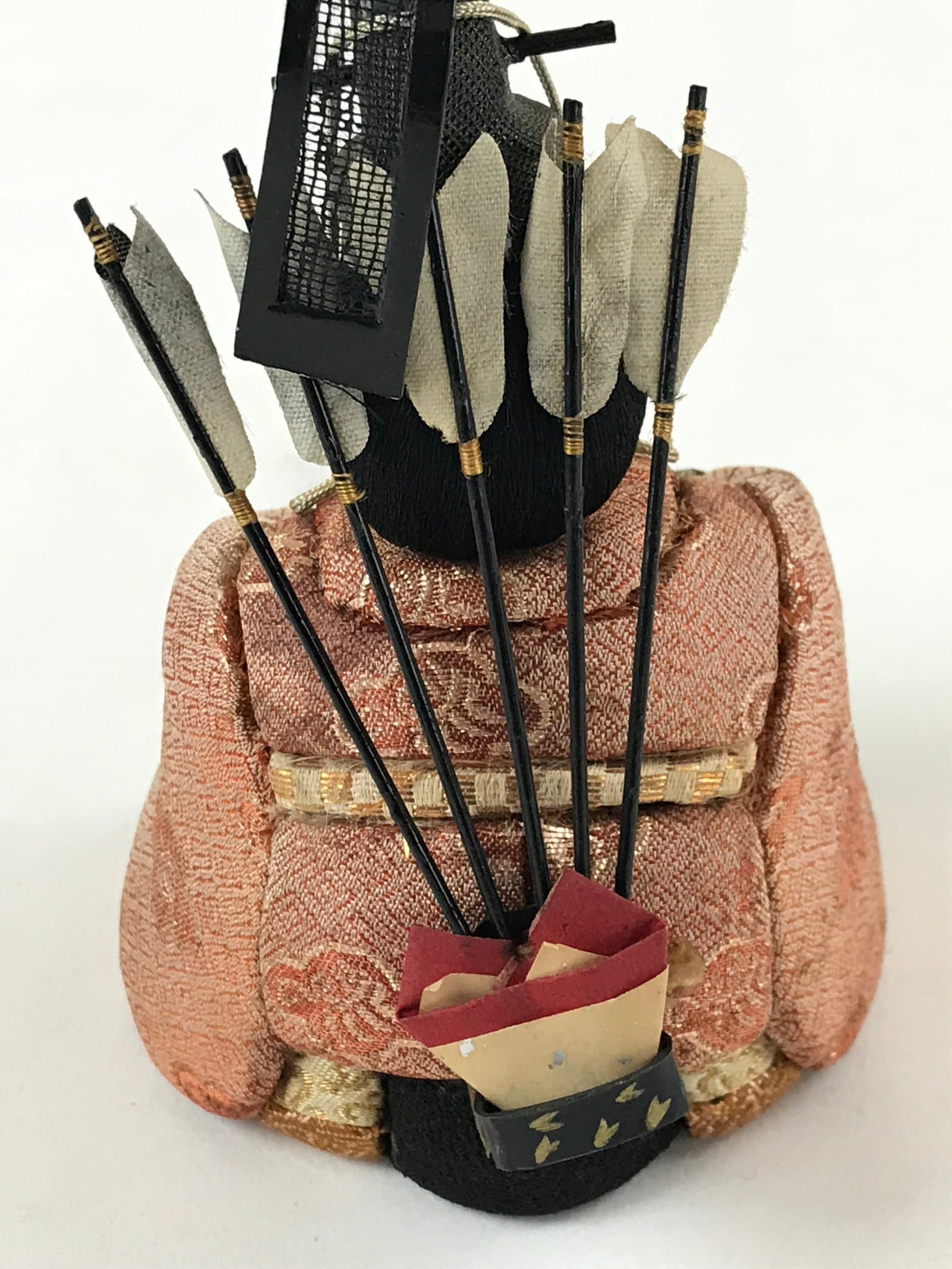 - Good condition. Bow is missing. Arrow on the front is broken and missing. Top of the hat (ken-ei) is torn on back side. Sword has been repaired with tape. Quiver on the back is a little bit loose. Some stains. Wear and tear due to age. Please see the photos carefully.