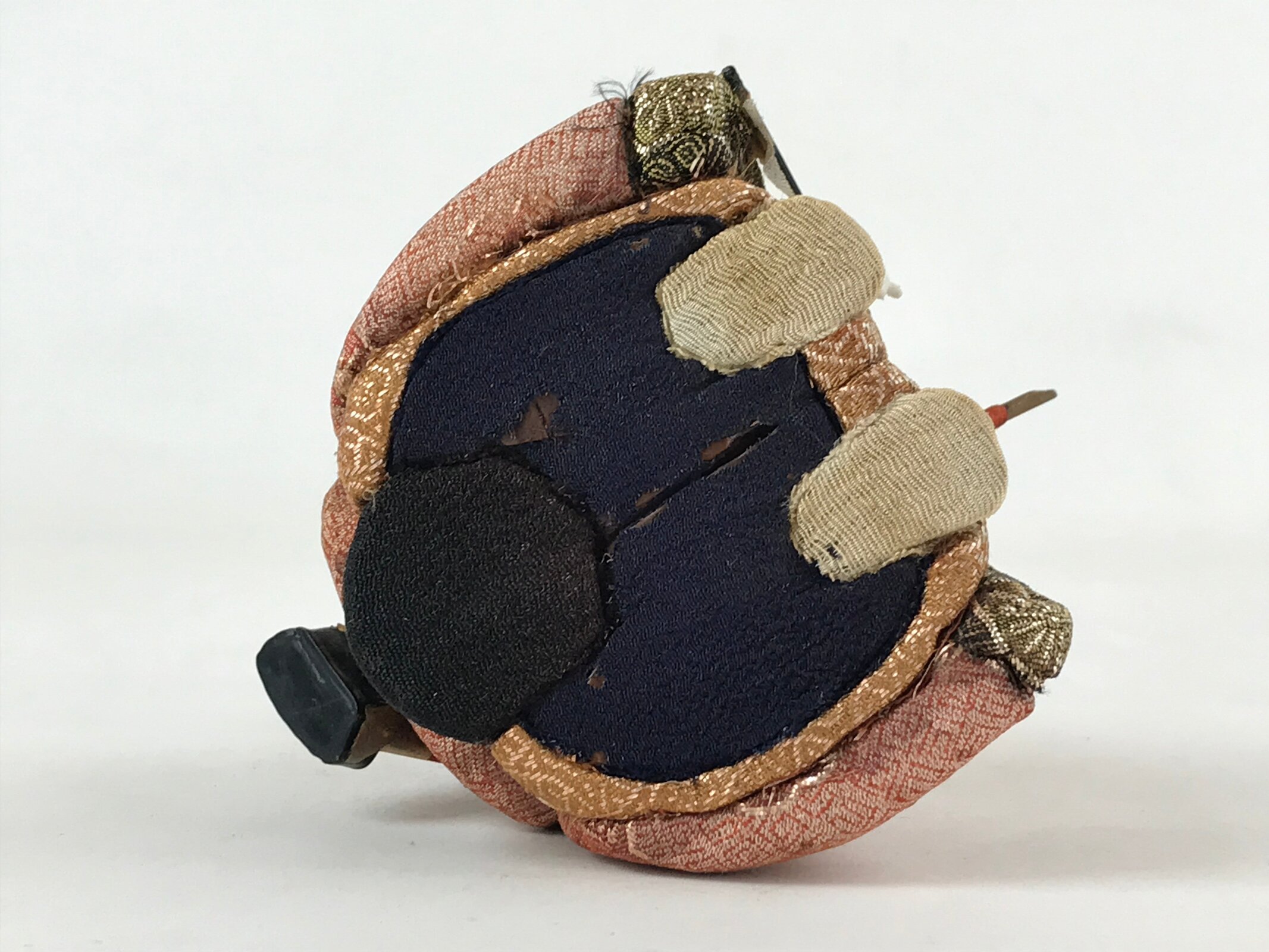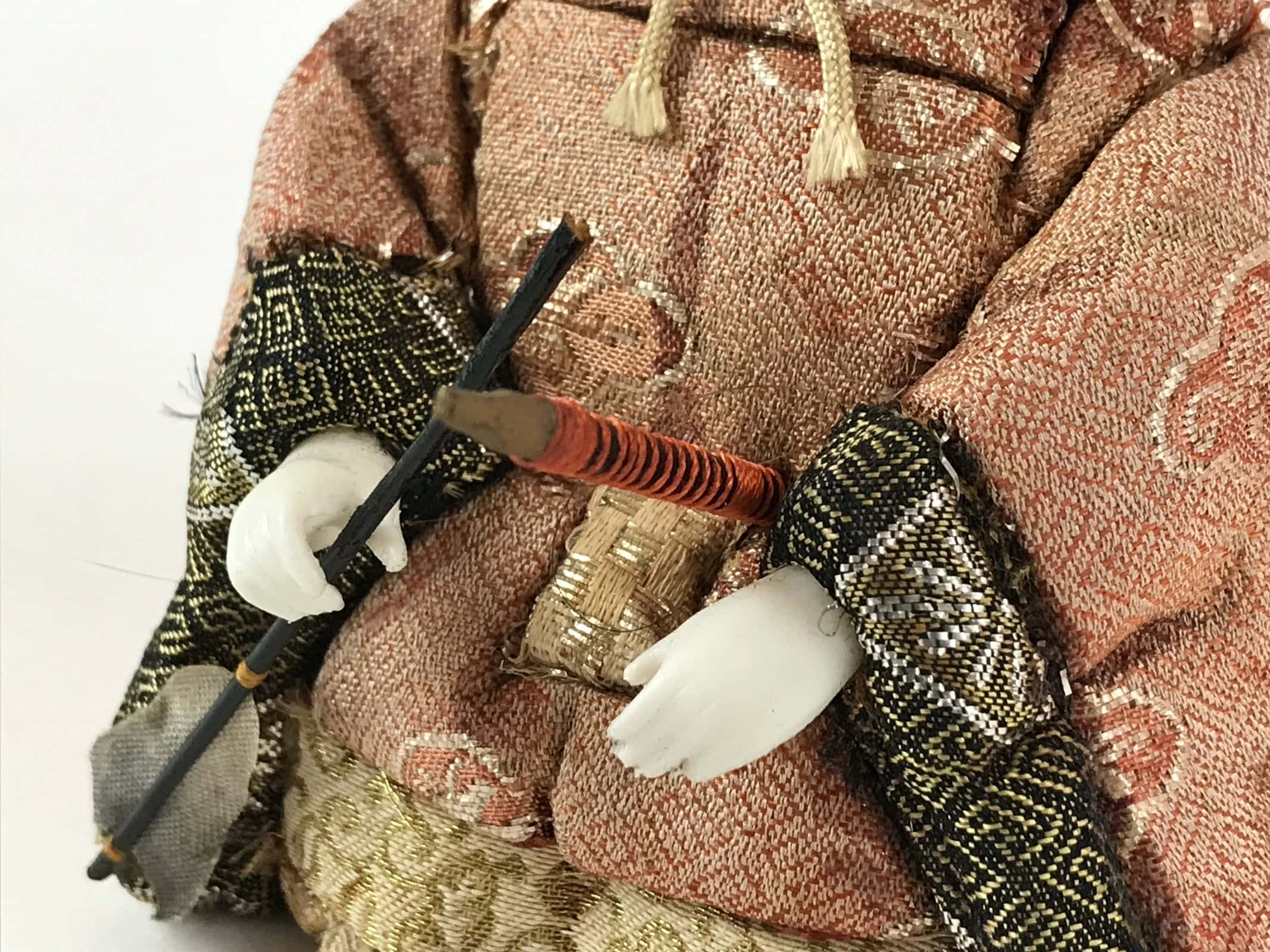 This handsome vintage samurai zuishin (military officer in charge of the protection of the prince) udaijin ohinasama doll decorated in red, black, and gold silk is the perfect addition to any existing hina set or to add gorgeous Eastern flair to any home decor.
