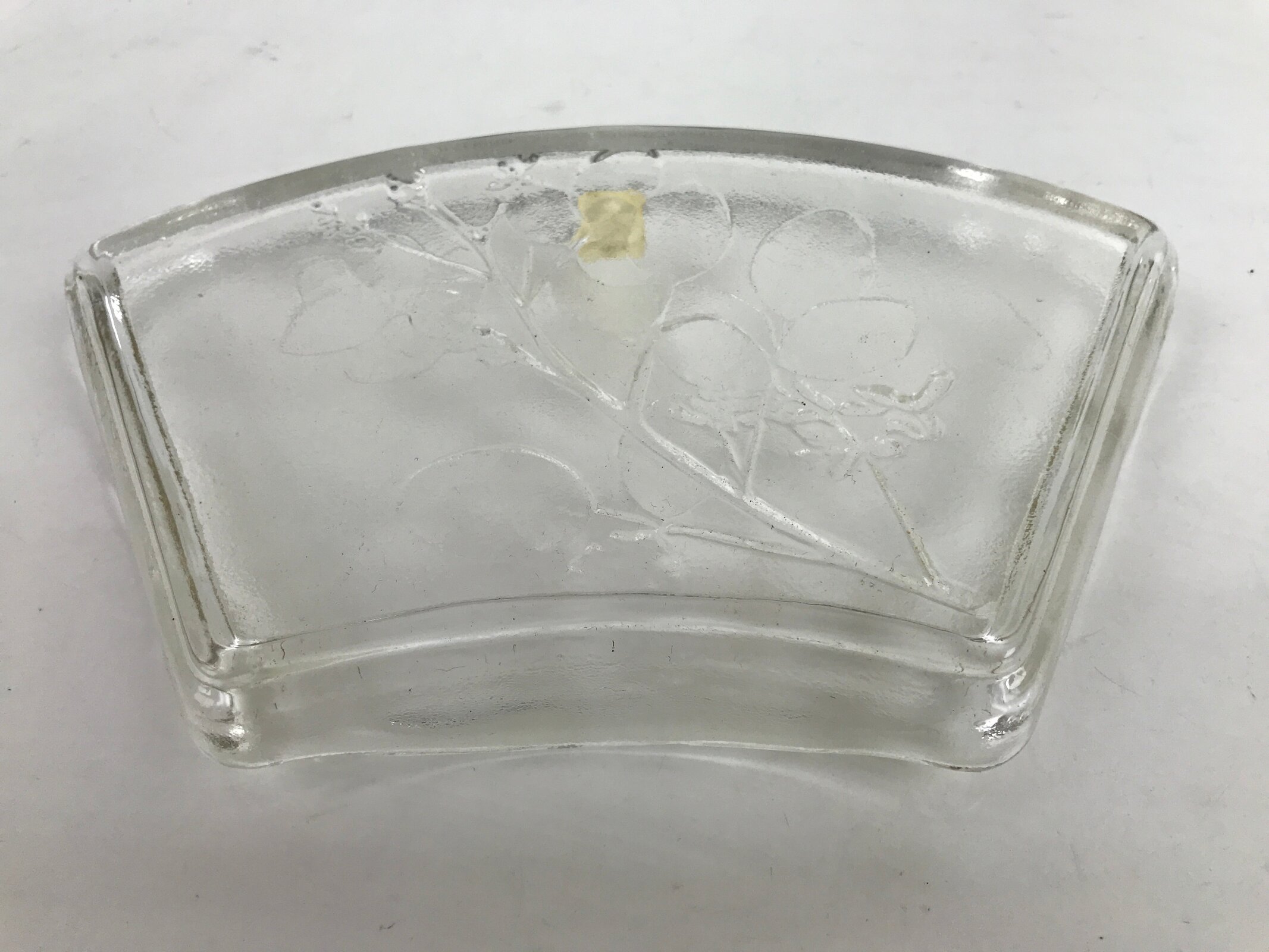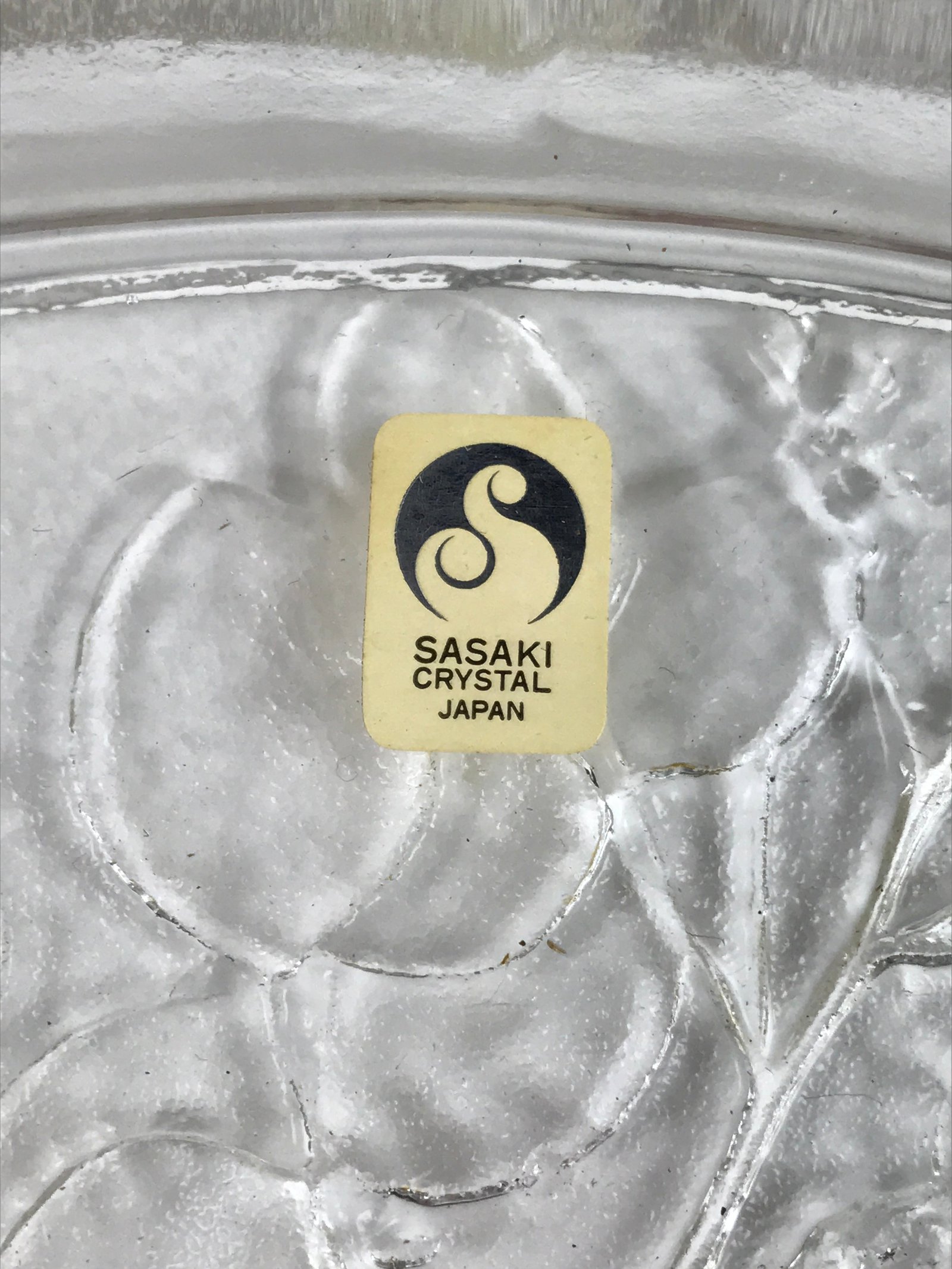 This is a vintage Japanese Sasaki crystal glass plate. This fan-shaped small plate, also called kozara, is clear and features an embossed image of bush clover/Japanese clover (hagi). Kozara are often used for side dishes and serving desserts. This particular plate is most likely used for single servings of sashimi. It has the original maker’s sticker on the front.