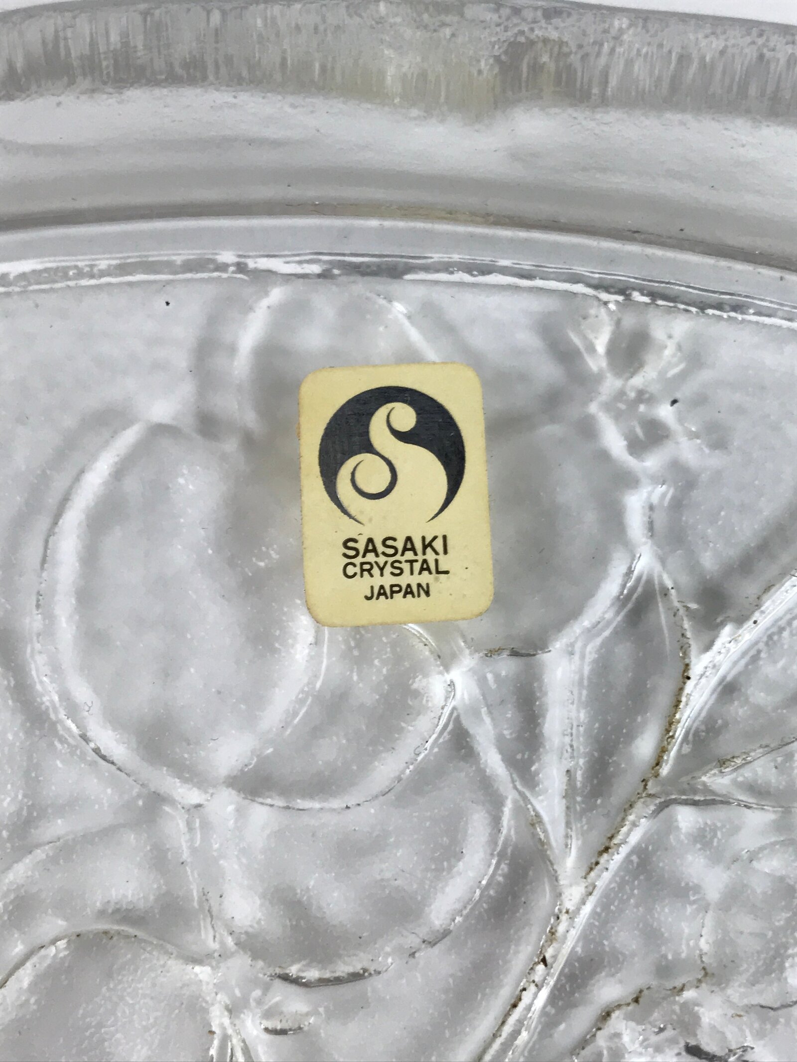 This is a vintage Japanese Sasaki crystal glass plate. This fan-shaped small plate, also called kozara, is clear and features an embossed image of bush clover/Japanese clover (hagi). Kozara are often used for side dishes and serving desserts. This particular plate is most likely used for single servings of sashimi. It has the original maker’s sticker on the front.