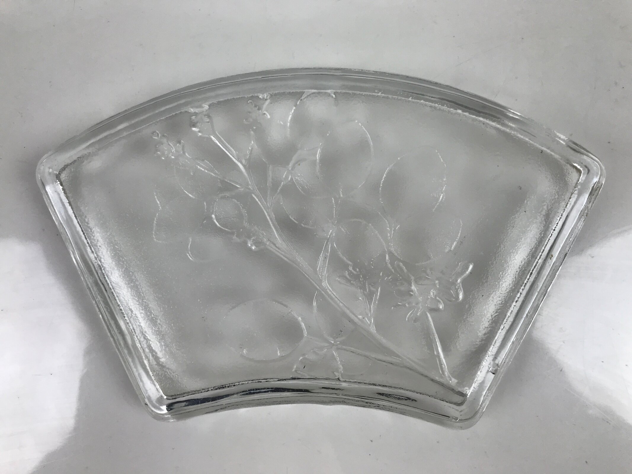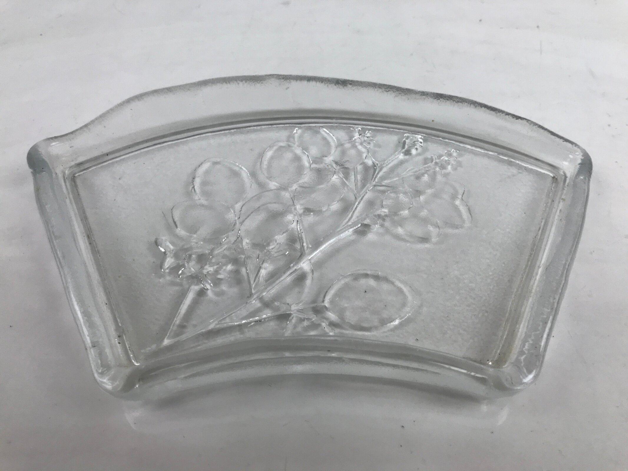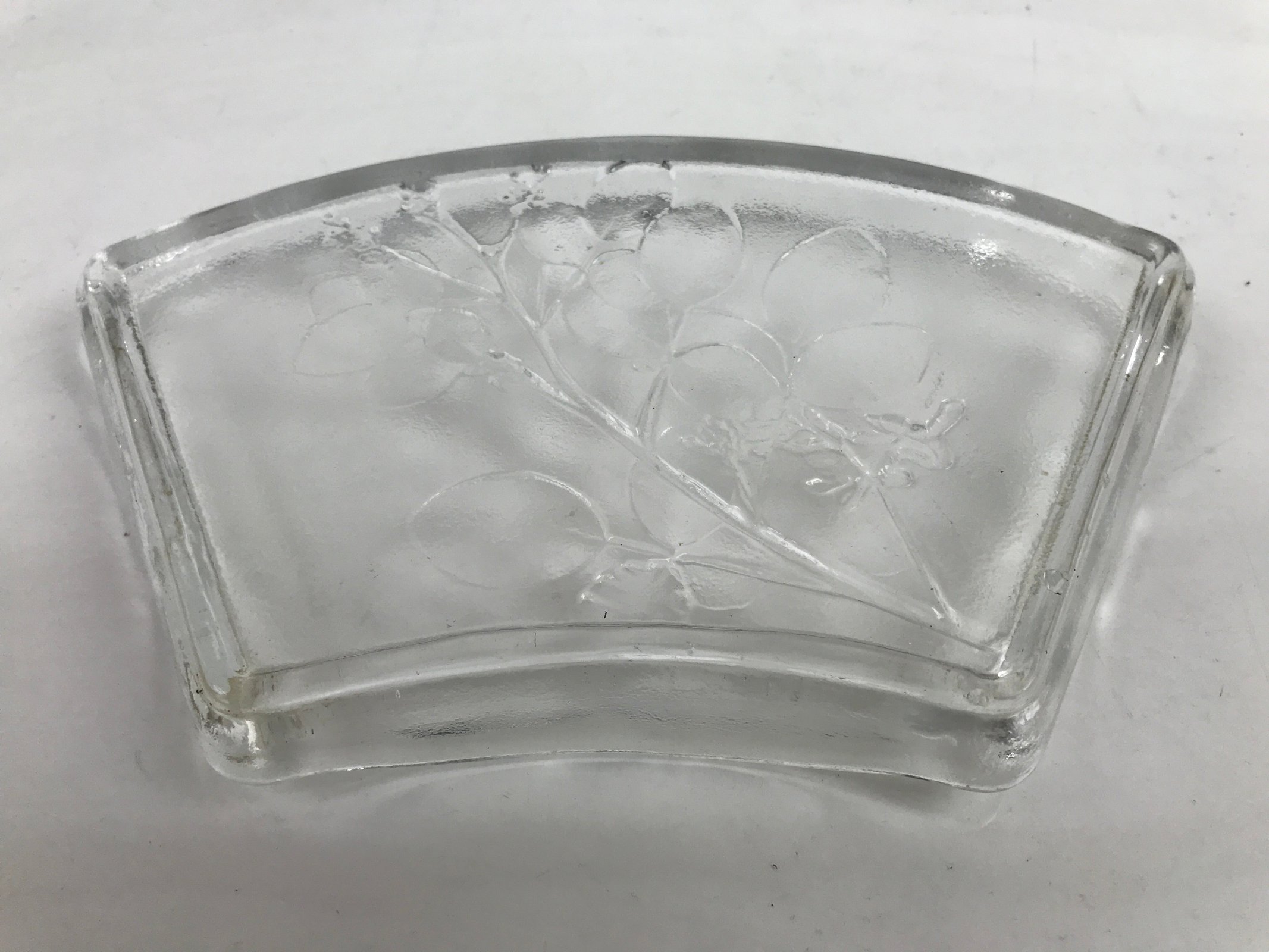 This is a vintage Japanese Sasaki crystal glass plate. This fan-shaped small plate, also called kozara, is clear and features an embossed image of bush clover/Japanese clover (hagi). Kozara are often used for side dishes and serving desserts. This particular plate is most likely used for single servings of sashimi. It has the original maker’s sticker on the front.