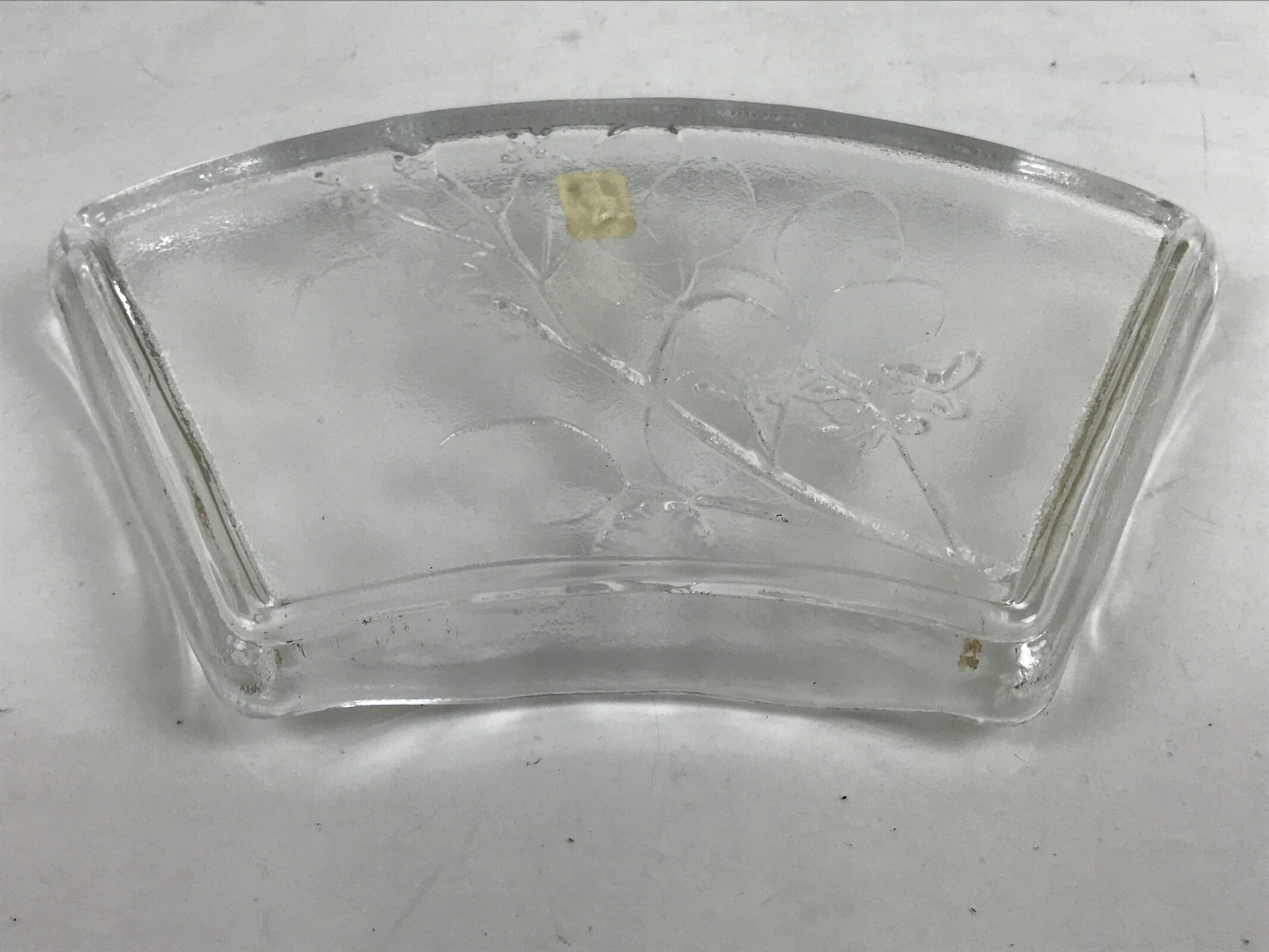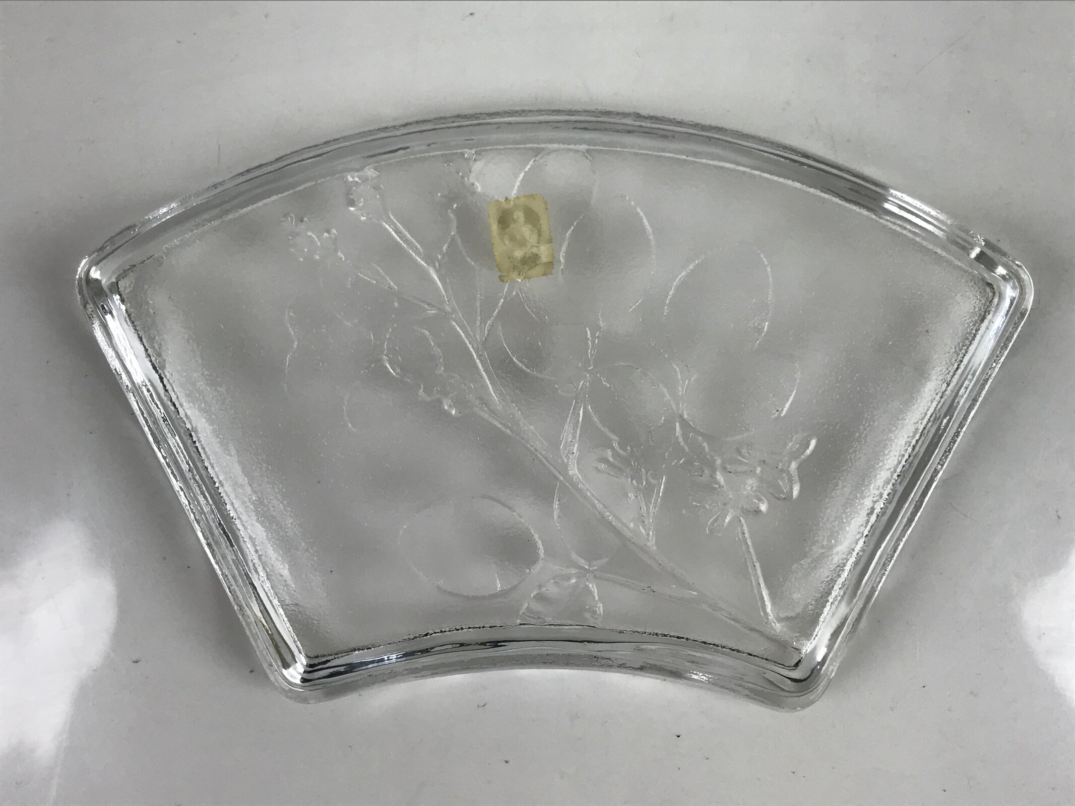 This is a vintage Japanese Sasaki crystal glass plate. This fan-shaped small plate, also called kozara, is clear and features an embossed image of bush clover/Japanese clover (hagi). Kozara are often used for side dishes and serving desserts. This particular plate is most likely used for single servings of sashimi. It has the original maker’s sticker on the front.