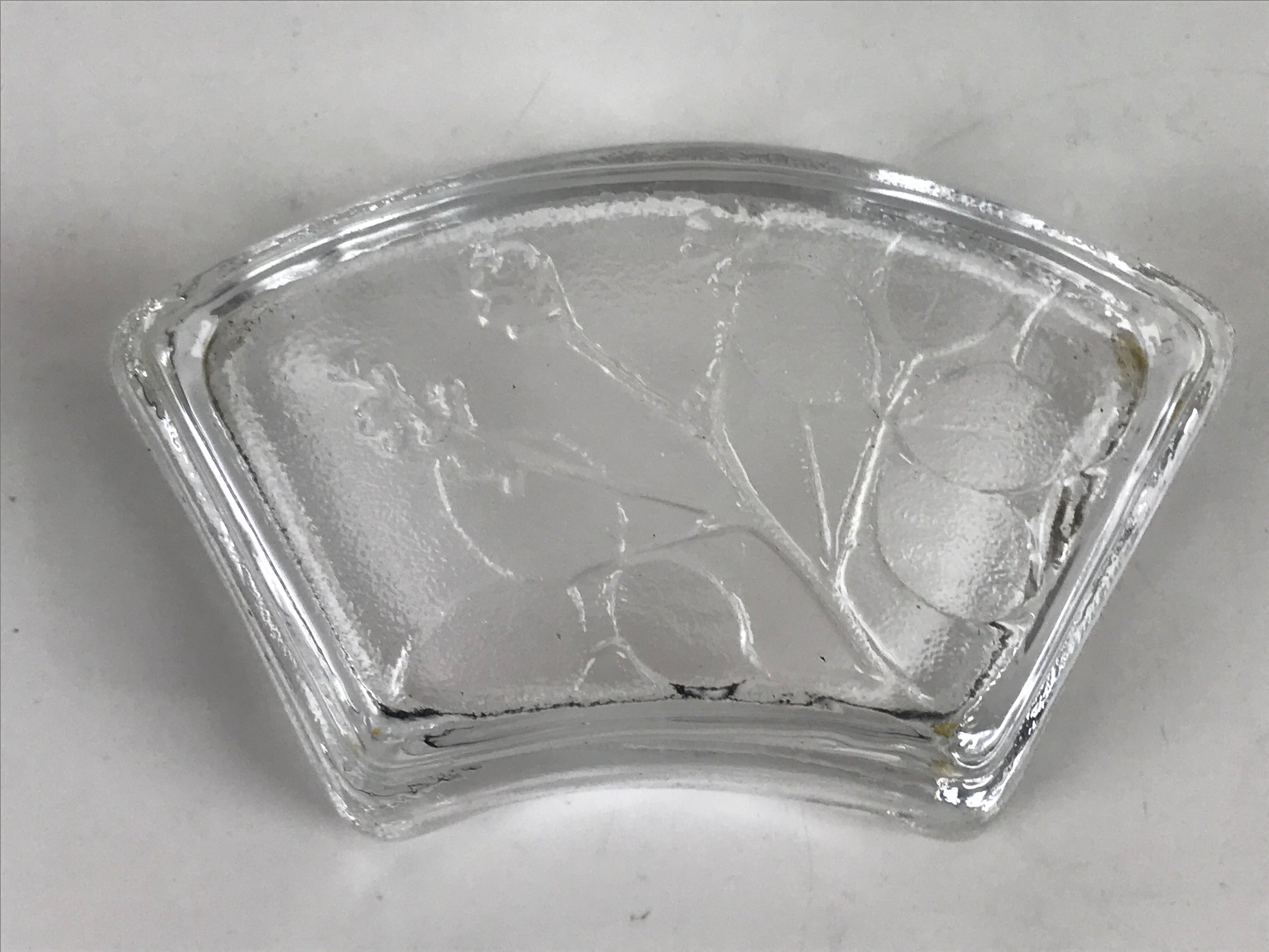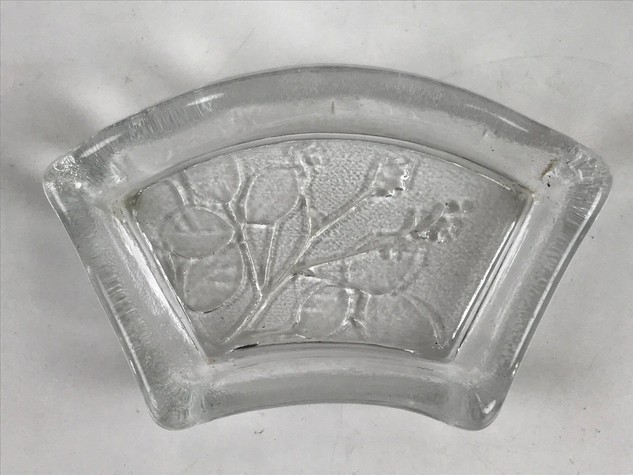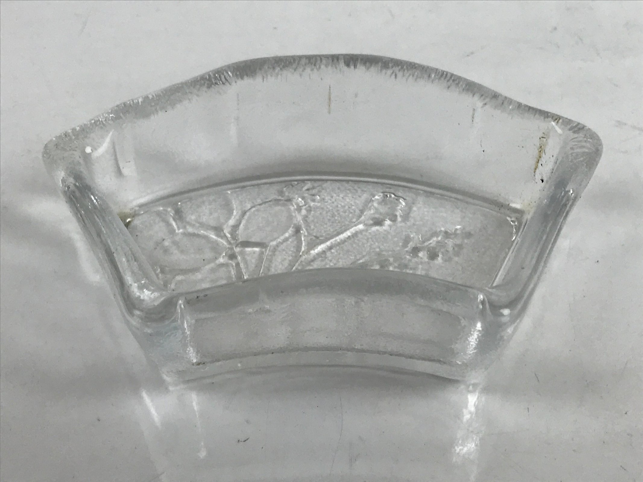 This item is a vintage Japanese serving dish in the shape of a fan. Made of Sasaki crystal, this is used for small aesthetic dishes often served during traditional multi-course kaiseki meals, as well as a dipping bowl for soy sauce and other condiments when eating sashimi. It features an embossed image of bush clover/Japanese clover (hagi).