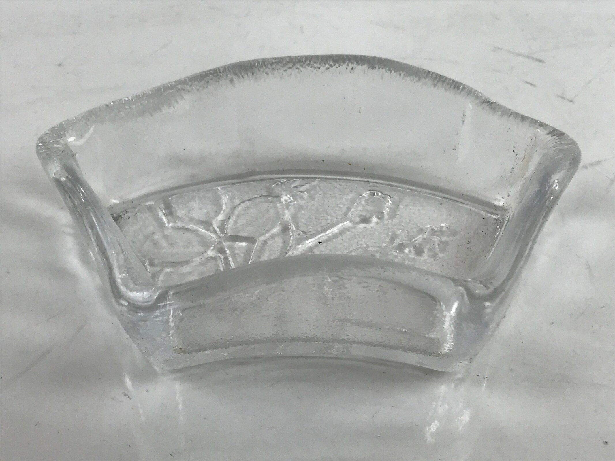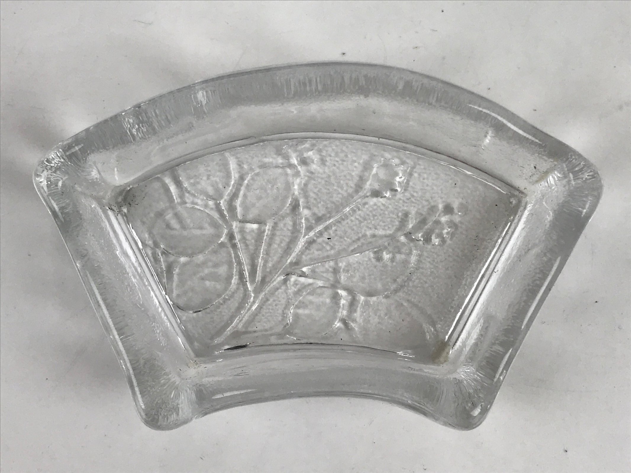 This item is a vintage Japanese serving dish in the shape of a fan. Made of Sasaki crystal, this is used for small aesthetic dishes often served during traditional multi-course kaiseki meals, as well as a dipping bowl for soy sauce and other condiments when eating sashimi. It features an embossed image of bush clover/Japanese clover (hagi).