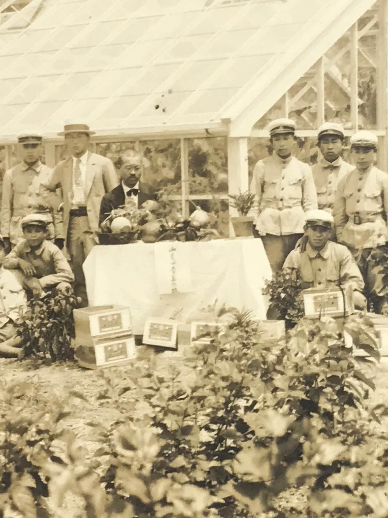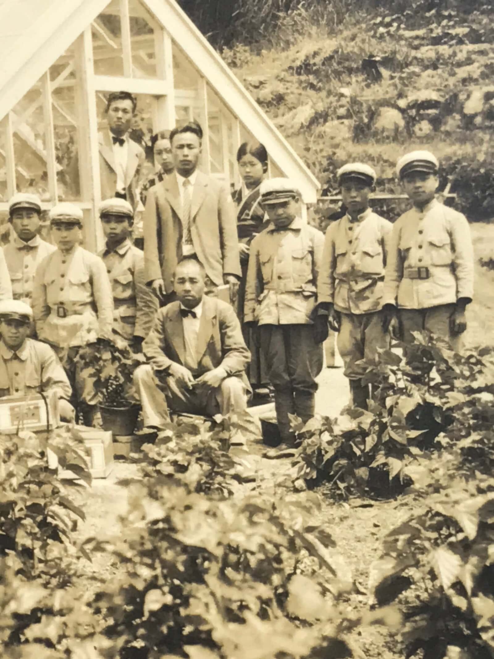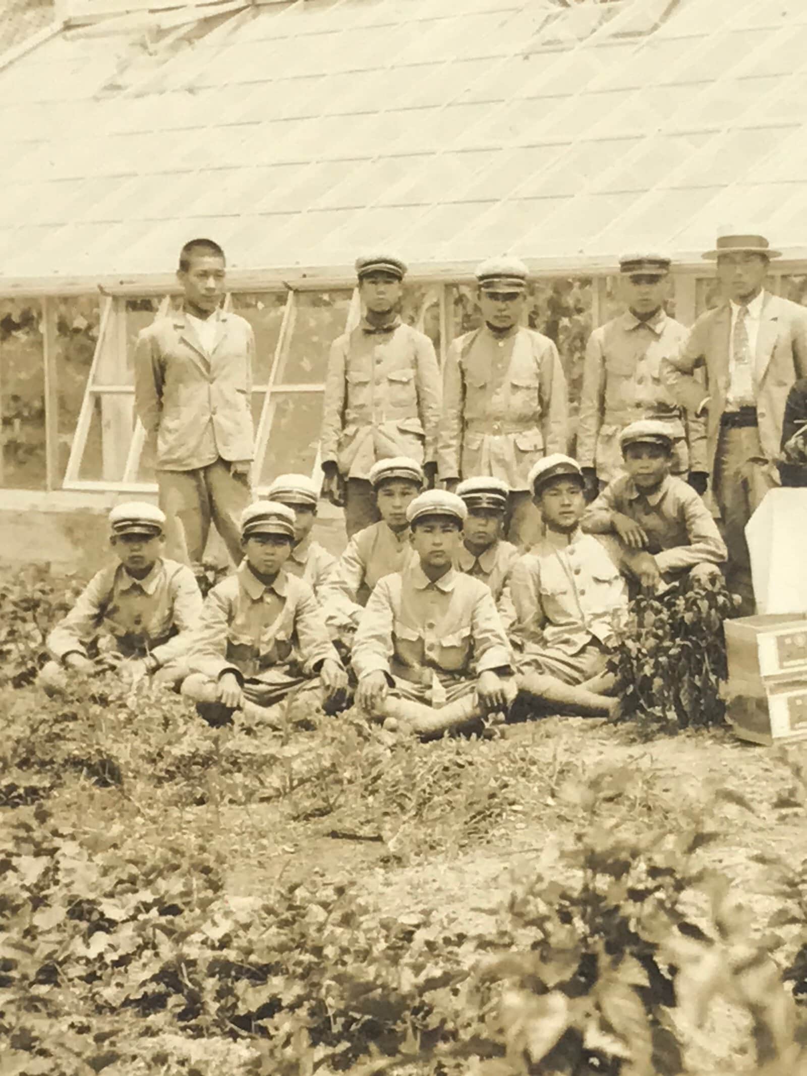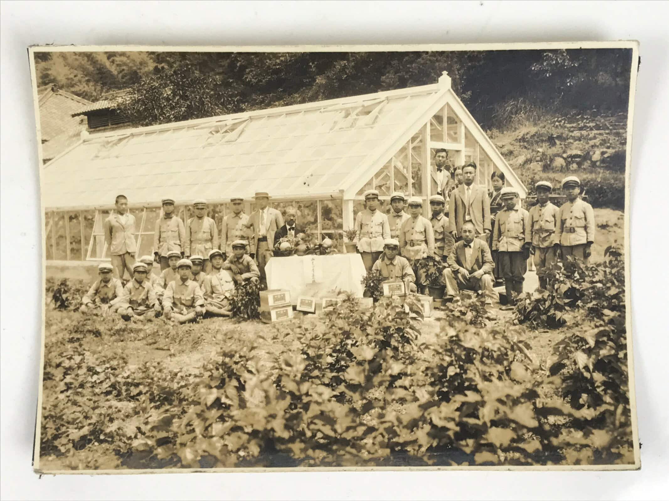 This is an original vintage early Showa Era daily life photograph of a class of school boys and their teachers posing outside a greenhouse and garden. Even in modern Japan, tasks such as gardening, cleaning, crafting, etc are skills that are taught to students at most levels of schooling whether for a dedicated class or for the practical study of science. The students wear military-style uniforms.