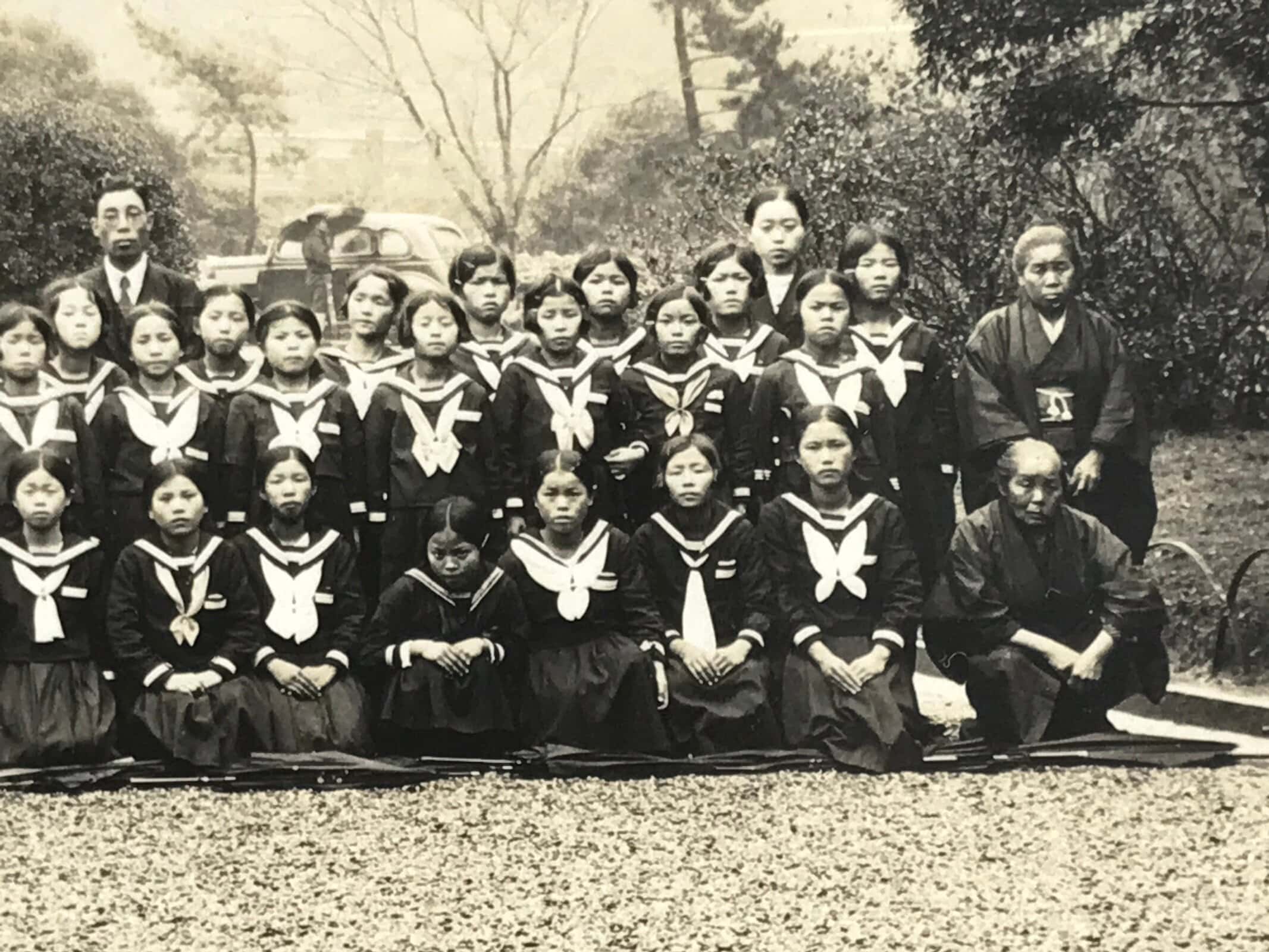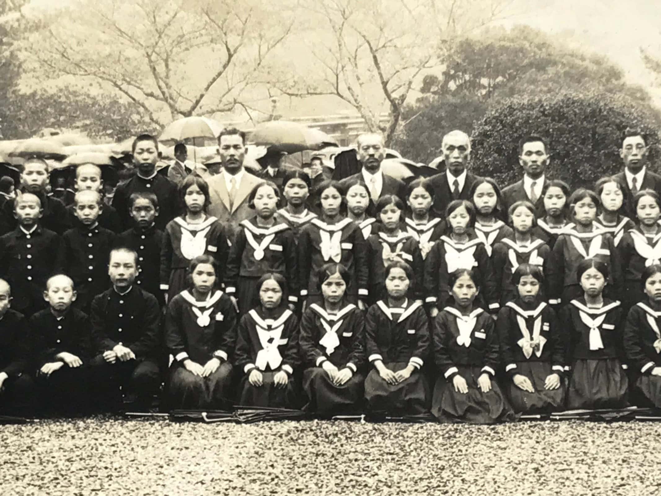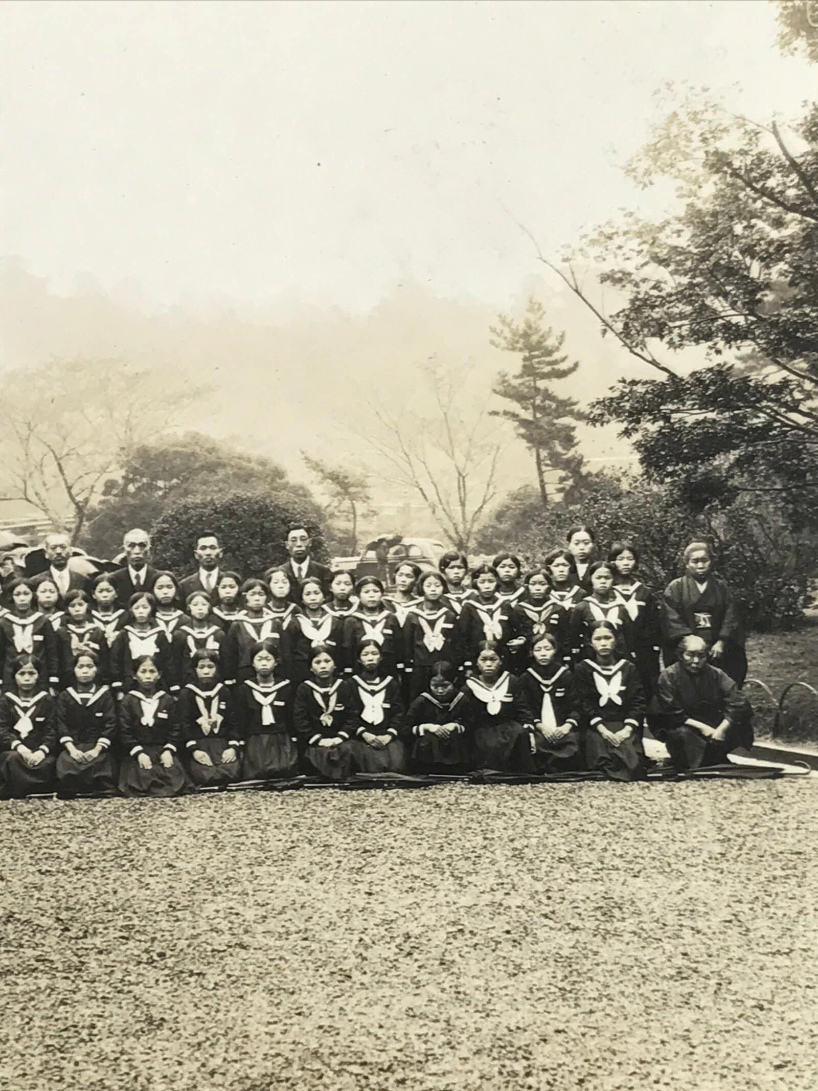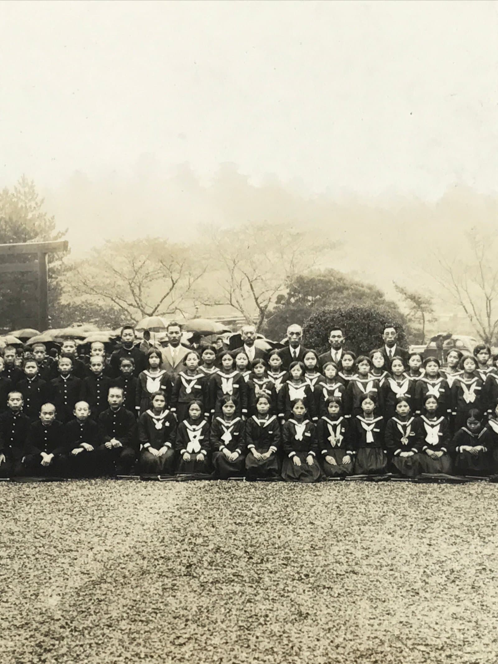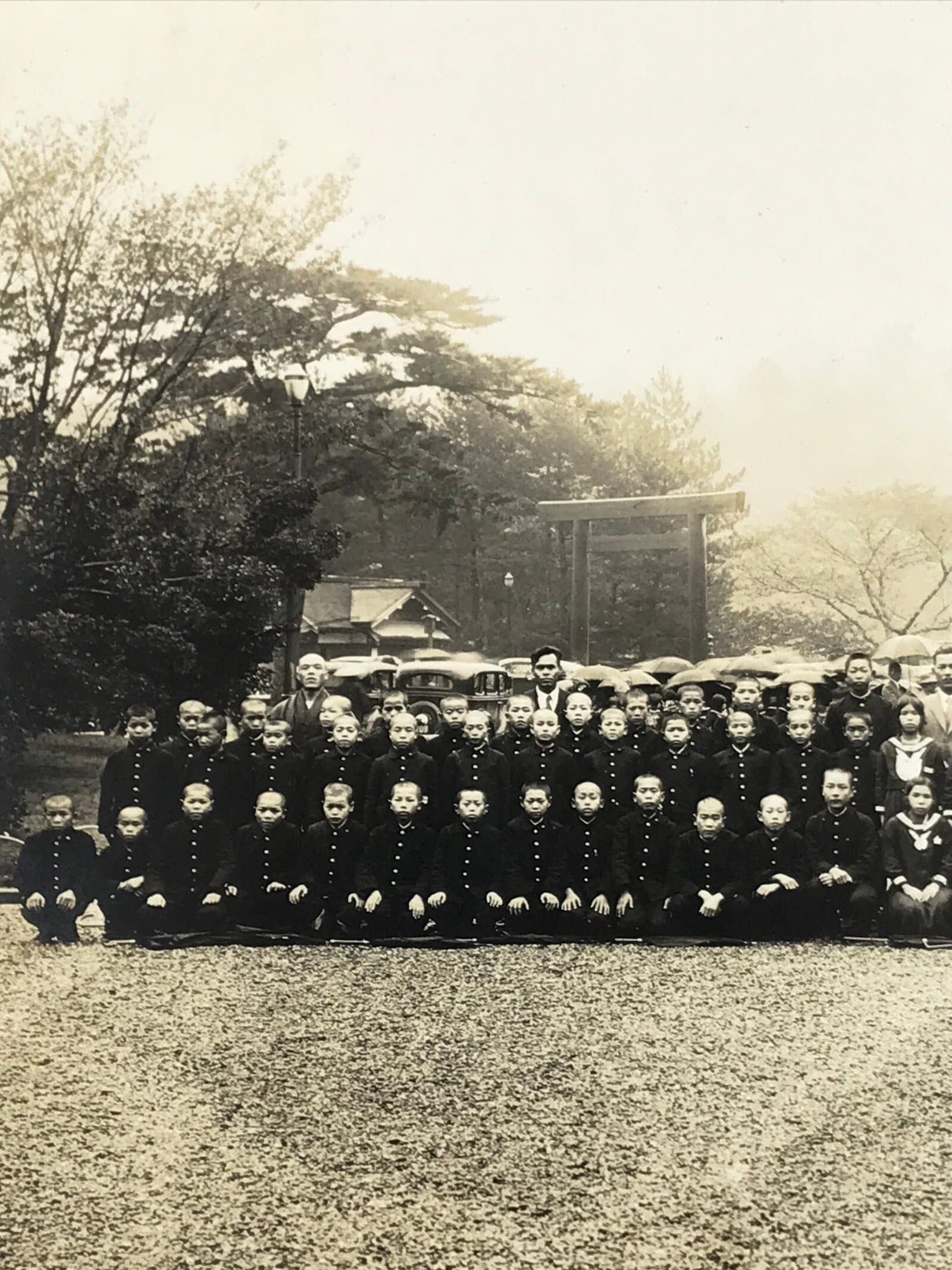 This is an original vintage Showa era photograph of a class of students in a soft sepia tone. The girls wear sailor fuku uniforms, while the boys also wear traditional uniforms. The teachers all wear suits with the exception of the two elderly women on the right side. They are posed in front of the first torii gate and bridge of Ise Grand Shrine in Mie Prefecture.