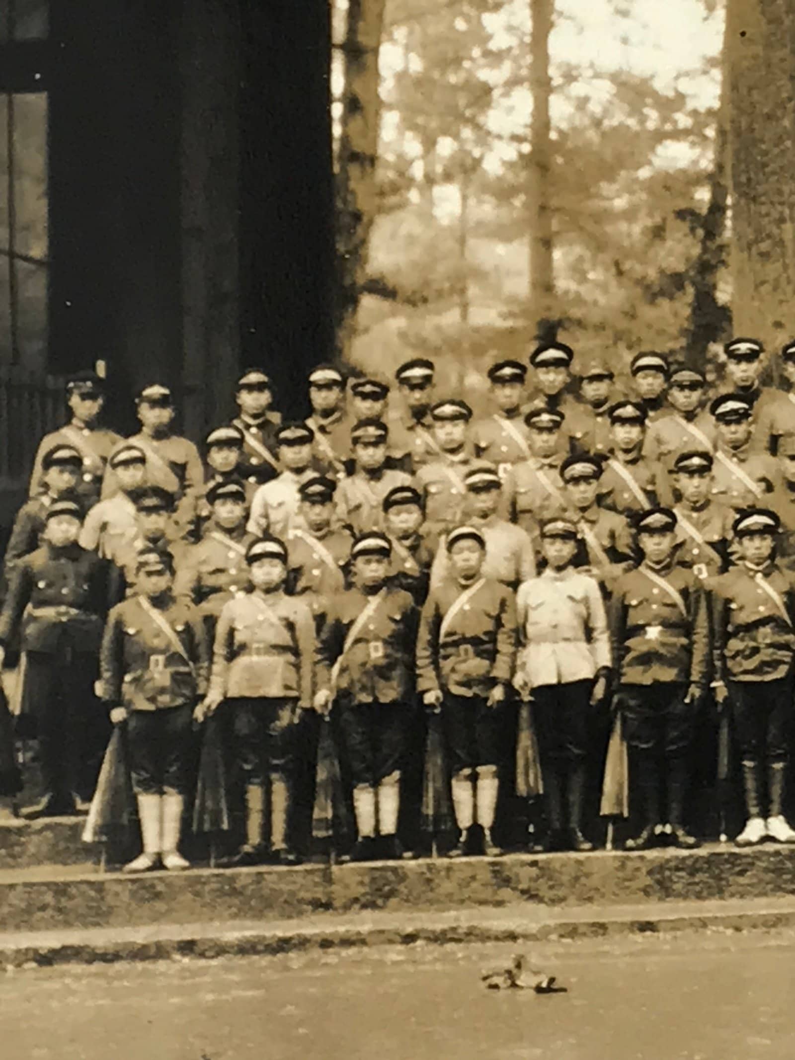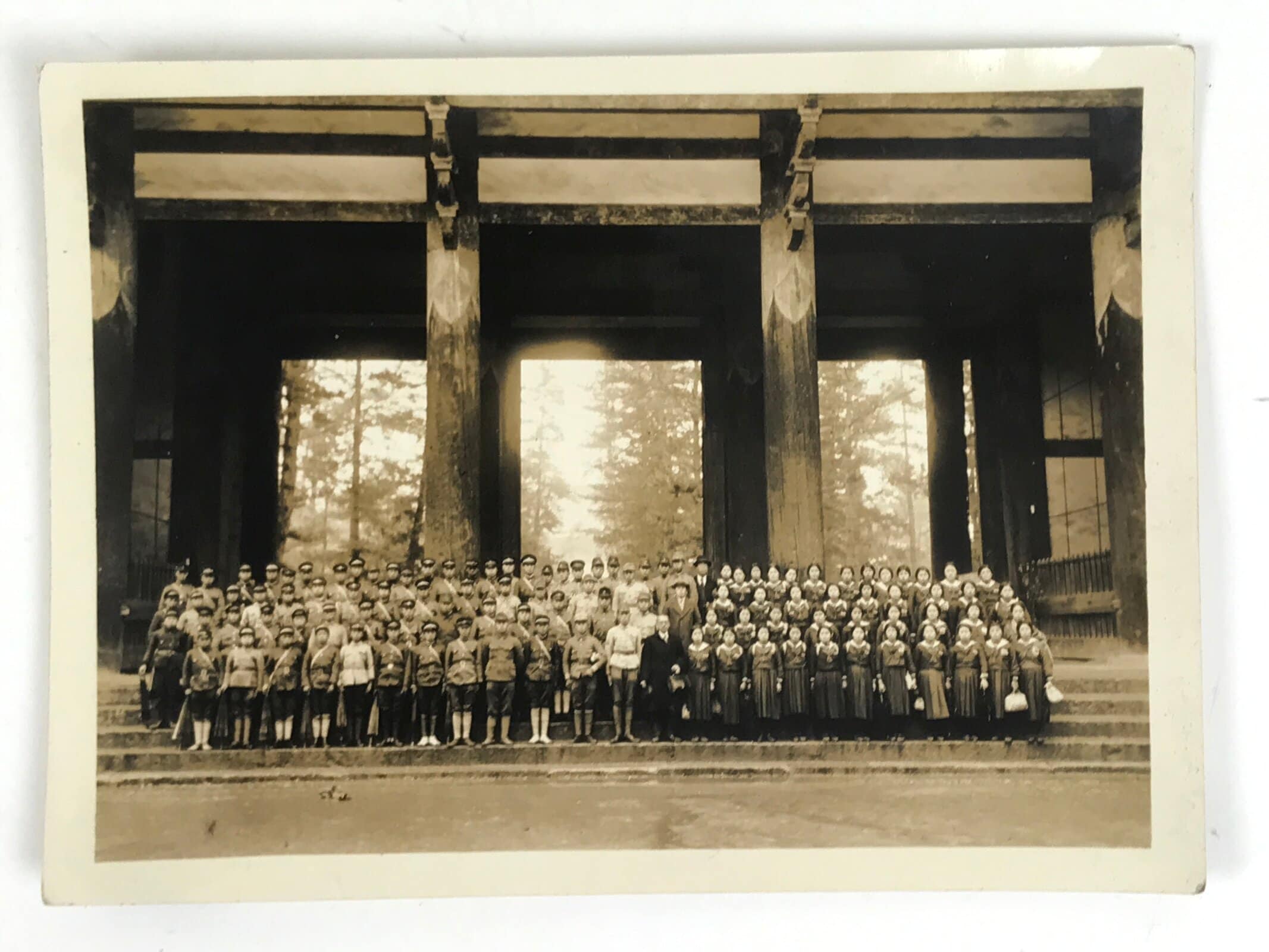 This is an original vintage early Showa Era photograph of a class of students in a sepia tone. The boys wear military uniforms (they were likely expected to enslist and were also given military education), while the girls wear traditional sailor-fuku school uniforms. The teachers all wear suits. They are posed in front of the Nandaimon Gate outside of the famous Todaiji Temple in Nara Prefecture.