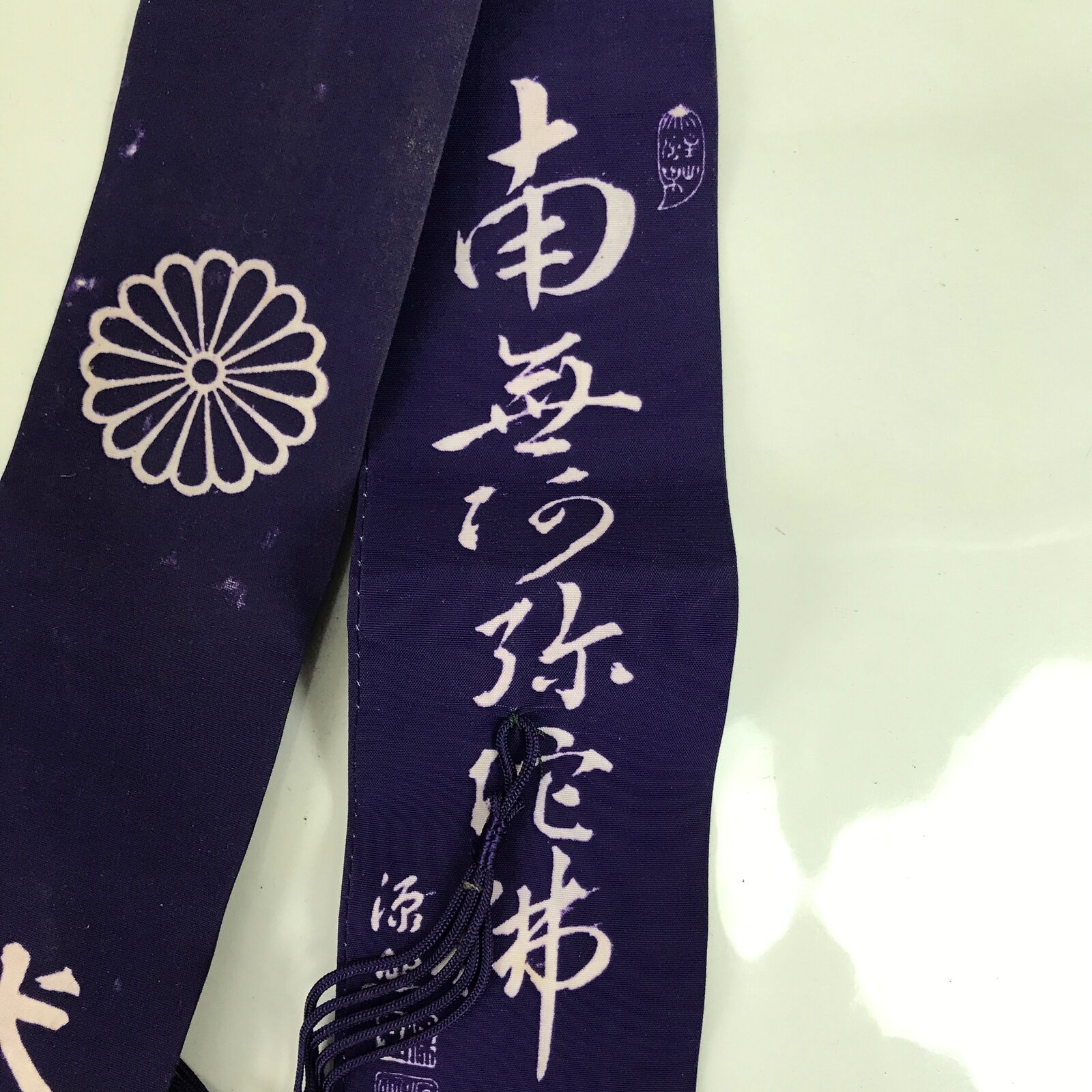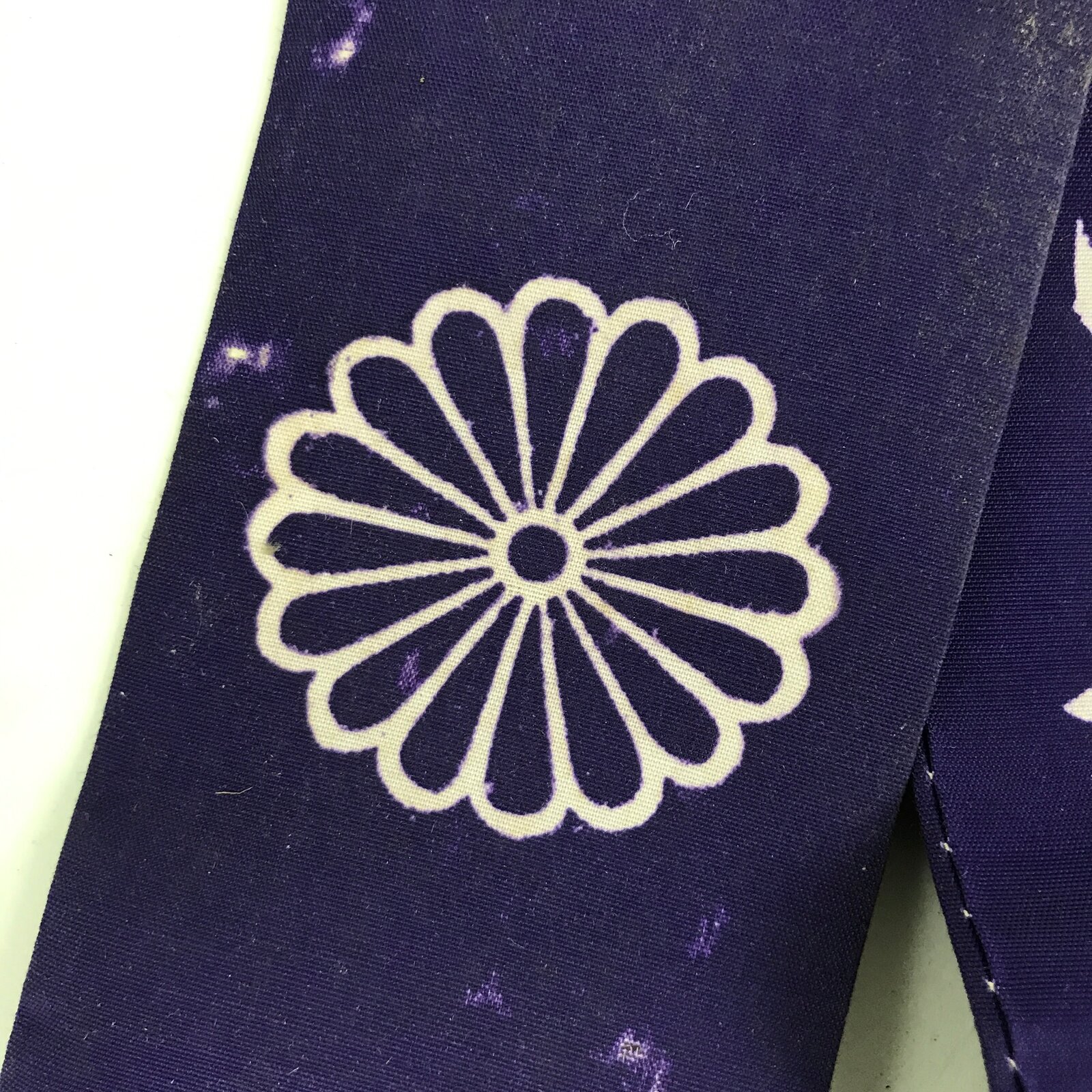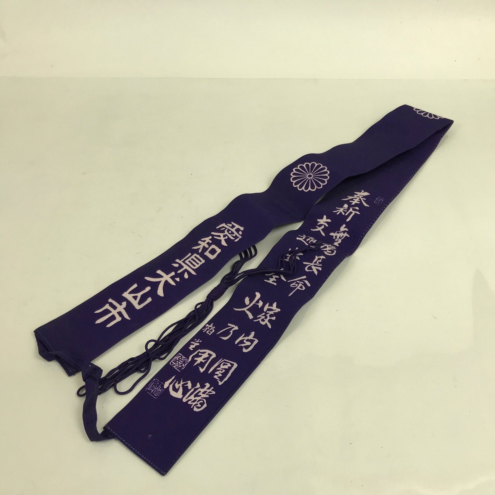 This Japanese school uniform sash (kubikake) is worn around the neck by students during ceremonies and special events. This sash is from the Inuyama Toshiyori College, an establishment founded after WWII to educate senior citizens. This item is purple with white chrysanthemum flowers and has inscriptions on the back. It comes in a box.