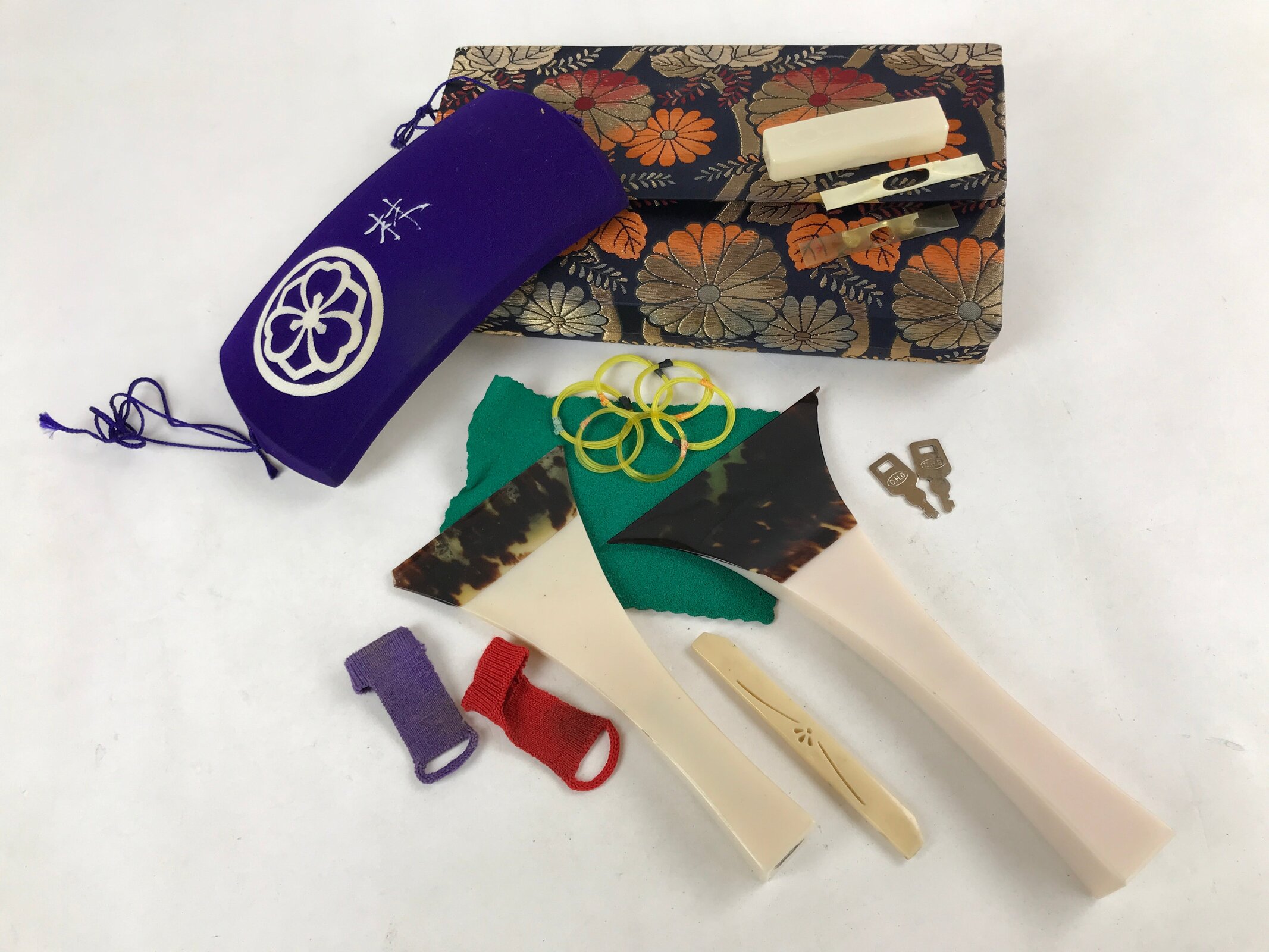 six coils of spare strings, red and purple finger covers (yubisuri/yubikake), two bridges (koma) with plastic case, two different-sized plectrums (bachi), a rich purple silk side cover with a mon crest (doukake), green rubber mat for knee (hiza gomu), bright golden yellow string anchor (neo), two keys for the hard case, a black cap for the head of the neck, and a large navy blue silk case. It also comes with its black transport case, covered with a navy blue felt fabric on the inside.