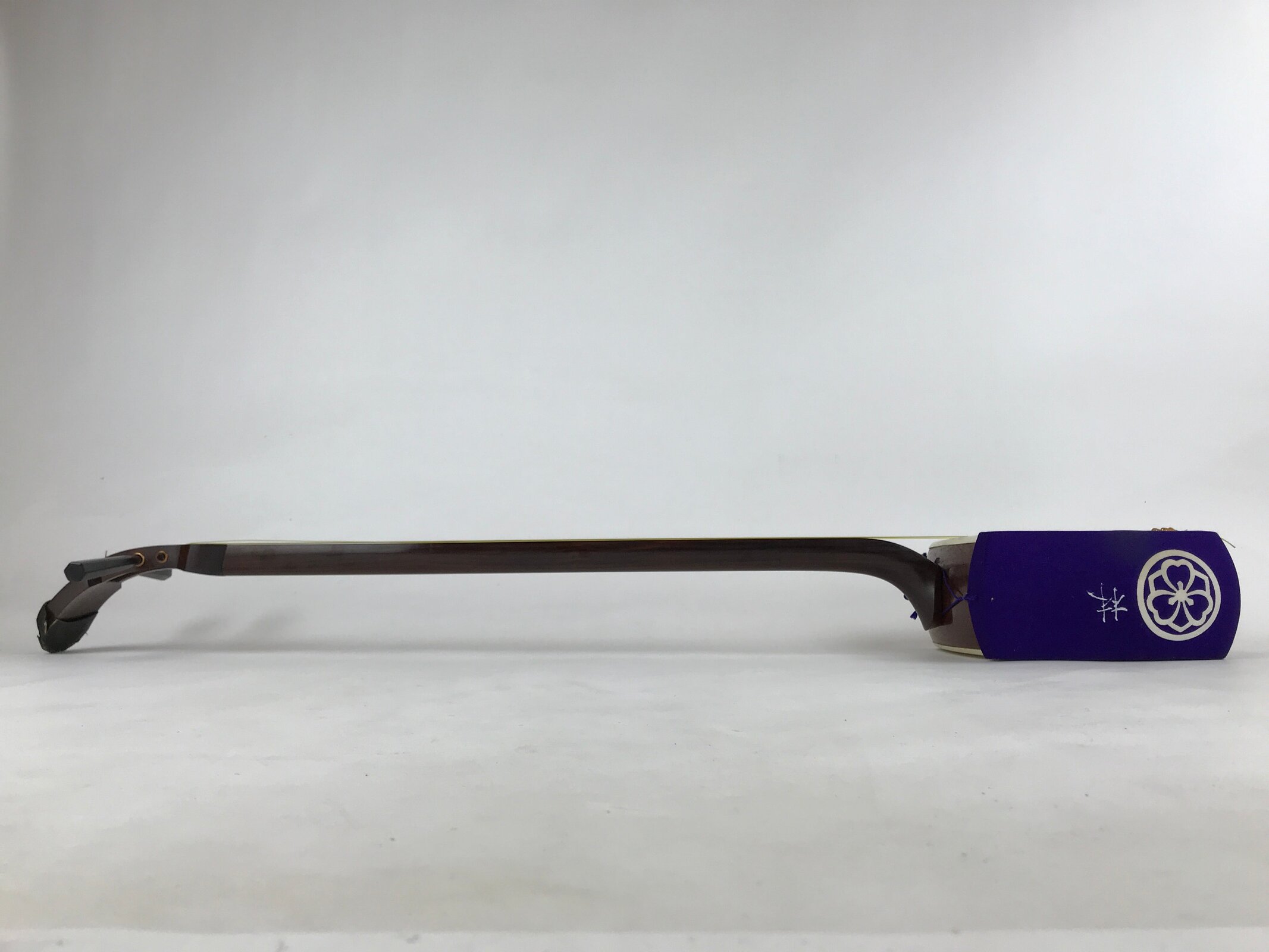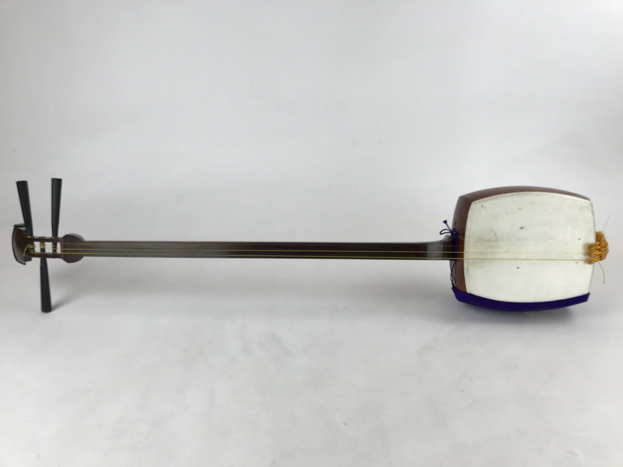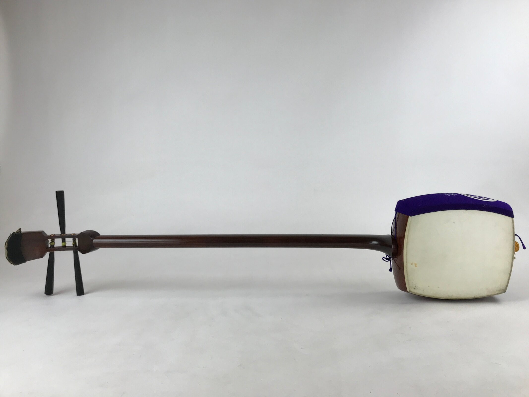 This is a Japanese traditional wooden instrument called a Shamisen. It is a plucked string instrument made from wood, animal skin, and fabric. This shamisen’s body and neck are in a beautiful dark brown color. The skin on the box is undamaged and ready to play.