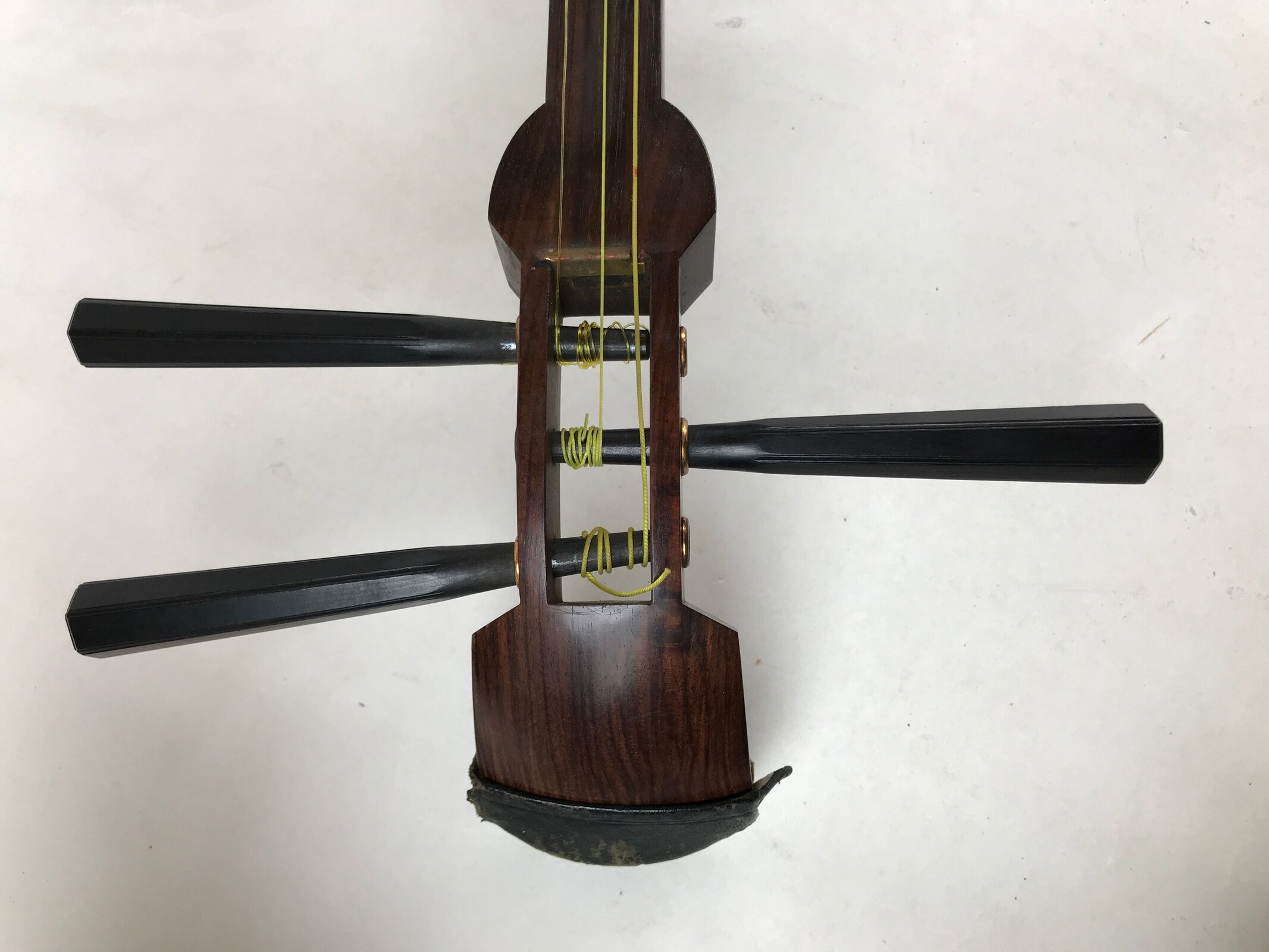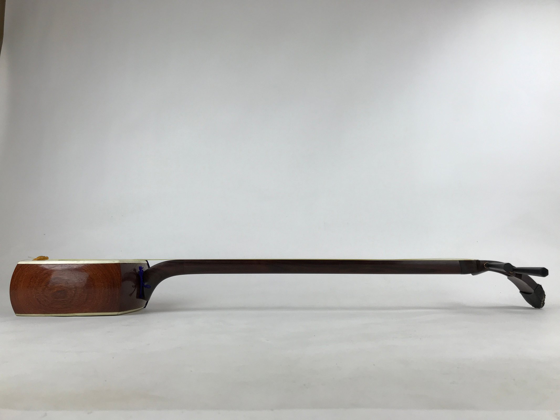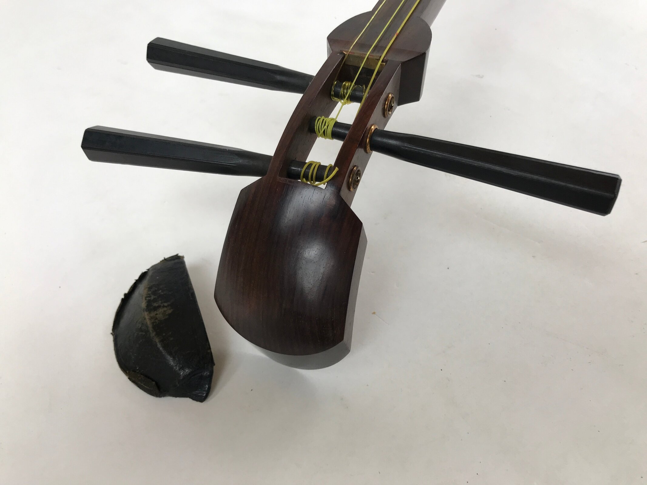 This is a Japanese traditional wooden instrument called a Shamisen. It is a plucked string instrument made from wood, animal skin, and fabric. This shamisen’s body and neck are in a beautiful dark brown color. The skin on the box is undamaged and ready to play.