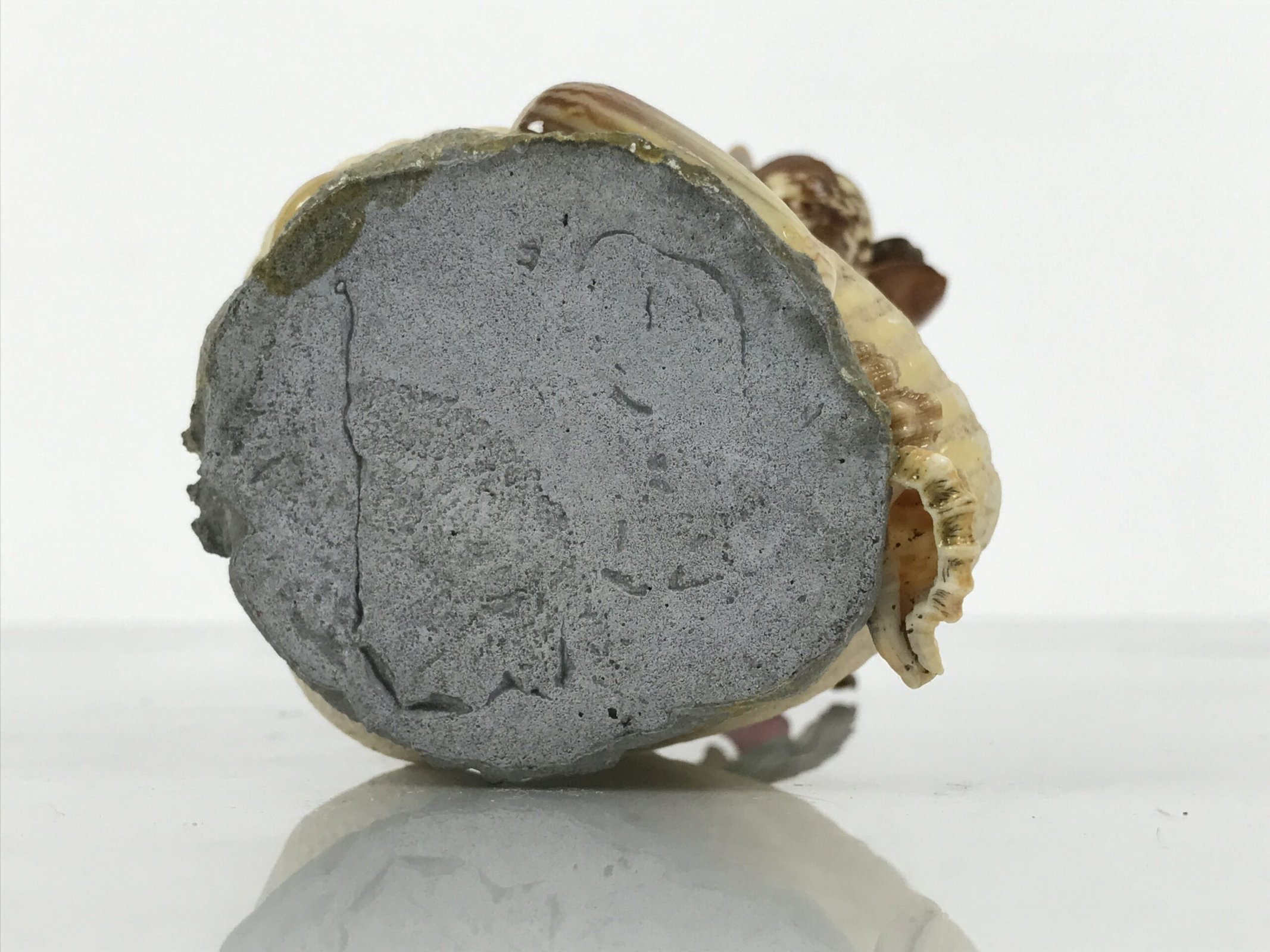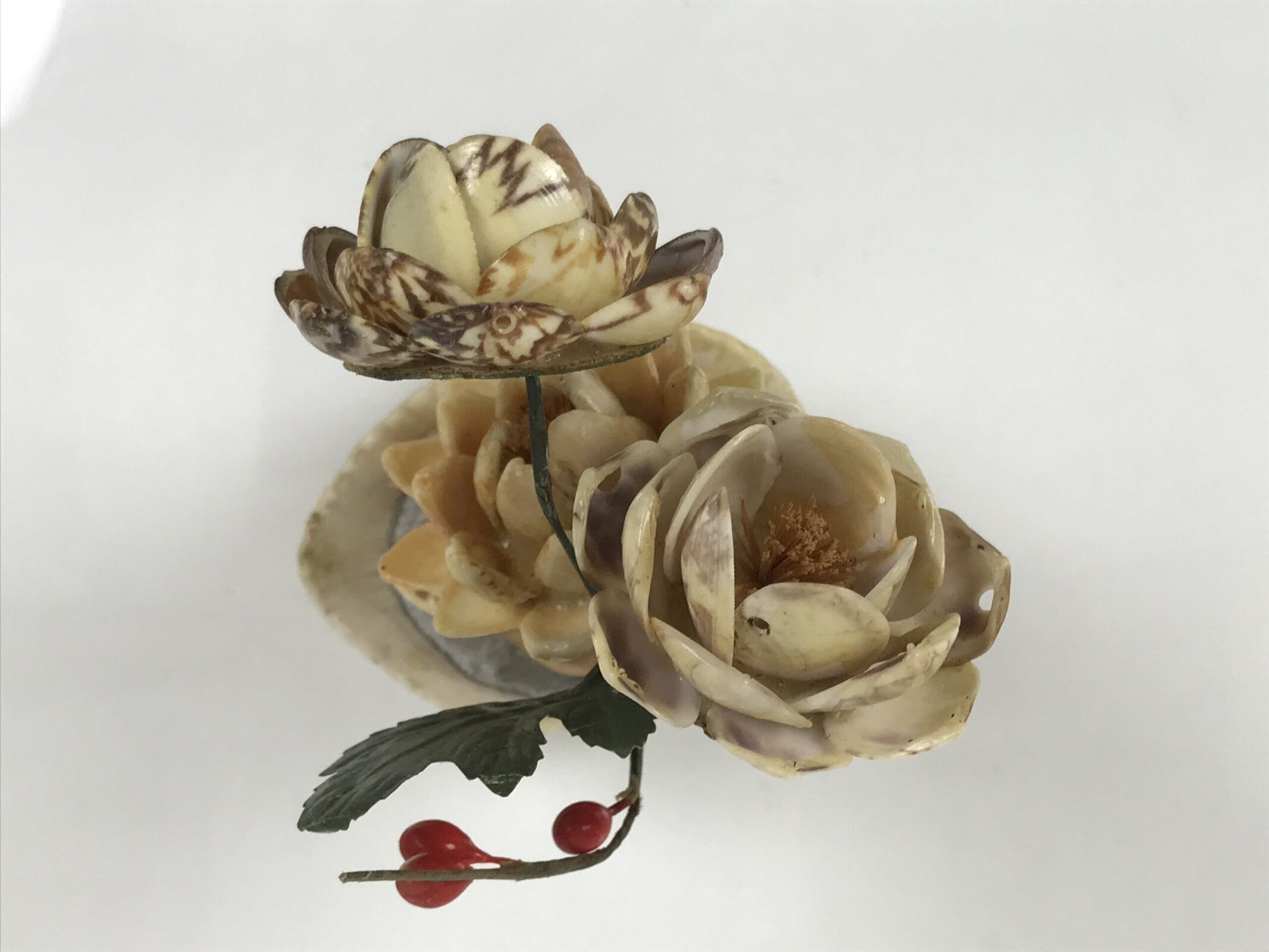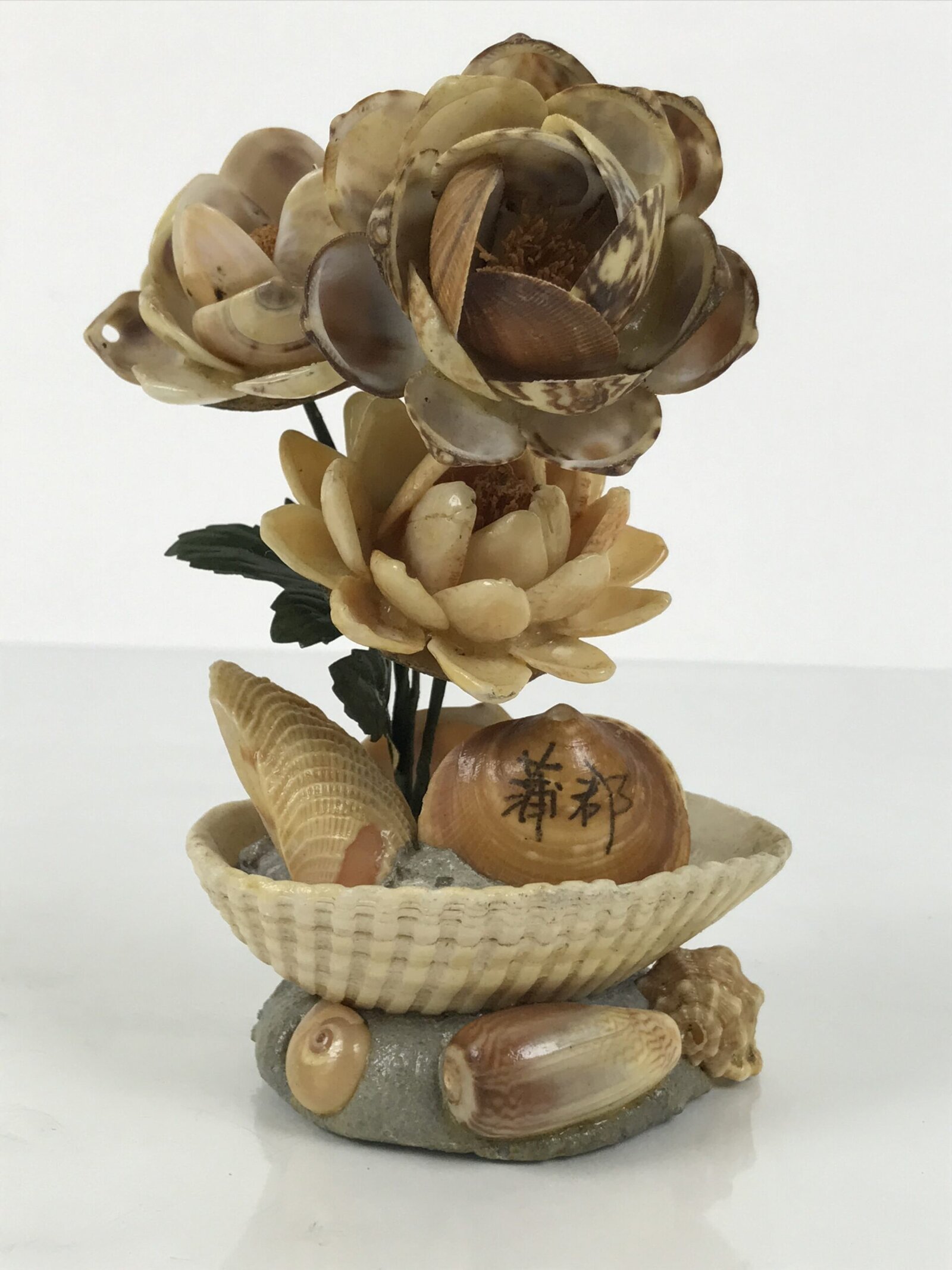 This vintage Japanese shell kokeshi figurine represents flowers in a pot. It is made from some types of clams for the petals, wires wrapped in green paper for the stems, and a larger clam for a pot. Other clams and shells are added as decoration. One clam has an inscription of a place name.
