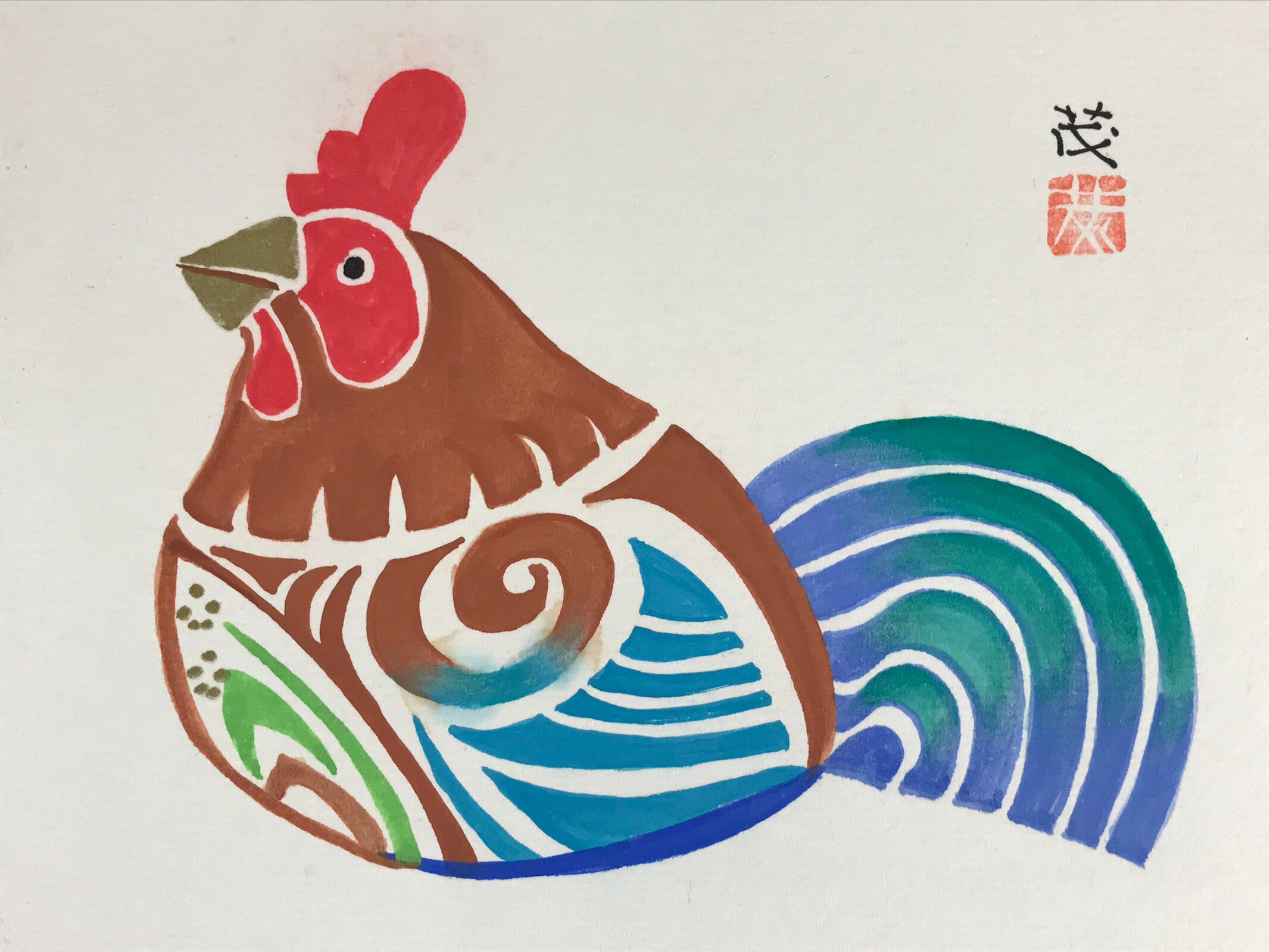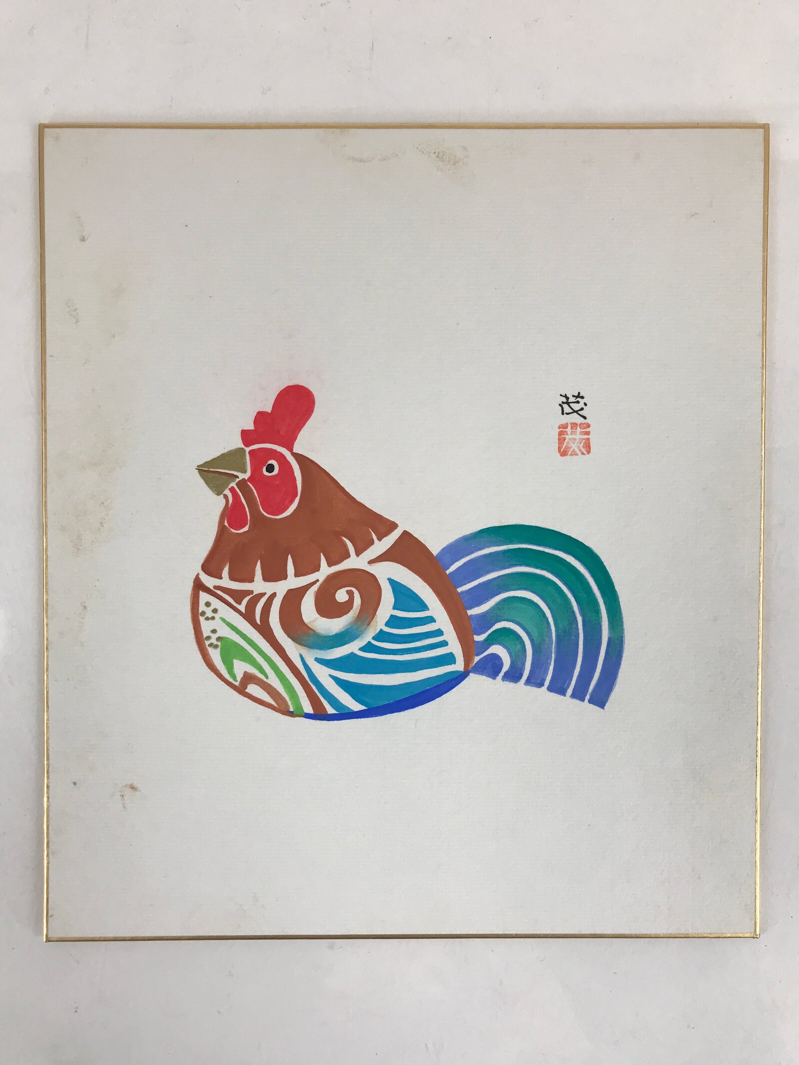 This is a vintage Japanese Shikishi-paper painted zodiac rooster. There are three basic types of shikishi paper—calligraphy (poem, haiku) only, calligraphy plus pictures, and pictures only. Since the Heian period, people have been writing waka and haiku on Shikishi paper (various sizes), but in the Meiji period, they started using paper of the current size. Recently, Shikishi paper is being used as paper to write autographs of celebrities.