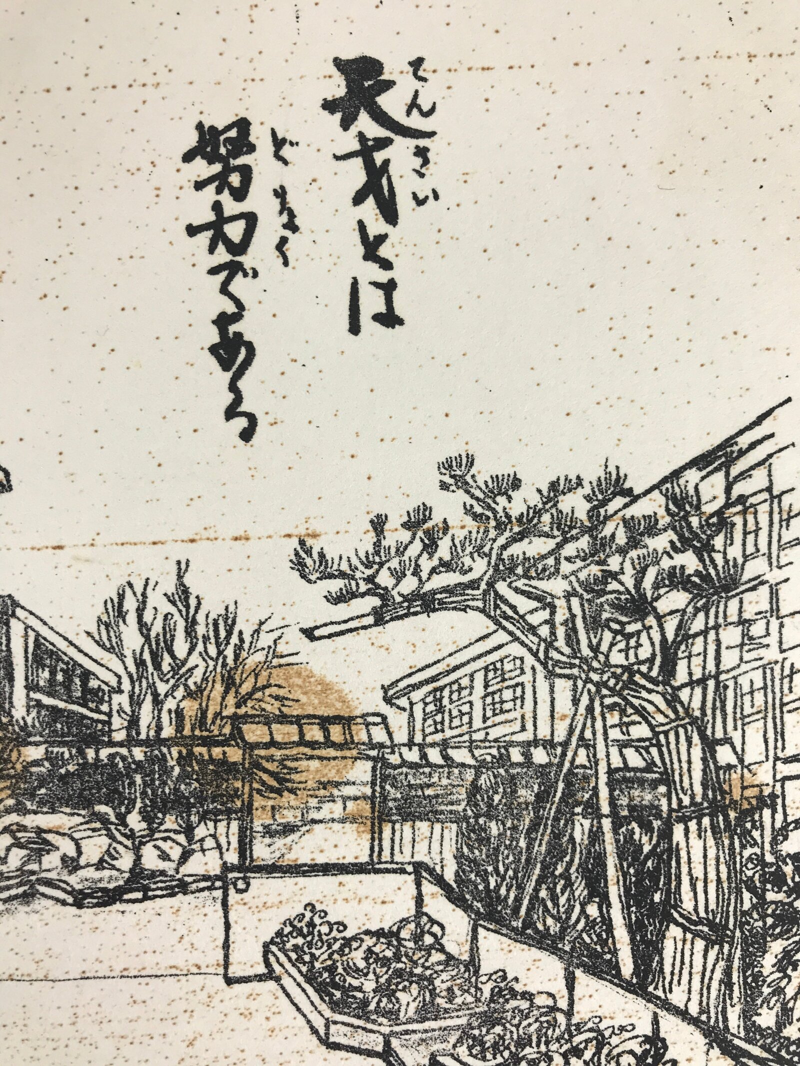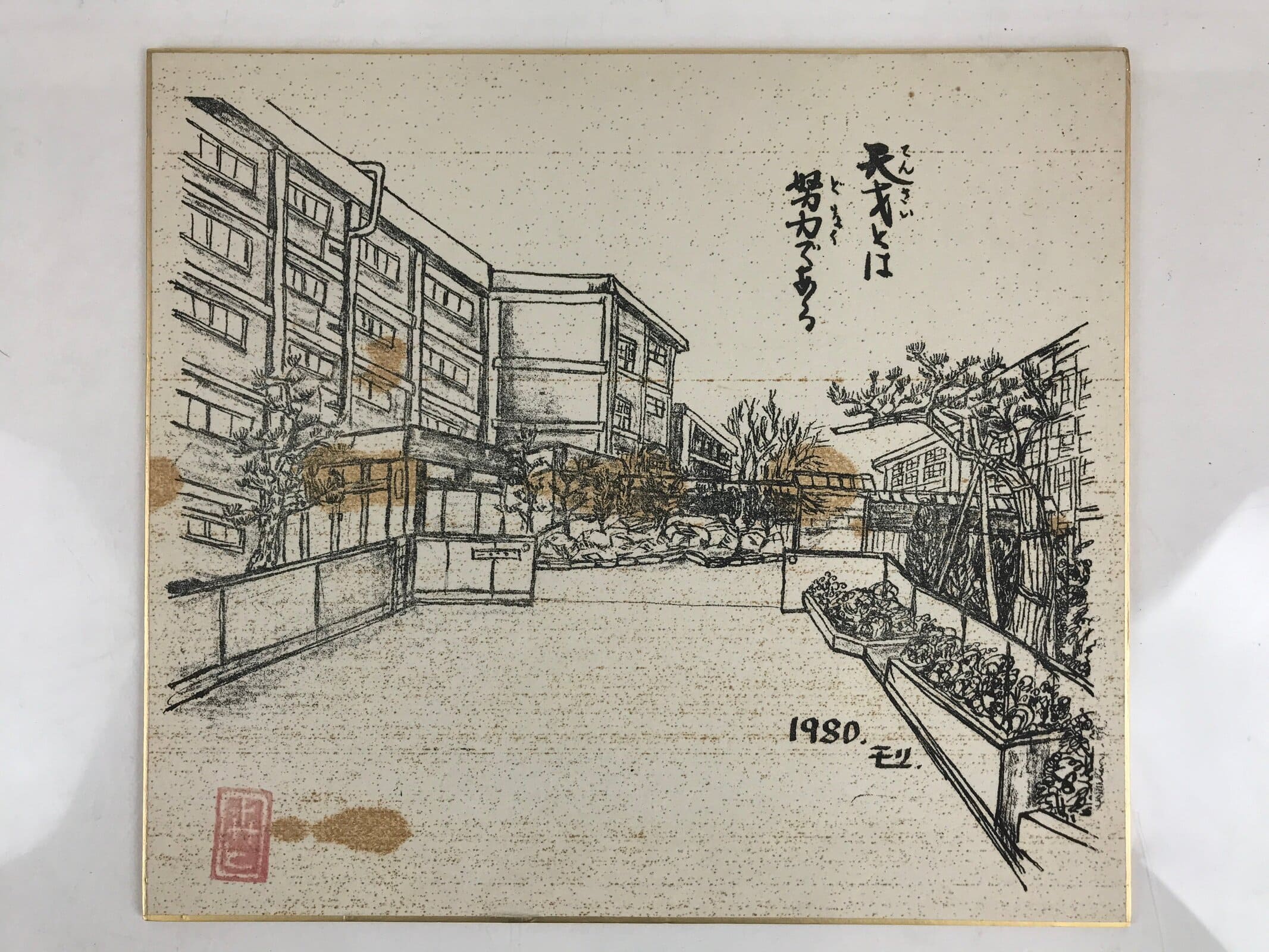 This is a vintage Japanese Shikishi paper (Artboard) printed school building and the words of the message. There are three basic types of shikishi paper—calligraphy (poem, haiku) only, calligraphy plus pictures, and pictures only. Since the Heian period, people have been writing waka and haiku on Shikishi paper (various sizes), but in the Meiji period, they started using paper of the current scope. Recently, Shikishi paper is being used as paper to write autographs of celebrities.