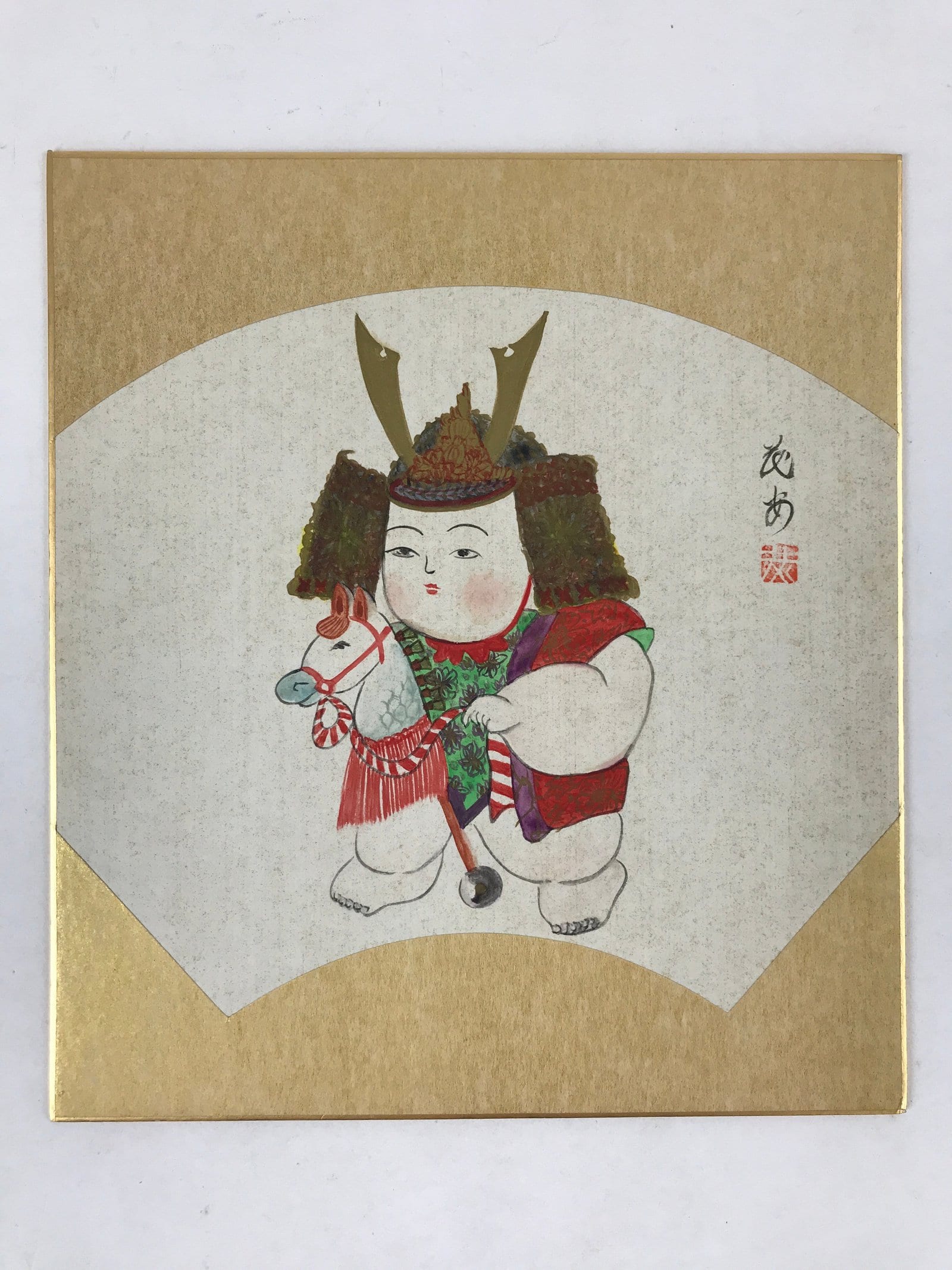 This item is a vintage shikishi art board. It features a hand-painted young boy wearing a kabuko helmet and playing with a horse toy. The illustration is colored with red and green and has several gold details. It is framed in a special shape surrounded by gold color paper. This shikishi art board is titled and signed with a red seal.