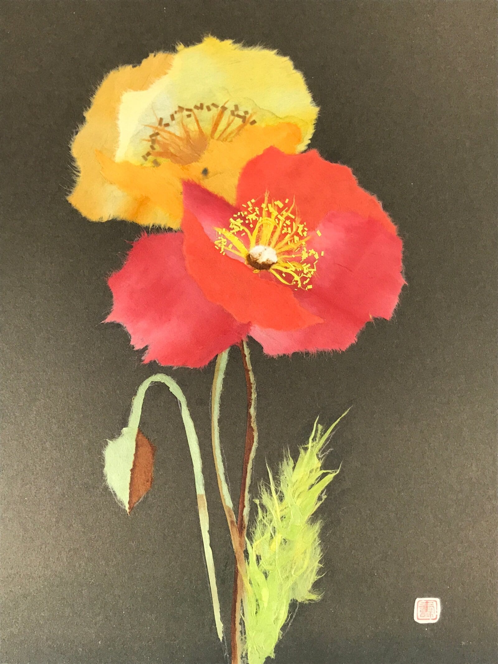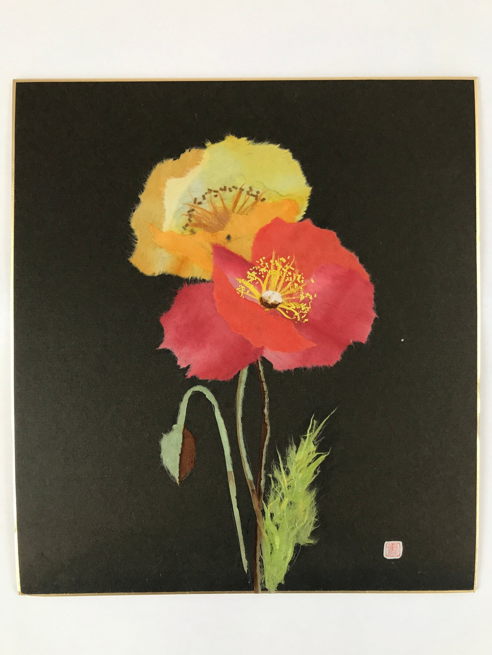 This item is a vintage Japanese shikishi art board. In the style of washi chigiri-e, a type of paper collage, this piece features yellow and red poppy flowers on a dark background. This piece is signed with a red seal.