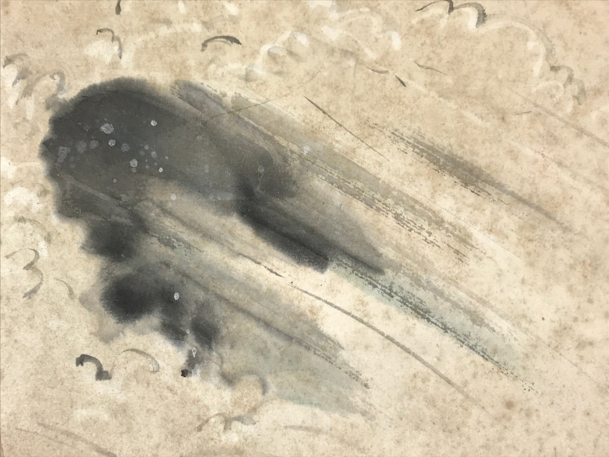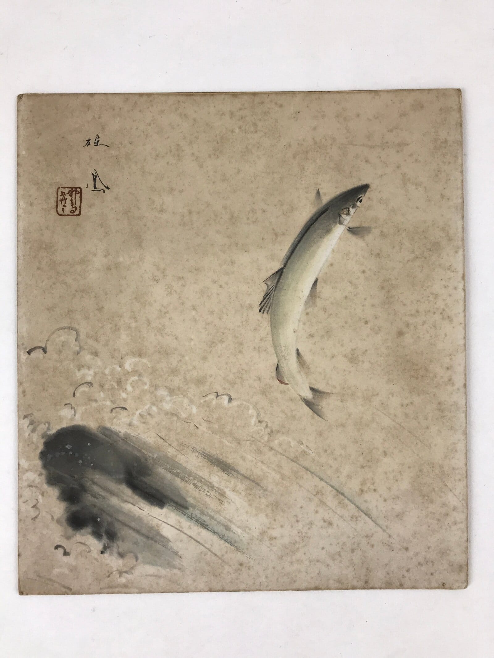 This item is a vintage shikishi art board. It features a hand-painted jumping fish with rapids. It is paited with gray, black, white and a touch of yellow and red. This shikishi art board is titled and signed.