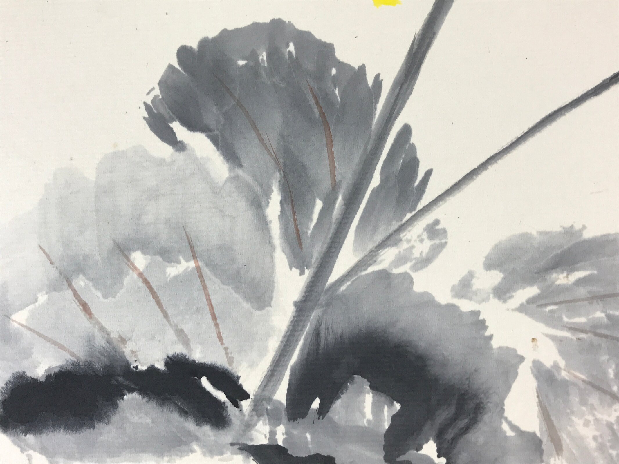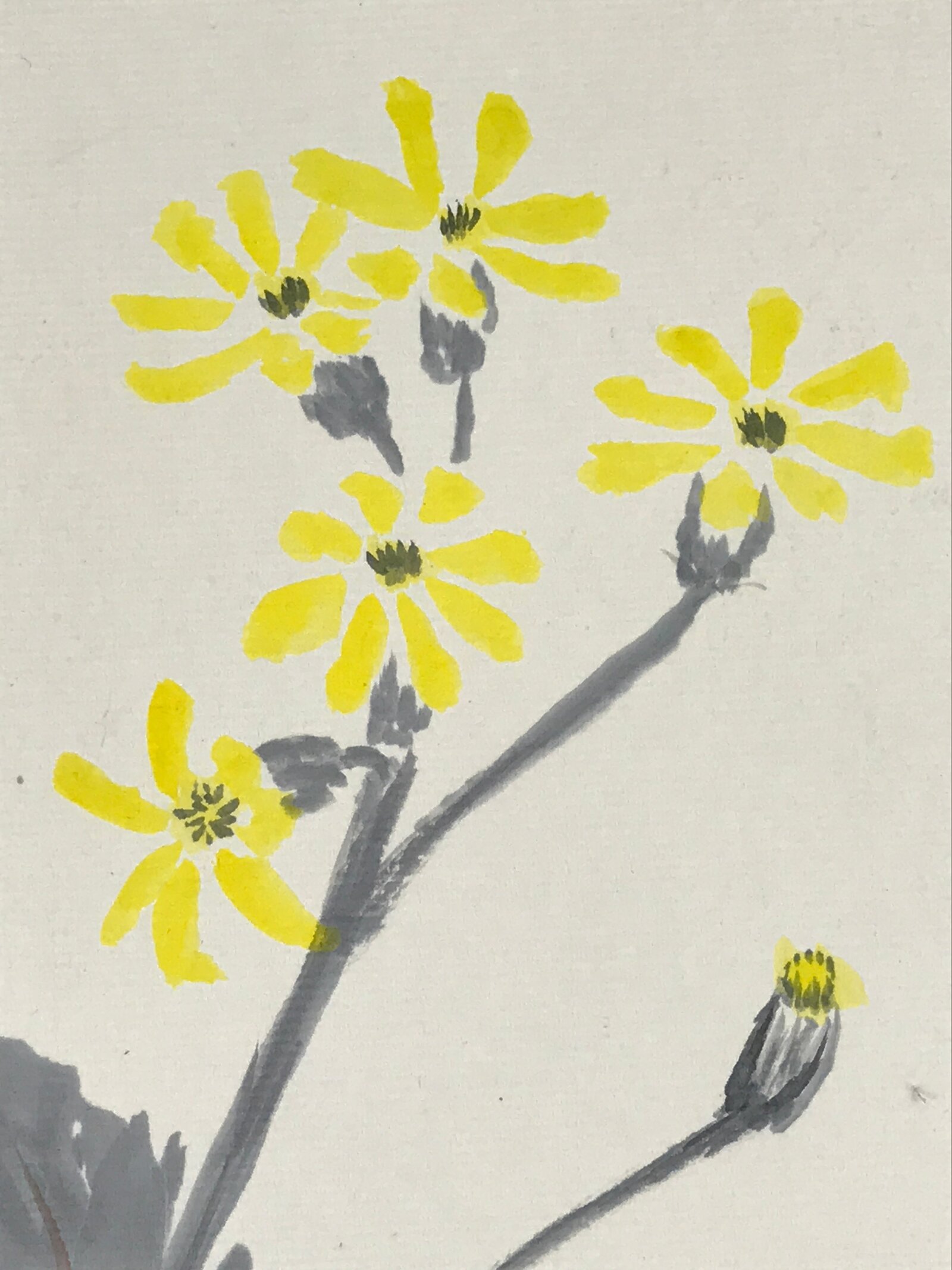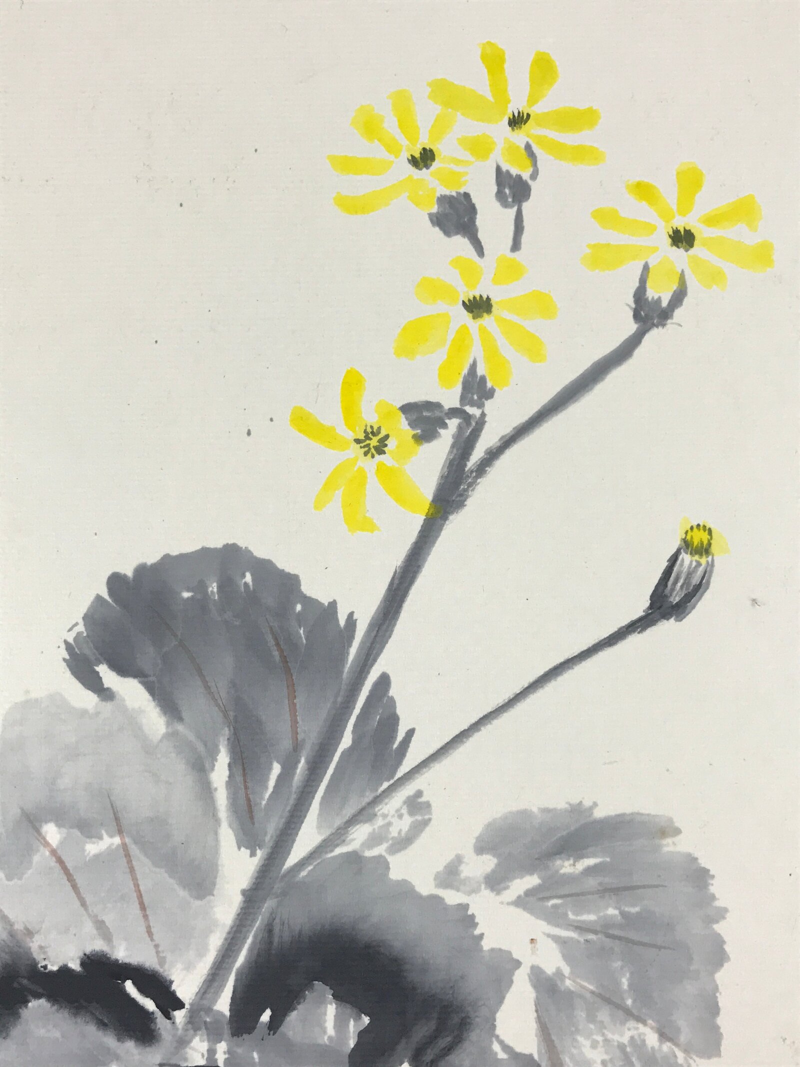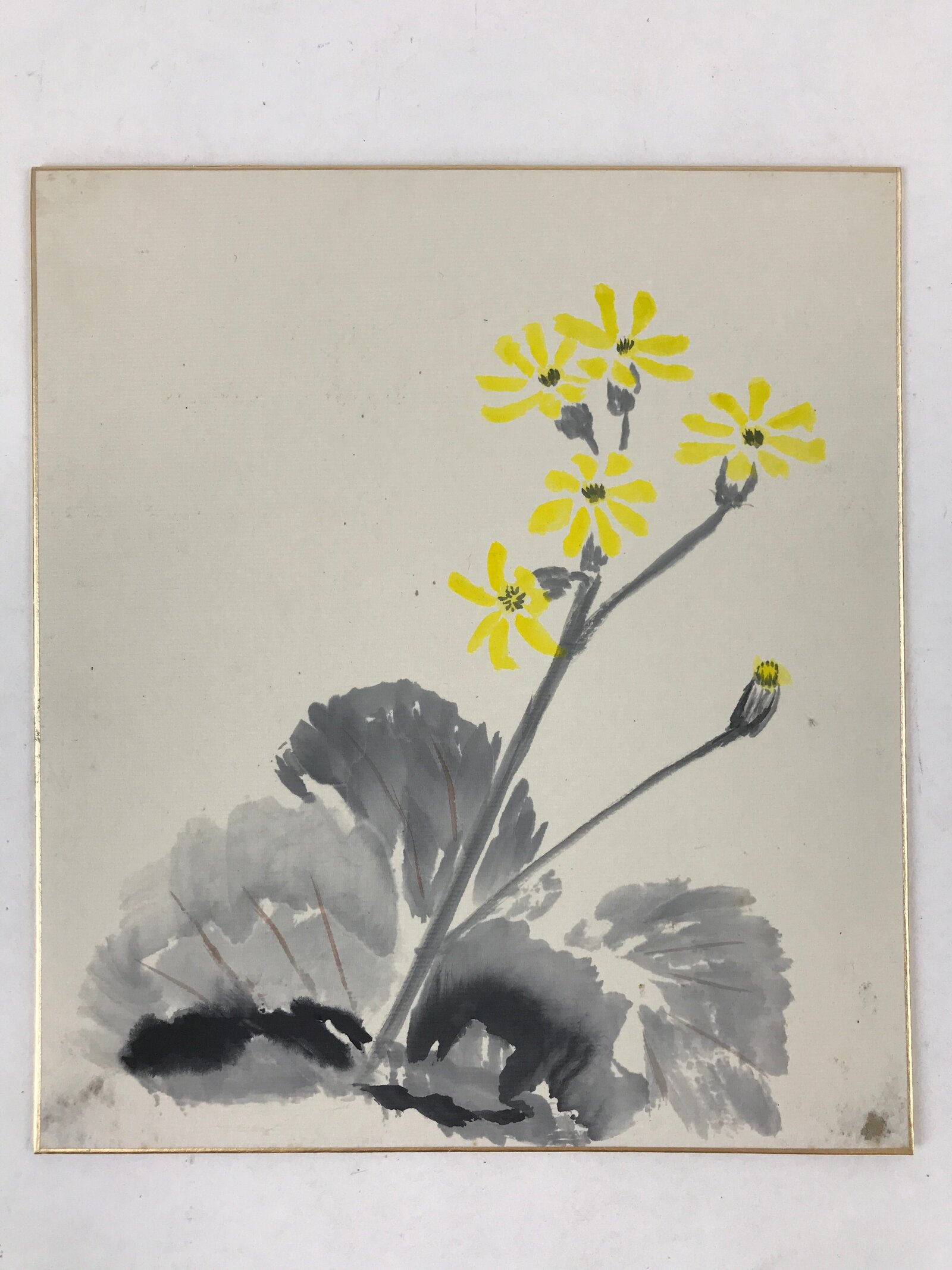 This item is a vintage shikishi art board. It features a hand-painted cluster of leopard plants with yellow blooms (tsuwabuki). It has grayscale leaves on a white background.
