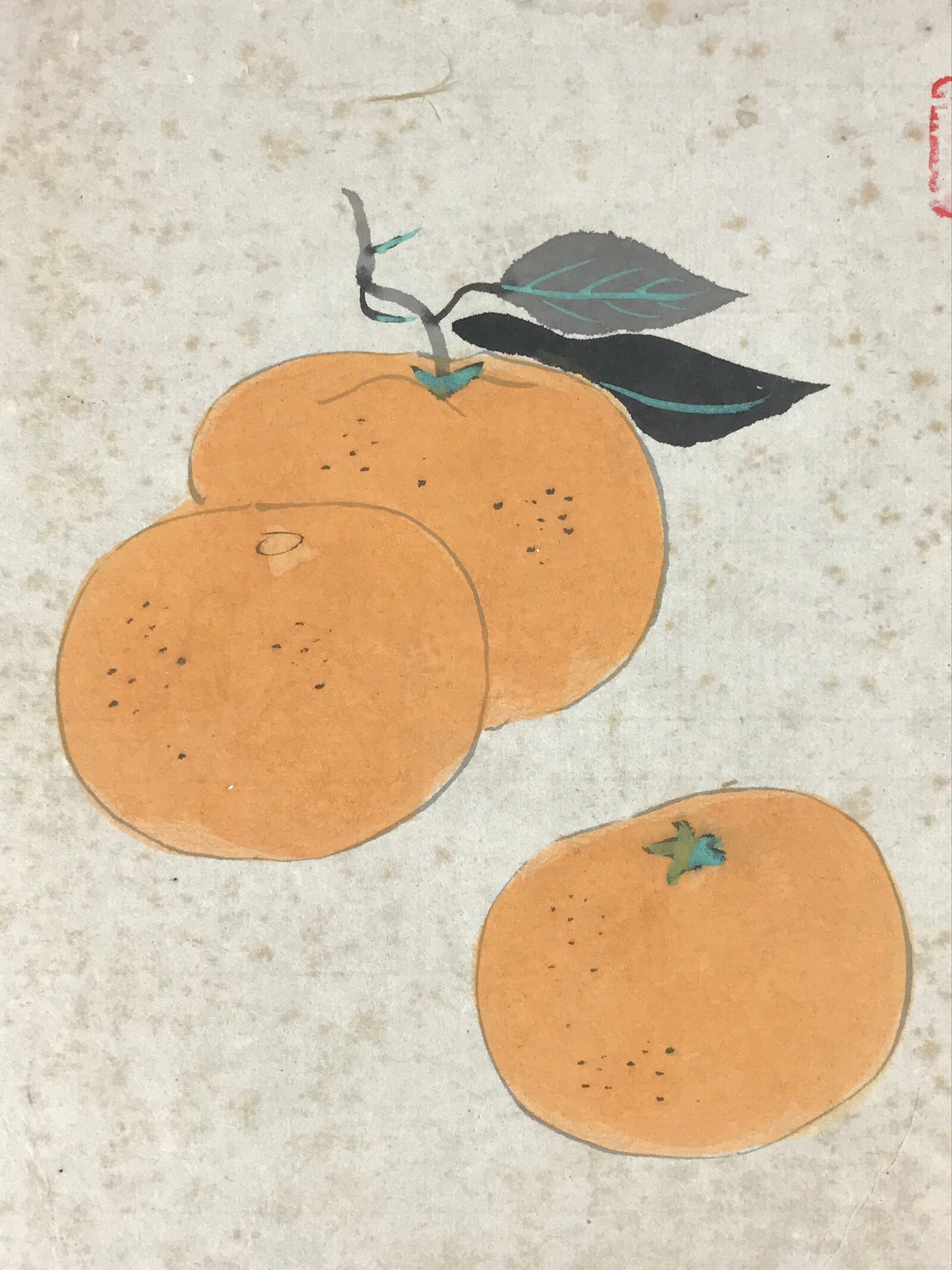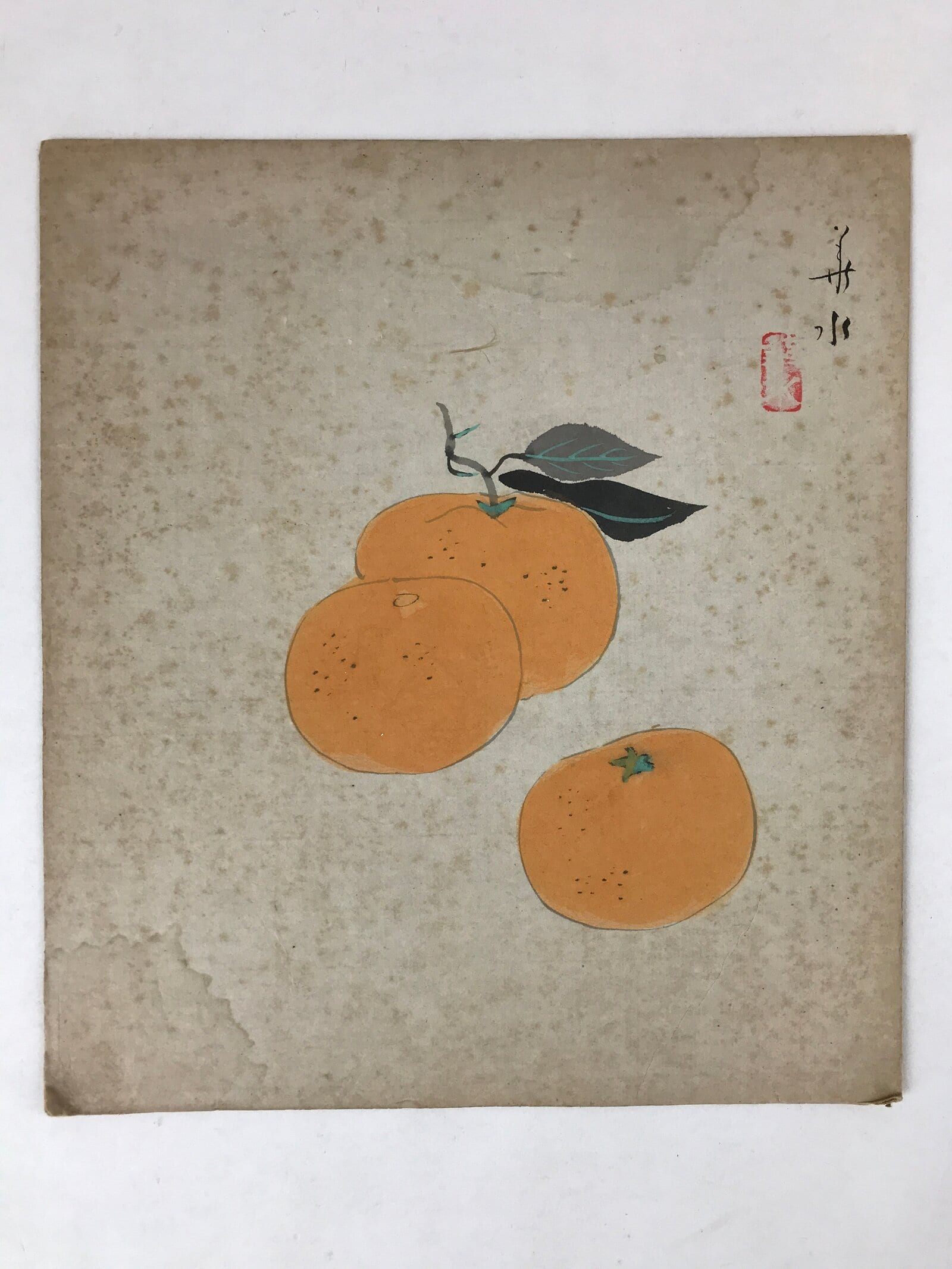 This item is a vintage Japanese zodiac shikishi art board. It is hand-painted and features three oranges. This shikishi art board is signed.