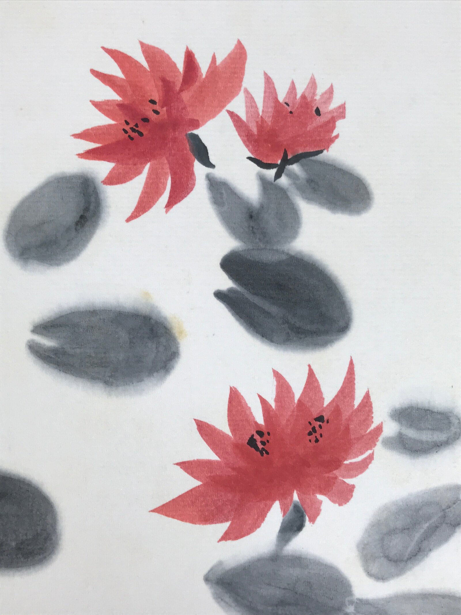 This vintage Japanese shikishi hand-painted art board features lotus flowers and leaves in red and black. The vague outlines of leaves seem to describe them floating on water, and a lot of blank behind the painting might mean calm water. This shikishi has writing and is signed with a red seal.