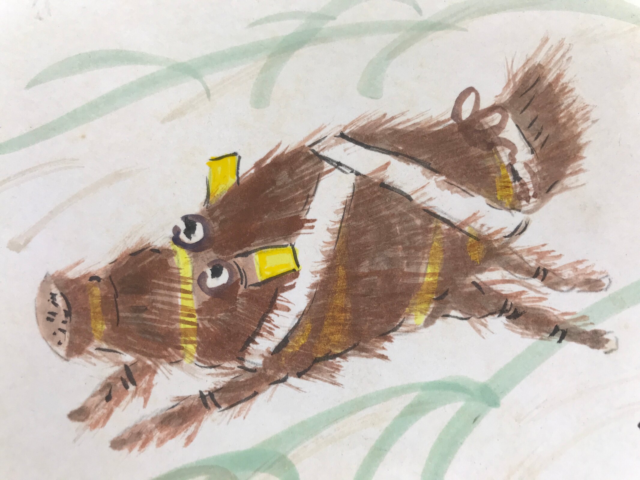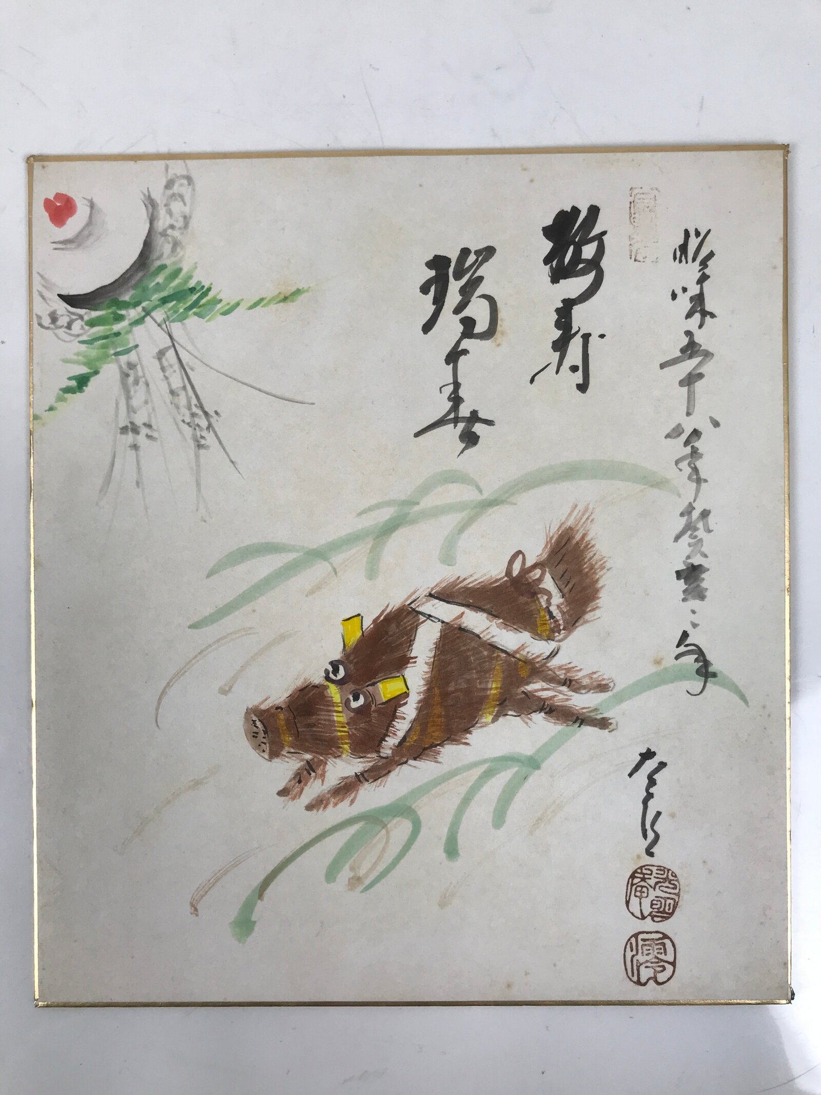 This vintage Japanese shikishi hand-painted art board represents a wild boar running over a green field with some Kanji letters. This is a painting of the year’s zodiac. This piece is signed with names and red seals.