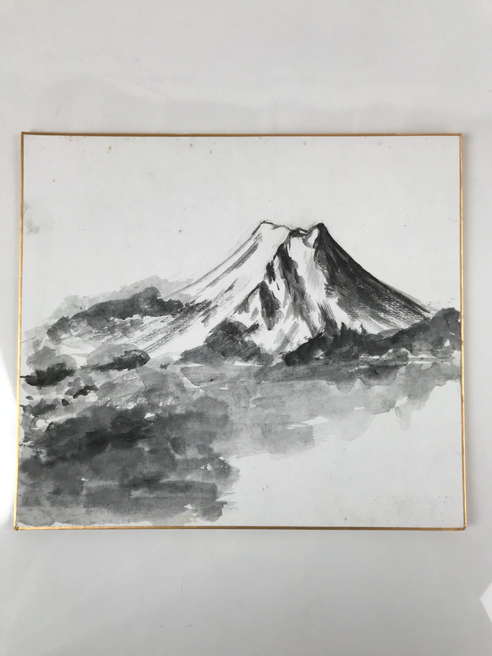 This is a vintage Japanese shikishi art board painted with a classic black and white landscape of Mt. Fuji.