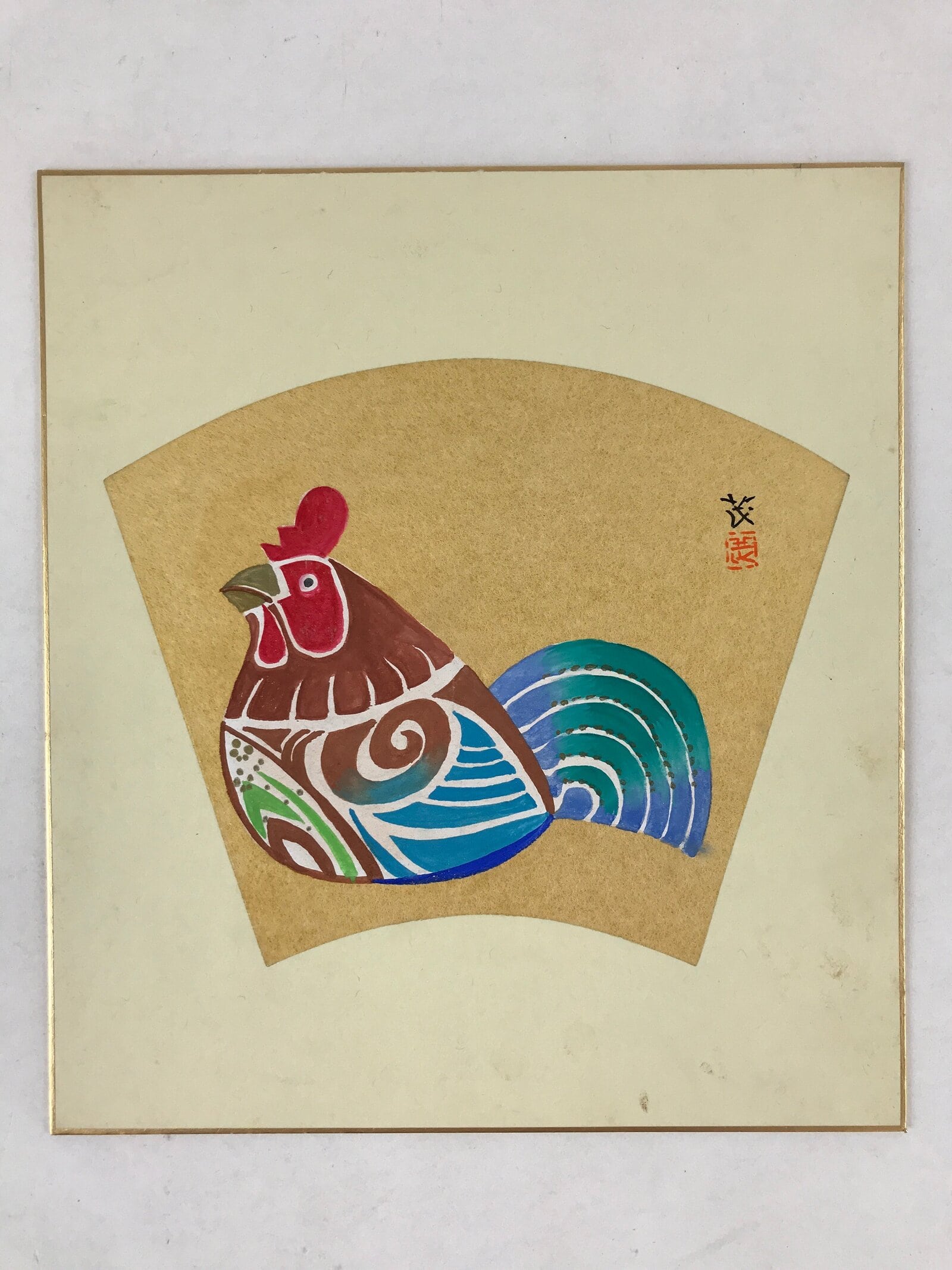 This item is a vintage Japanese zodiac shikishi art board. It is hand-painted and features a colorful rooster painted in a cute style. The rooster is painted in brown, red, blue and green with some gold details. The illustration is painted on a gold color shape. This shikishi art board is signed.