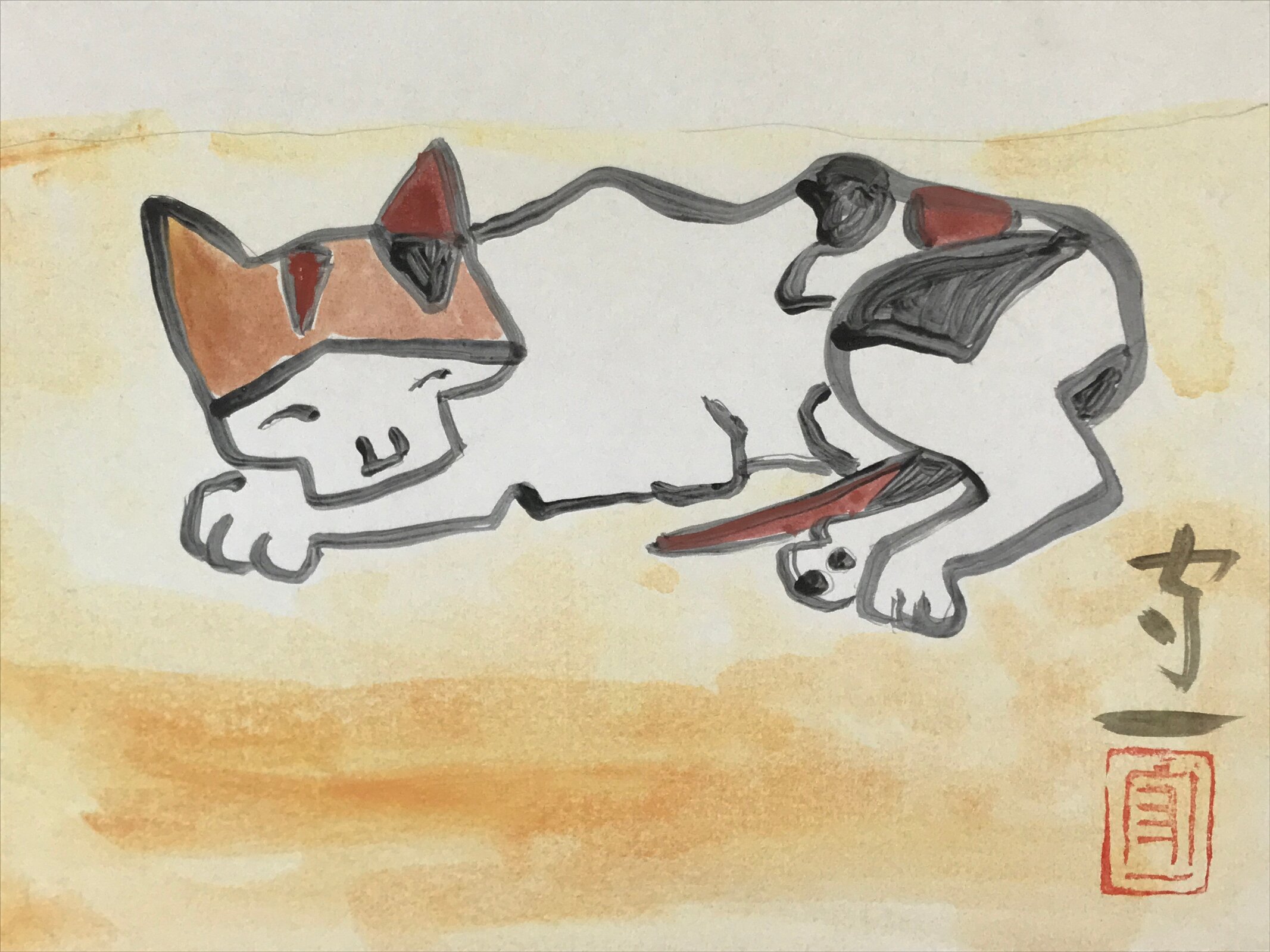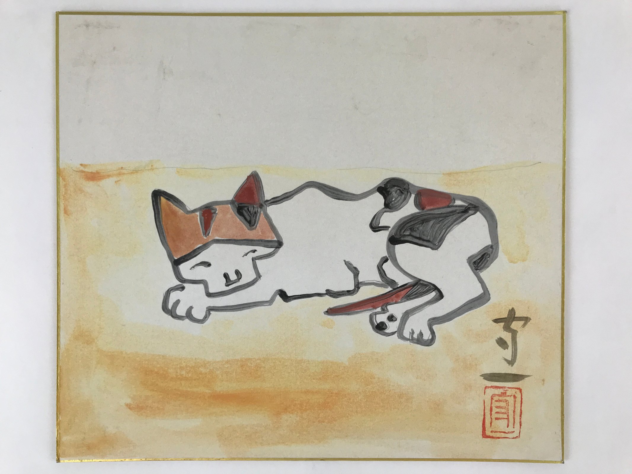 This is a Japanese shikishi art board representing a sleeping cat. The cat is white, orange and brown. The background is light brown. This handpainted shikishi art board is sign on the bottom right and on the back.