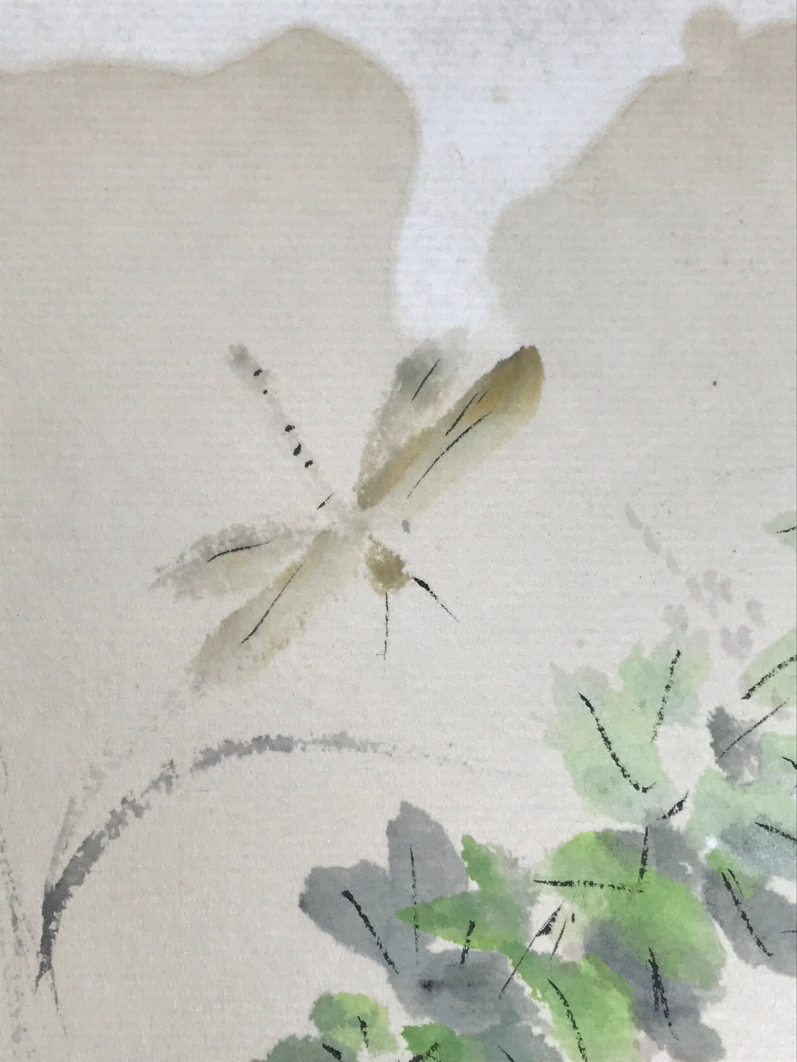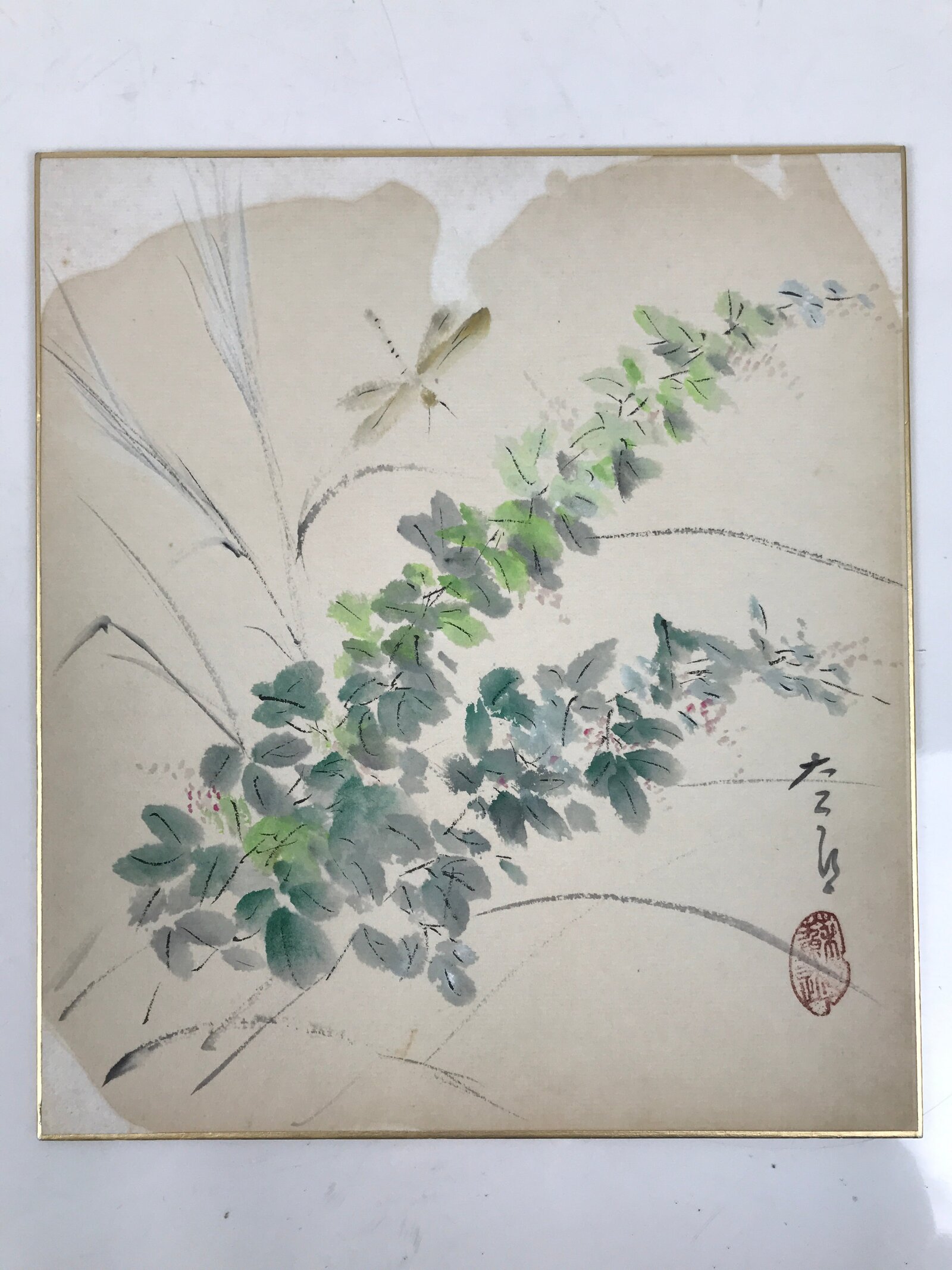 This vintage Japanese shikishi hand-painted art board represents plants with tiny round leaves painted in green and a flying dragonfly. It depicts the nature in Summer. This piece is signed with a name and a red seal. It has a date (likely) on the back.