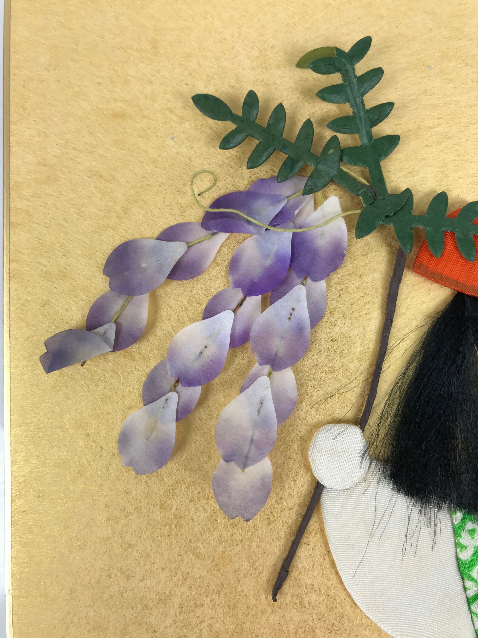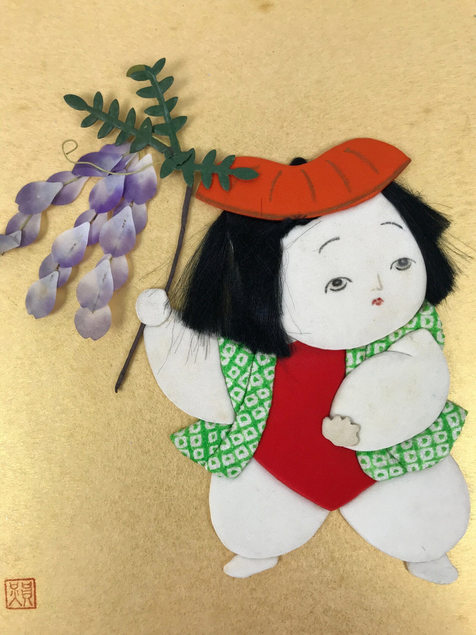 This vintage Japanese shikishi art board features an oshie-zaiku (Japanese patchwork) design of a Gosho Ningyo (palace doll). These dolls with iconic chubby cheeks and child-like appearance were originally distributed within the Imperial Court in Kyoto as a highly prized gift that represents prosperity and luck. This particular character wears a flat hat and carries a branch of what appears to be wisteria. Oshie-zaiku gives a unique 3D appearance, and different textures and patterns of silk fabric, and the addition of hair and other materials adds extra dimension.