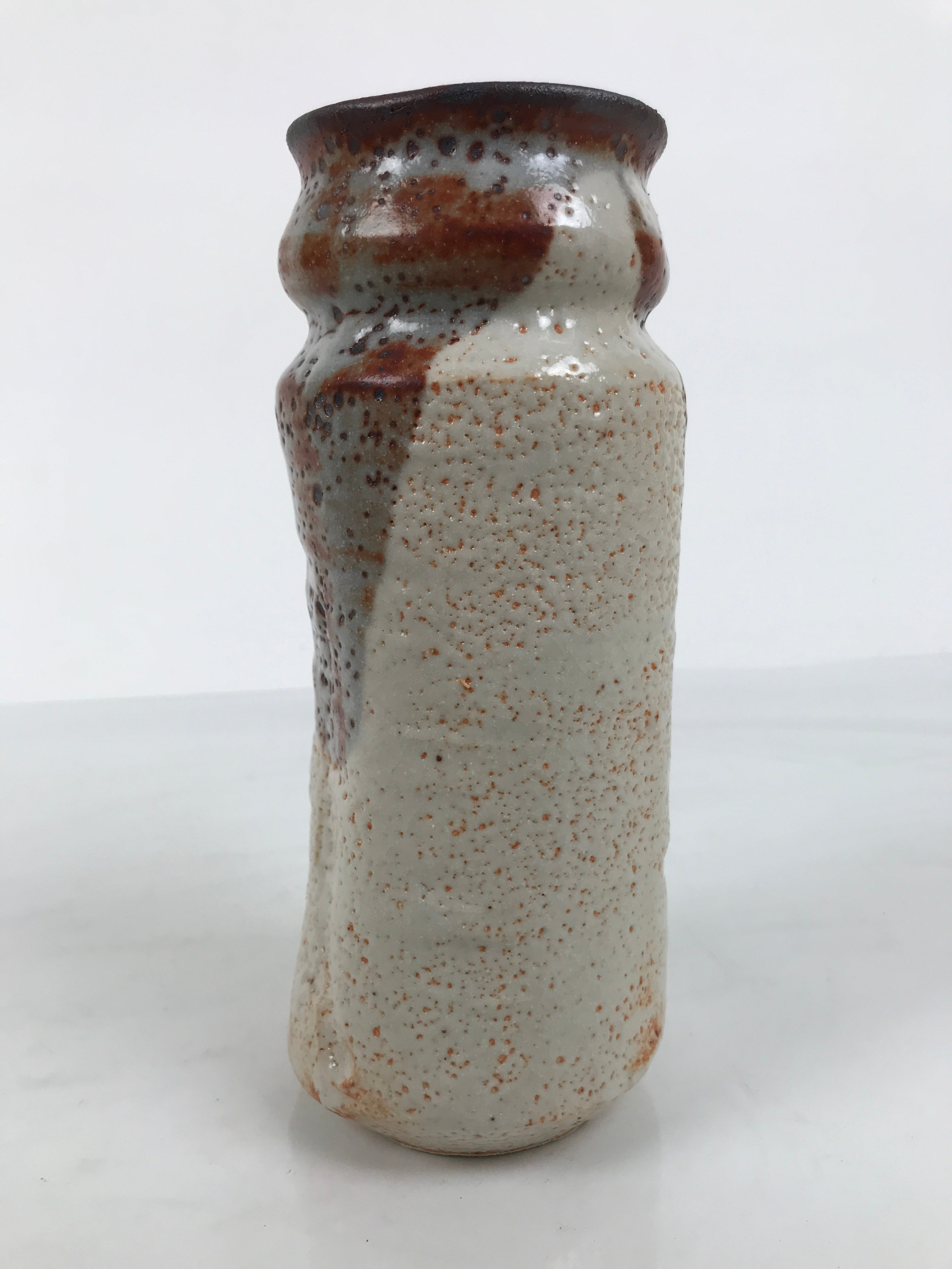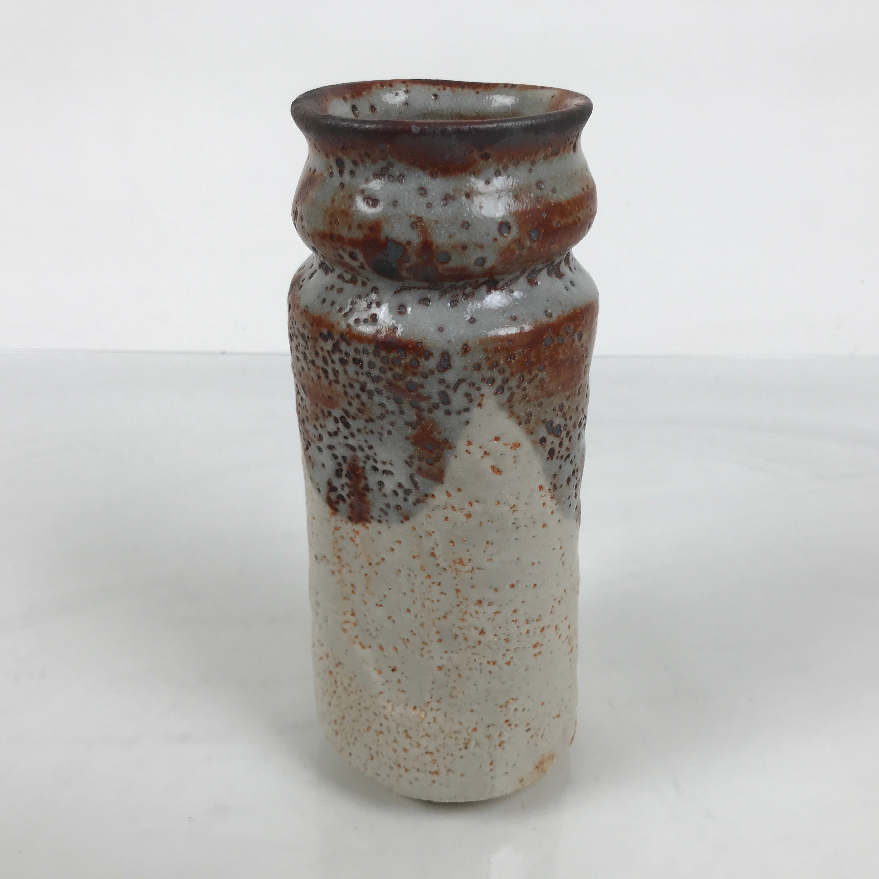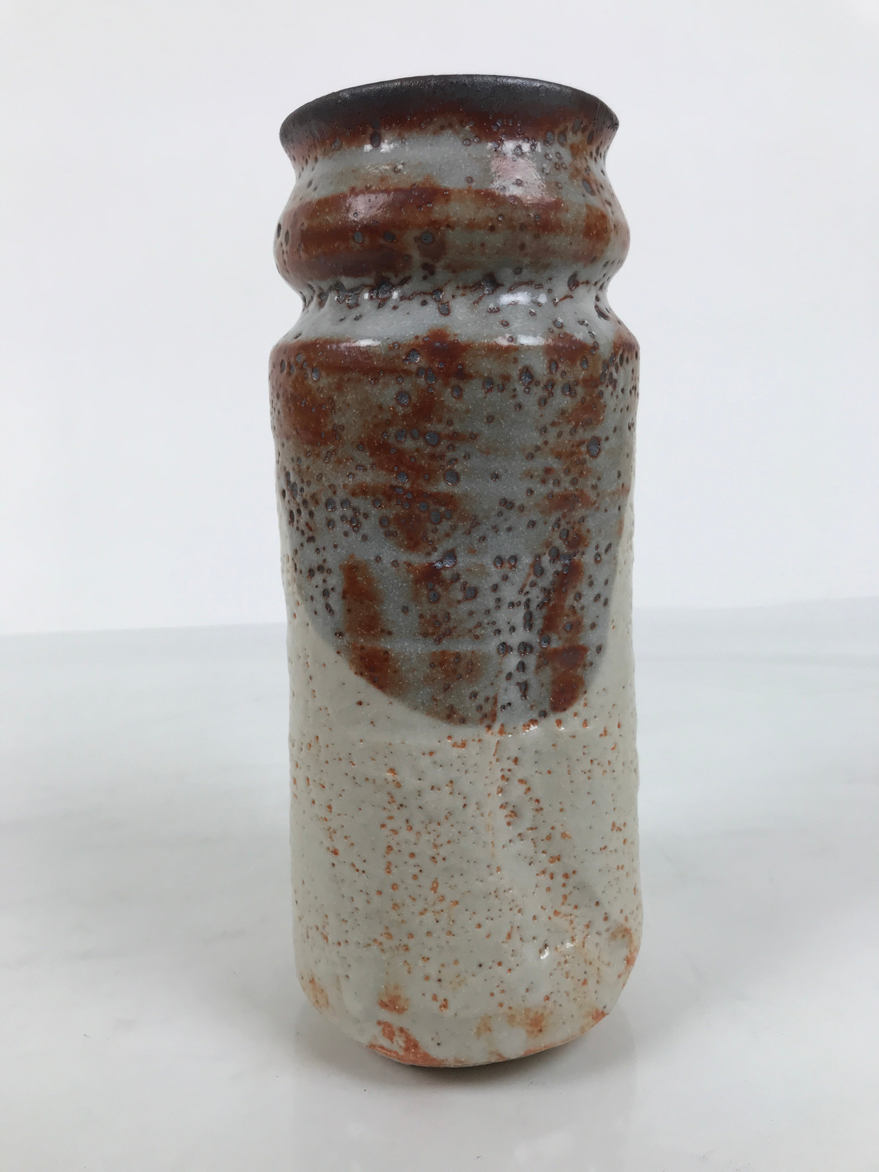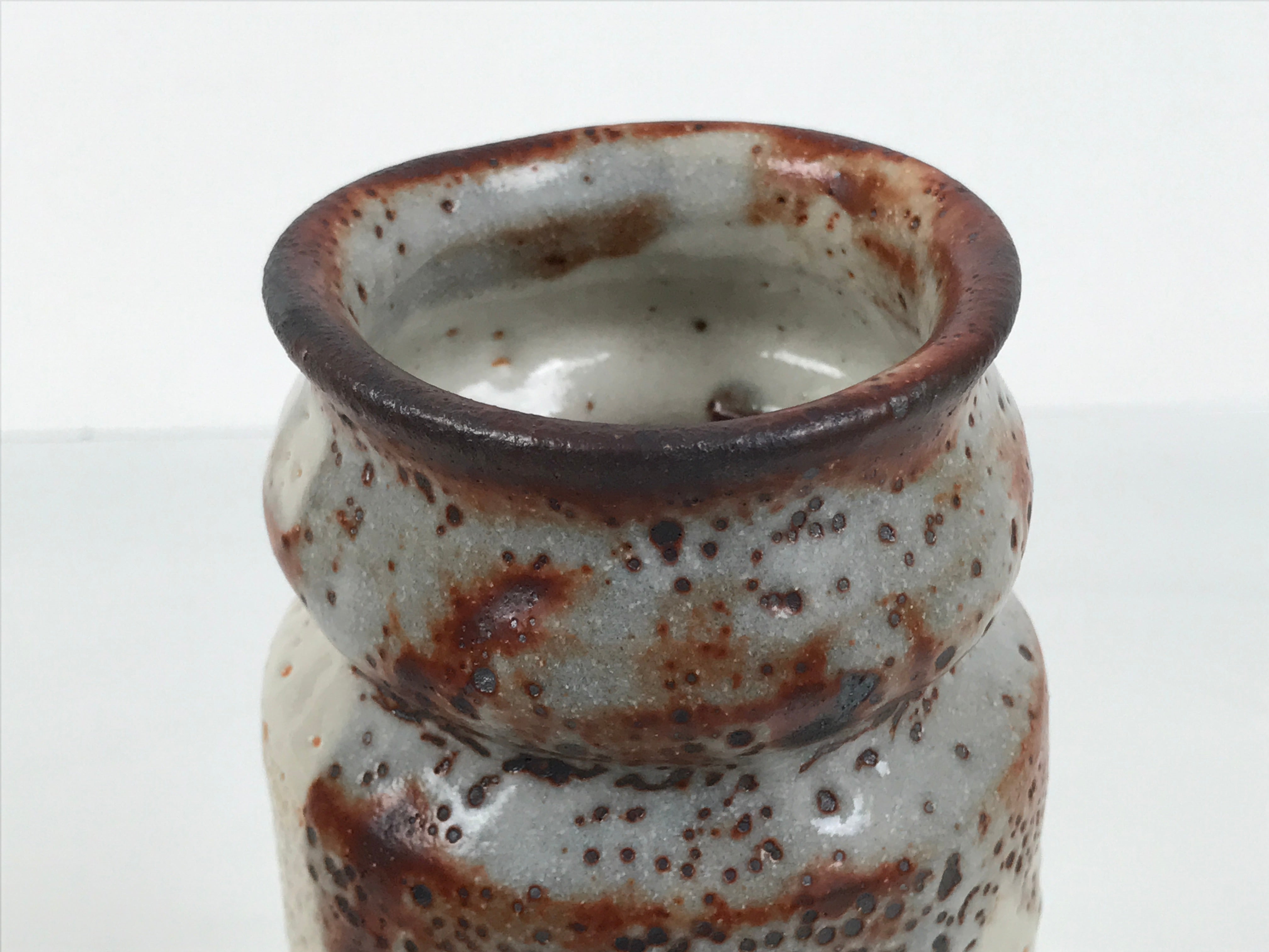 This is a vintage Japanese ceramic flower vase, also called kabin or hanaire in Japanese. This bowl is in the Shino ware style, a type of Mino ware. It has a white underglaze and a gray and brown dripping top glaze. The base and the top glaze make a textured surface. It is sturdy and easy to handle thanks to its design: a cylinder slightly bent inwards on the sides. It is wrapped and cased in a wooden box. This vase can be used for Ikebana or other floral arrangements. It is a beautiful item that can be displayed as decor.