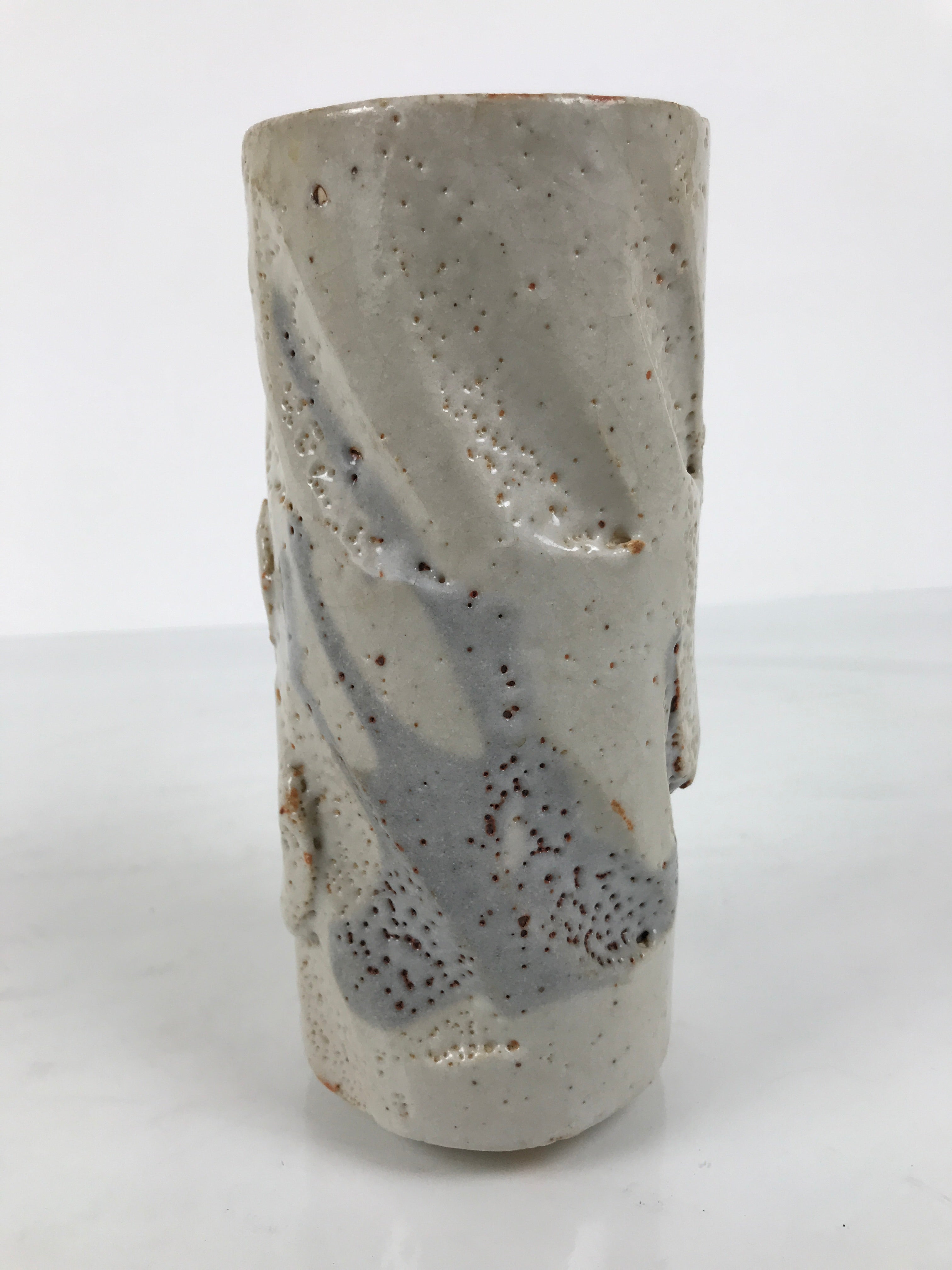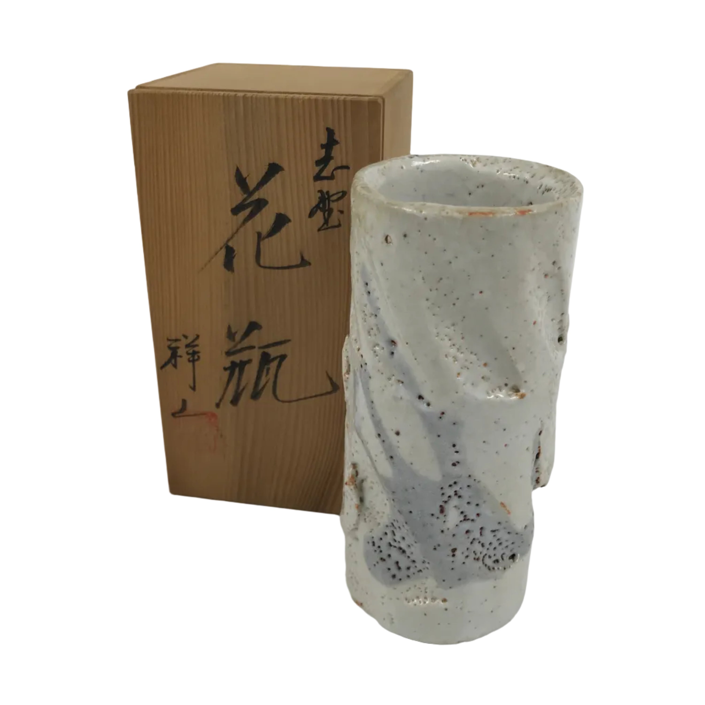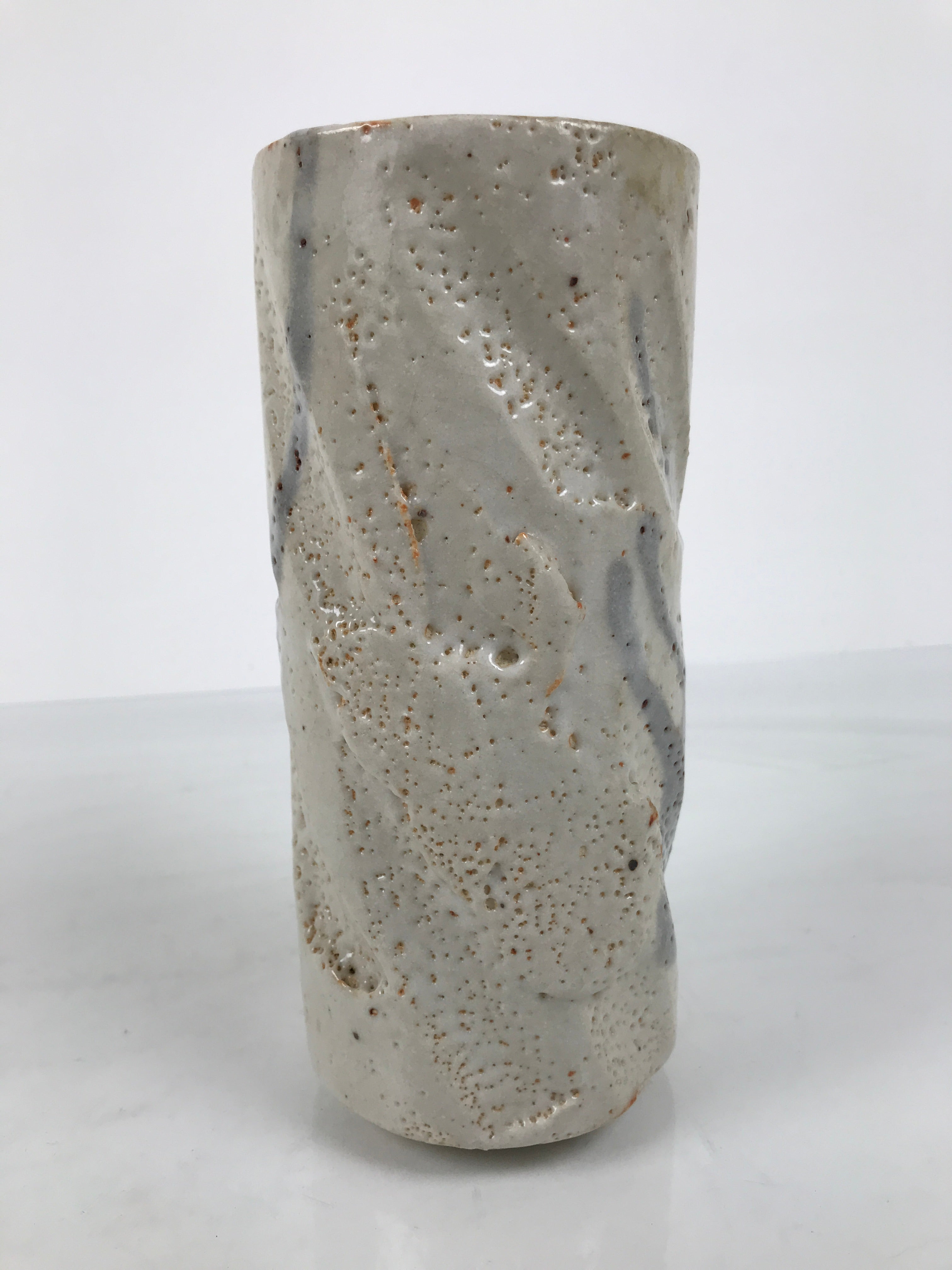 This is a vintage Japanese ceramic flower vase, also called kabin or hanaire in Japanese. This vase is in the Nezumi Shino ware style, a type of Mino ware. It has a gray textured glaze with black lined details. It is sturdy and easy to handle thanks to its design: a cylinder with deep and large carvings. This vase has an inscription on the bottom. It is wrapped and cased in a wooden box. This vase can be used for Ikebana or other floral arrangements. It is a beautiful item that can be displayed as decor.