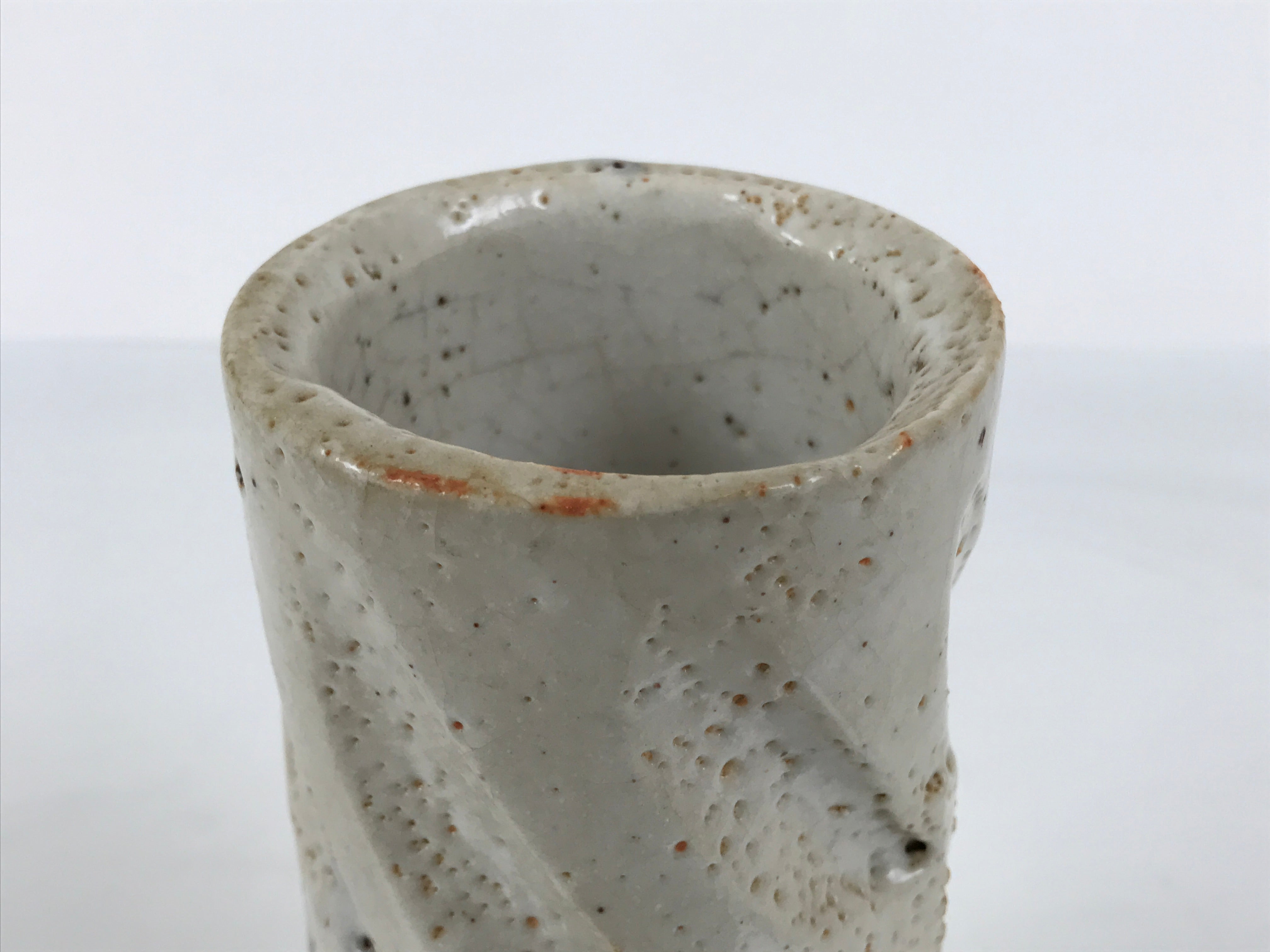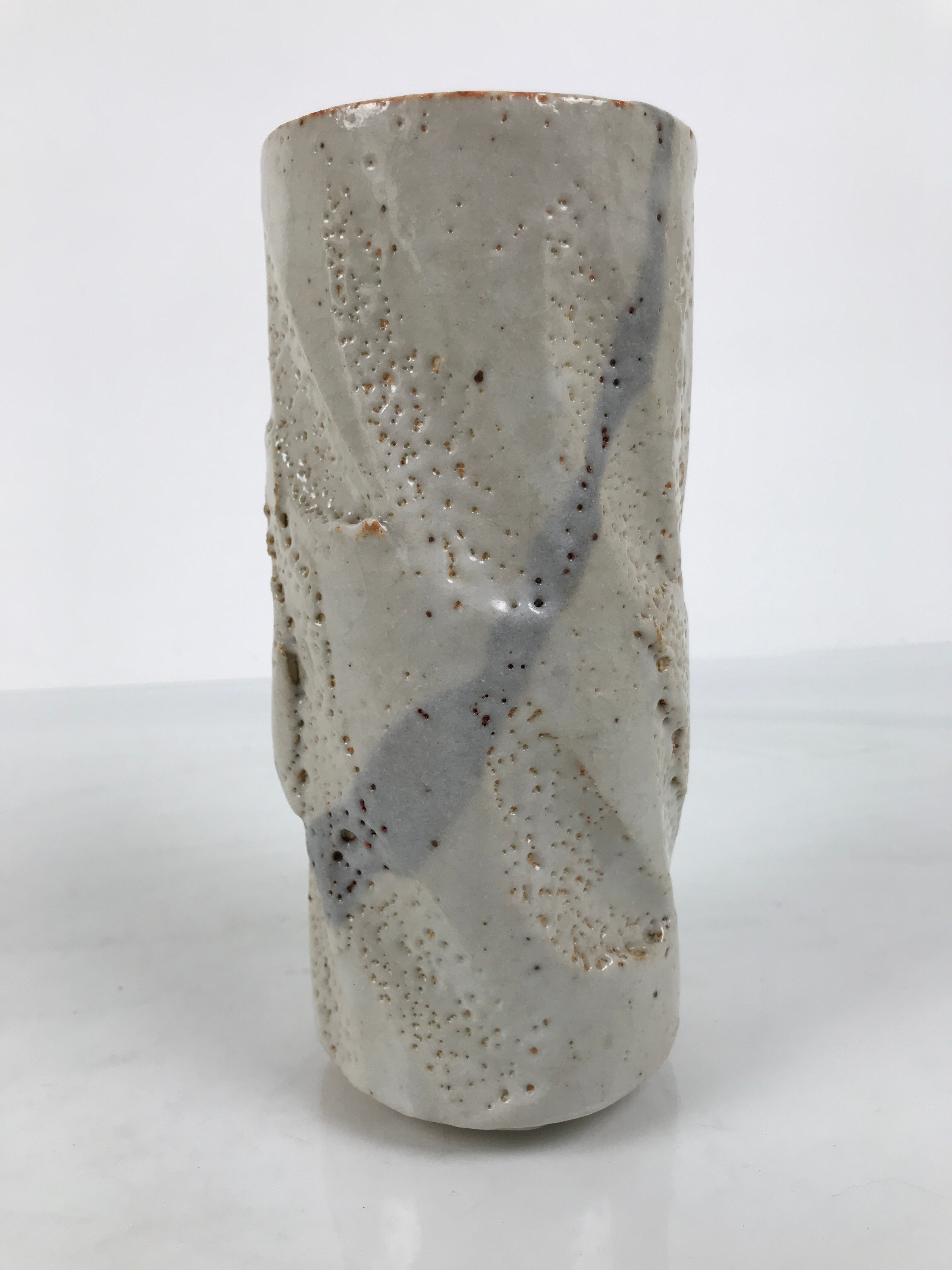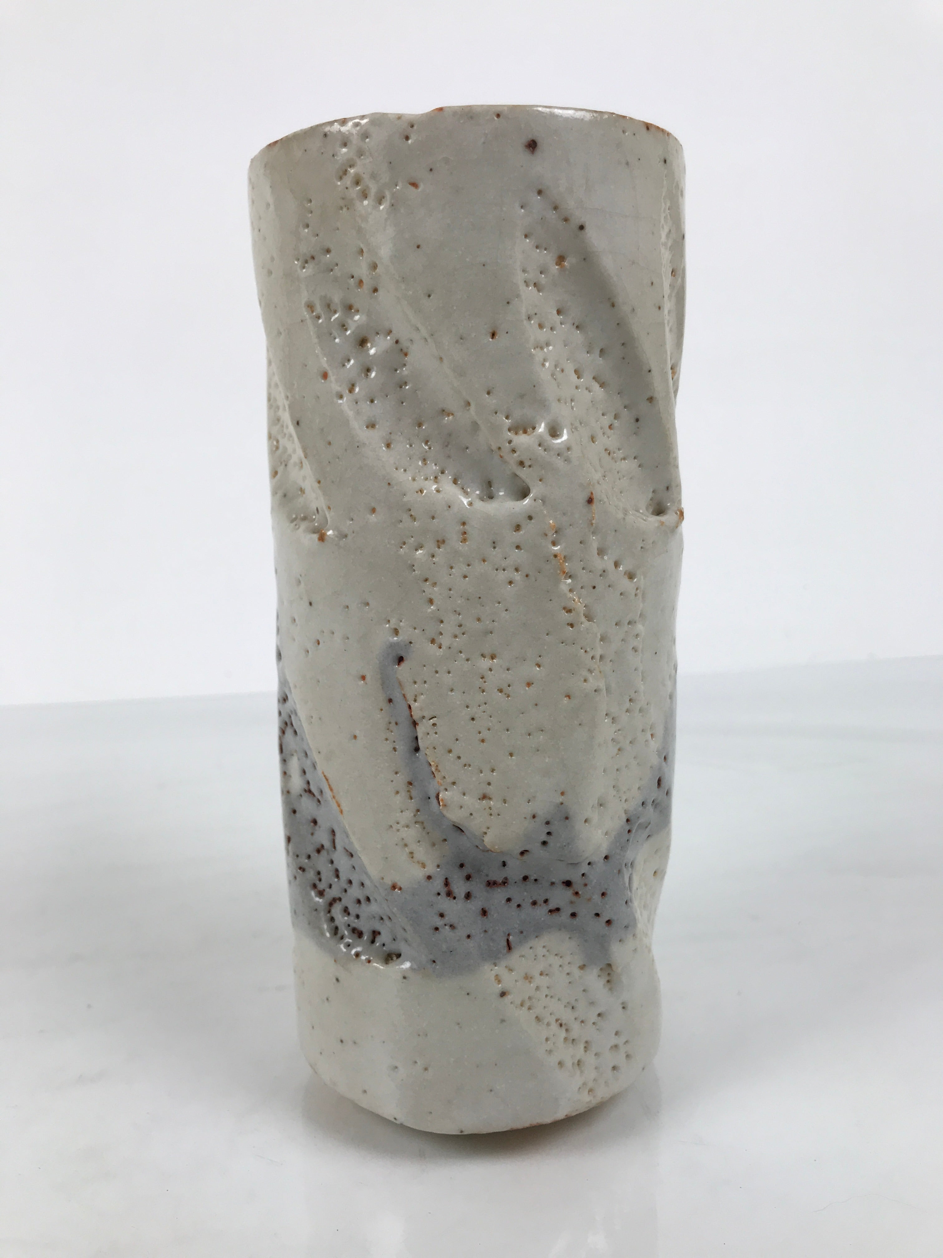 This is a vintage Japanese ceramic flower vase, also called kabin or hanaire in Japanese. This vase is in the Nezumi Shino ware style, a type of Mino ware. It has a gray textured glaze with black lined details. It is sturdy and easy to handle thanks to its design: a cylinder with deep and large carvings. This vase has an inscription on the bottom. It is wrapped and cased in a wooden box. This vase can be used for Ikebana or other floral arrangements. It is a beautiful item that can be displayed as decor.