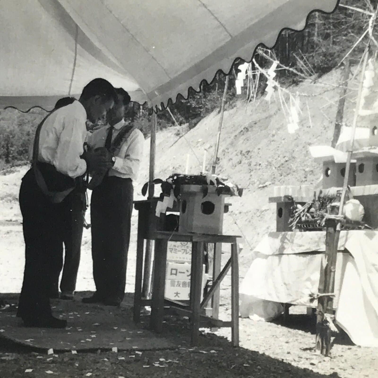 This is a Japanese vintage small black and white photograph of what appears to be politicians or local government/committee members praying before a Shinto offering altar. This ceremony could be for a variety of things, including the cleansing of a property before building, the celebration of harvest, the opening or completion of a property, town festivals, etc. Shinto offerings are almost always presented on raised wooden trays called sanpo/sanbou.