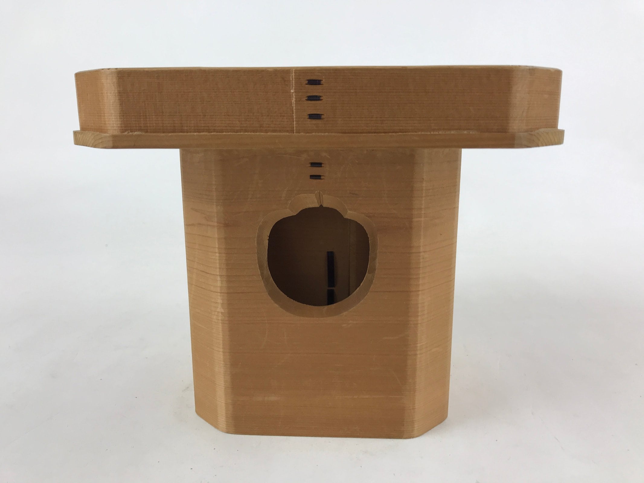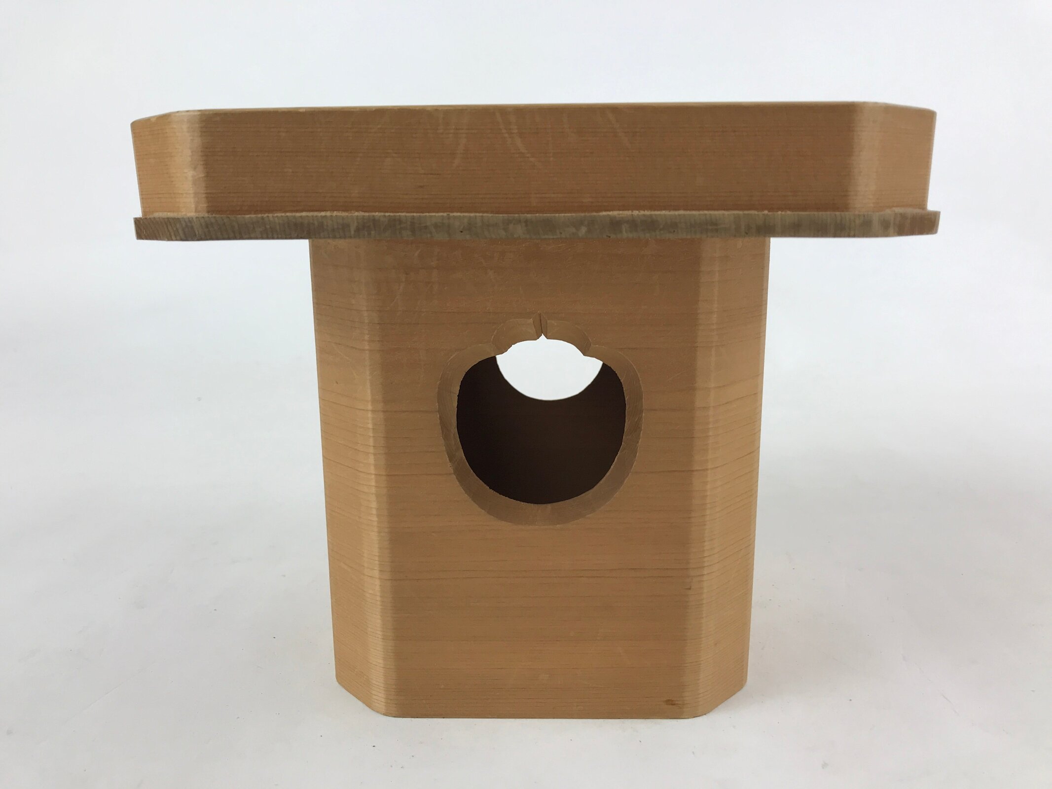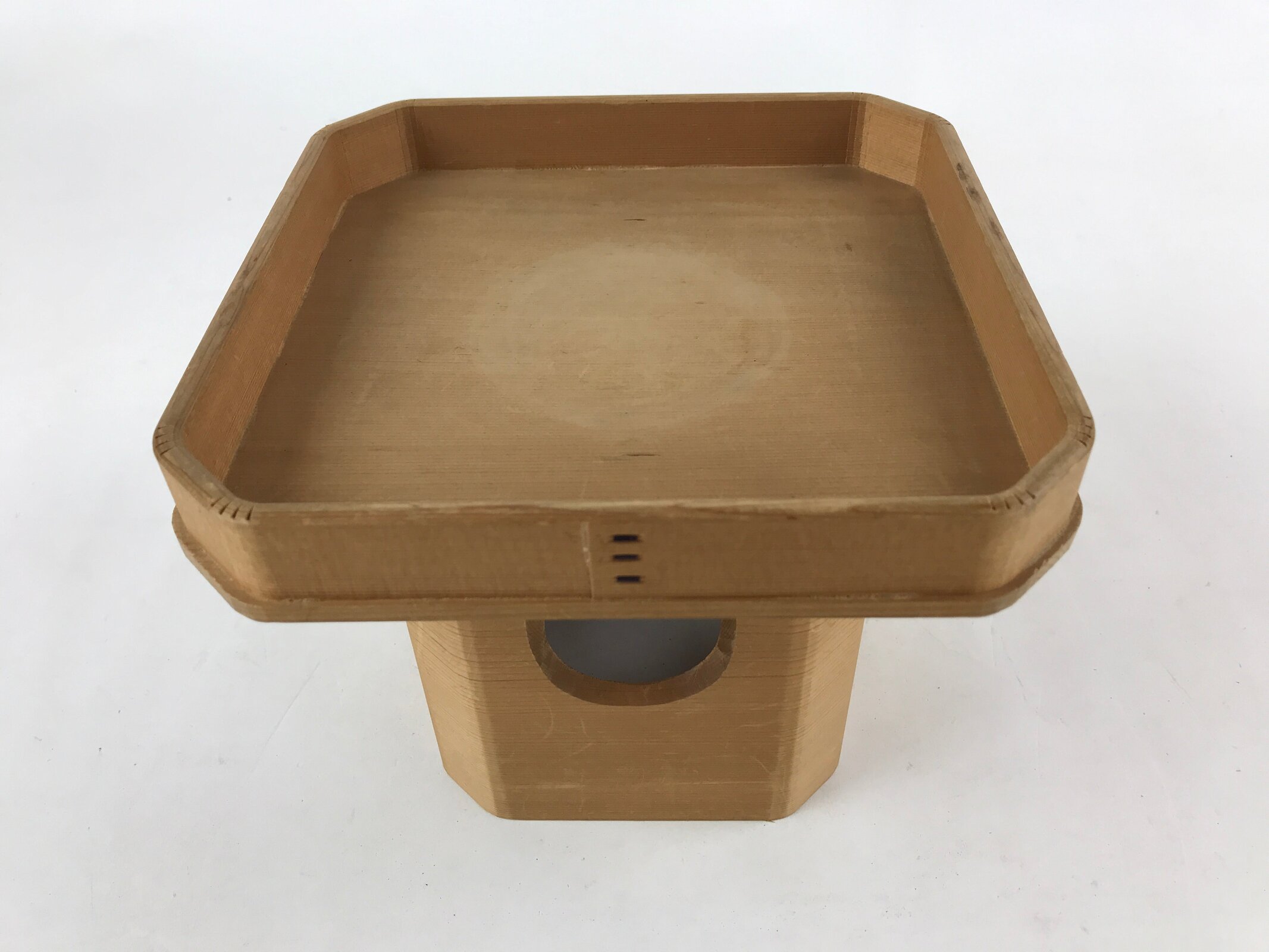 This is a vintage wooden offering tray stand for Shinto and Buddhist ceremonies called sanbou or sanpo respectively. Made of classic cypress wood, it has eight sides and stands on a similarly shaped pedestal. It is used to make offerings to Shinto gods, to represent the Three Treasures of Buddhism (Sangha, Dharma, and Buddha), as well as to present objects to noble people in ancient times.