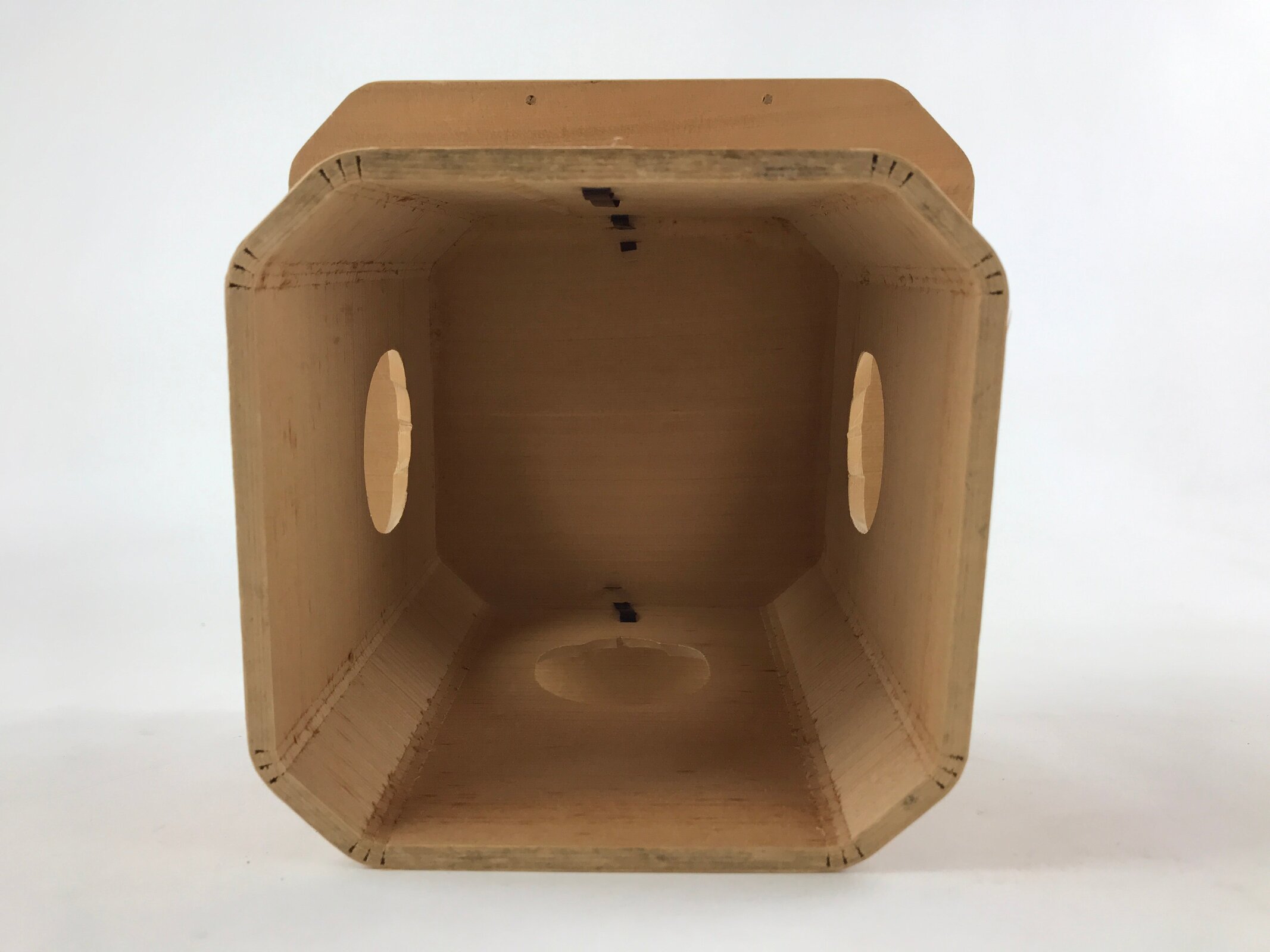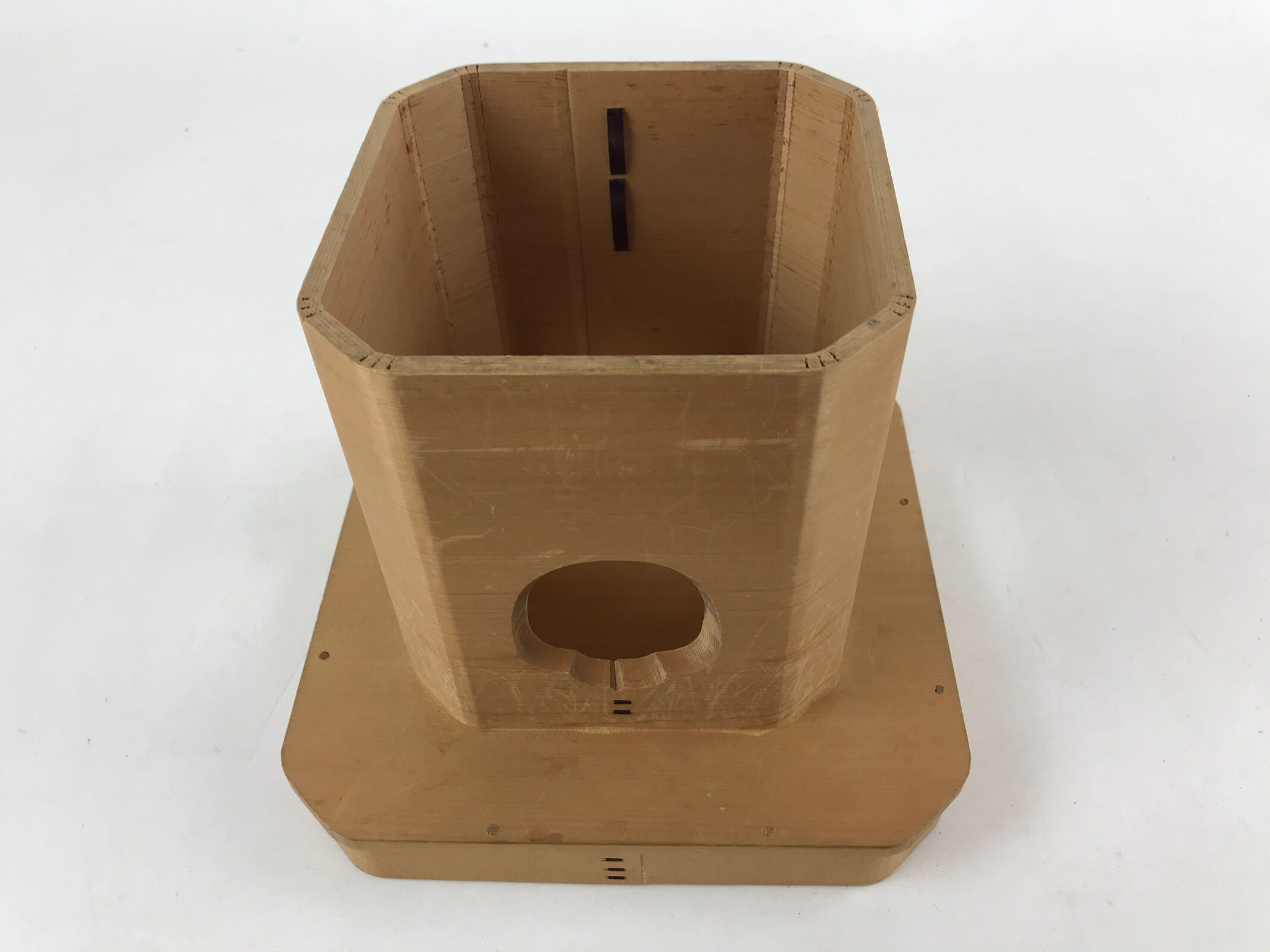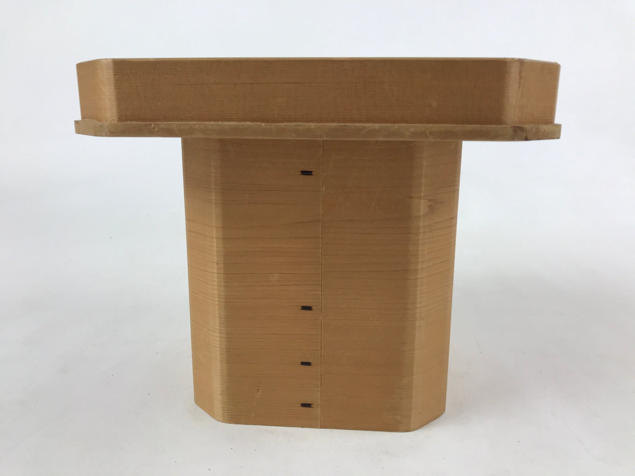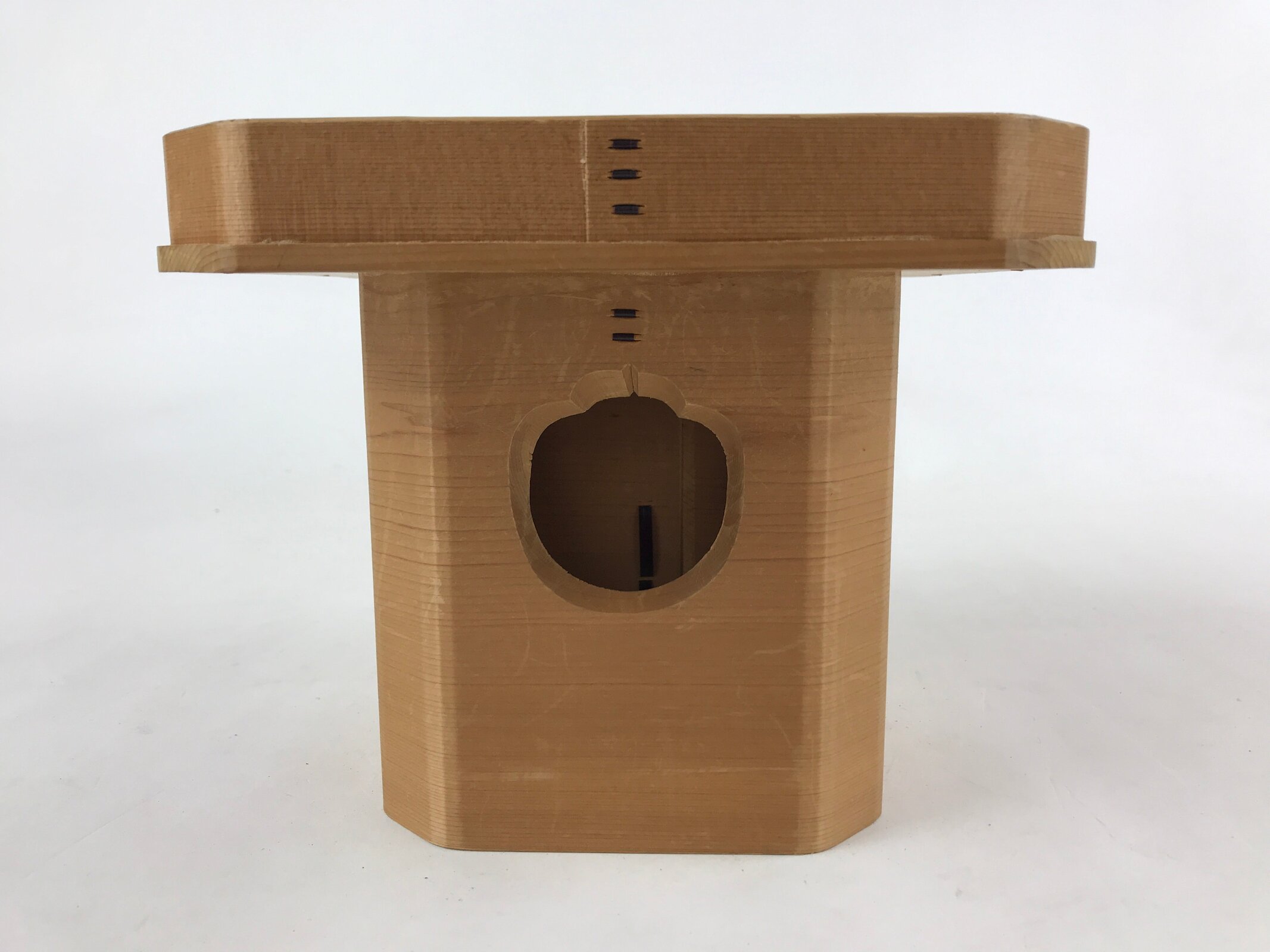 This is a vintage wooden offering tray stand for Shinto and Buddhist ceremonies called sanbou or sanpo respectively. Made of classic cypress wood, it has eight sides and stands on a similarly shaped pedestal. It is used to make offerings to Shinto gods, to represent the Three Treasures of Buddhism (Sangha, Dharma, and Buddha), as well as to present objects to noble people in ancient times.