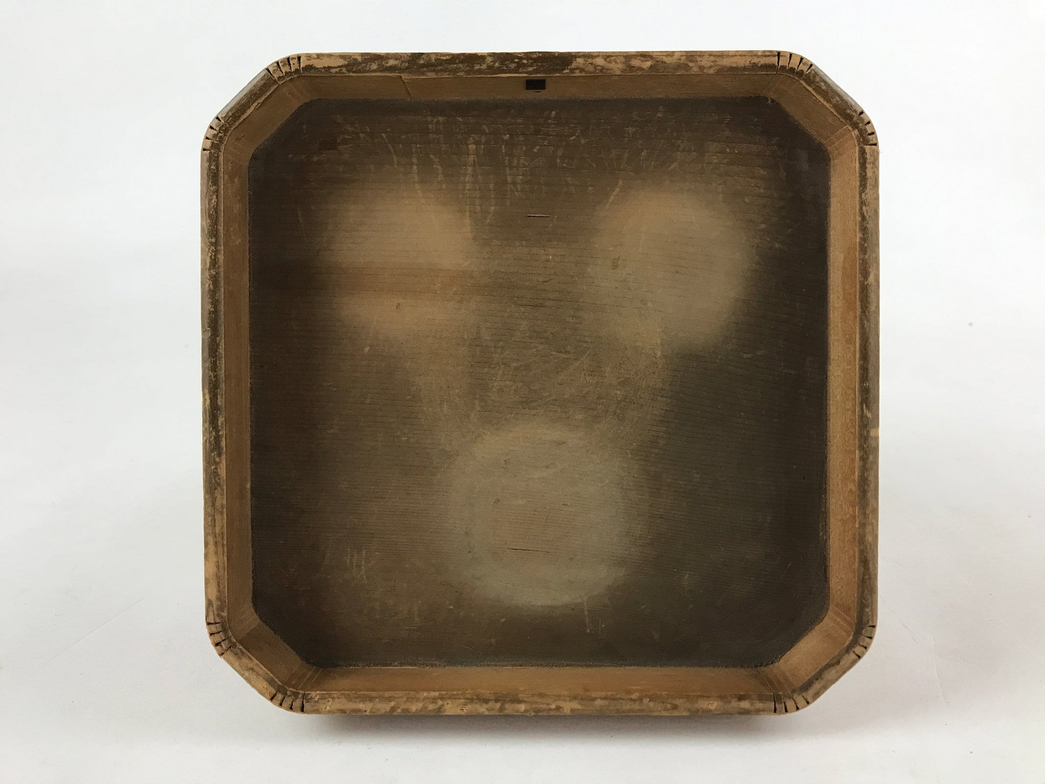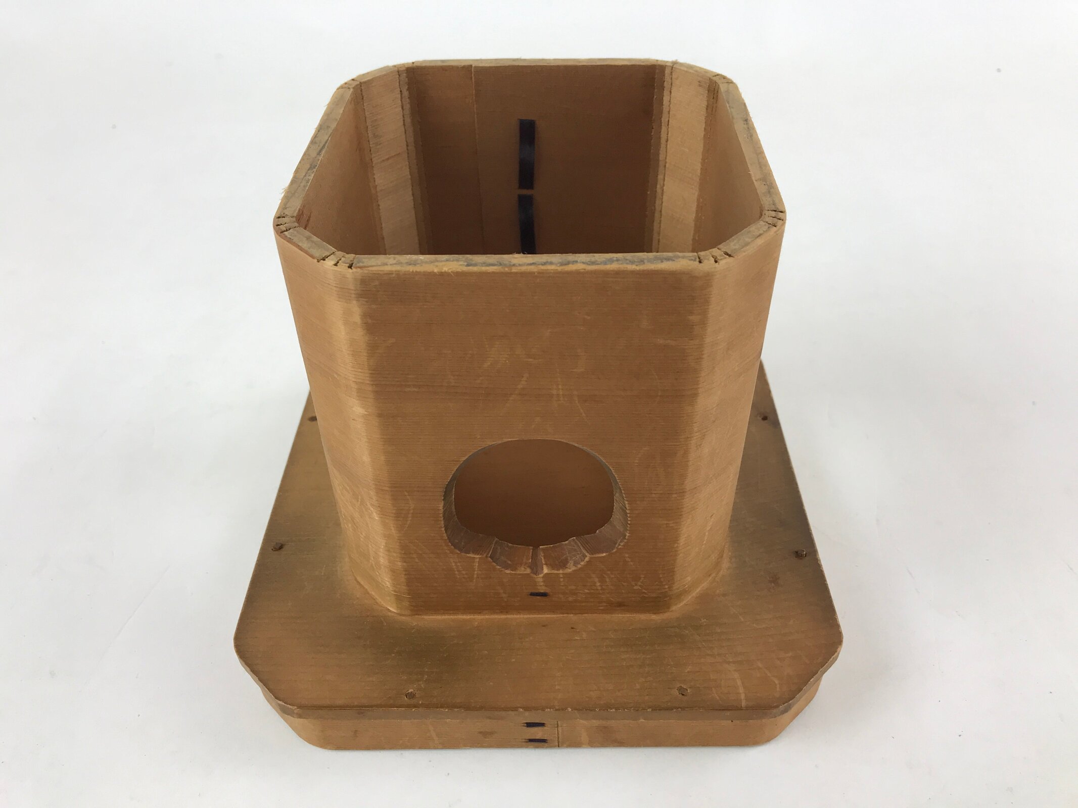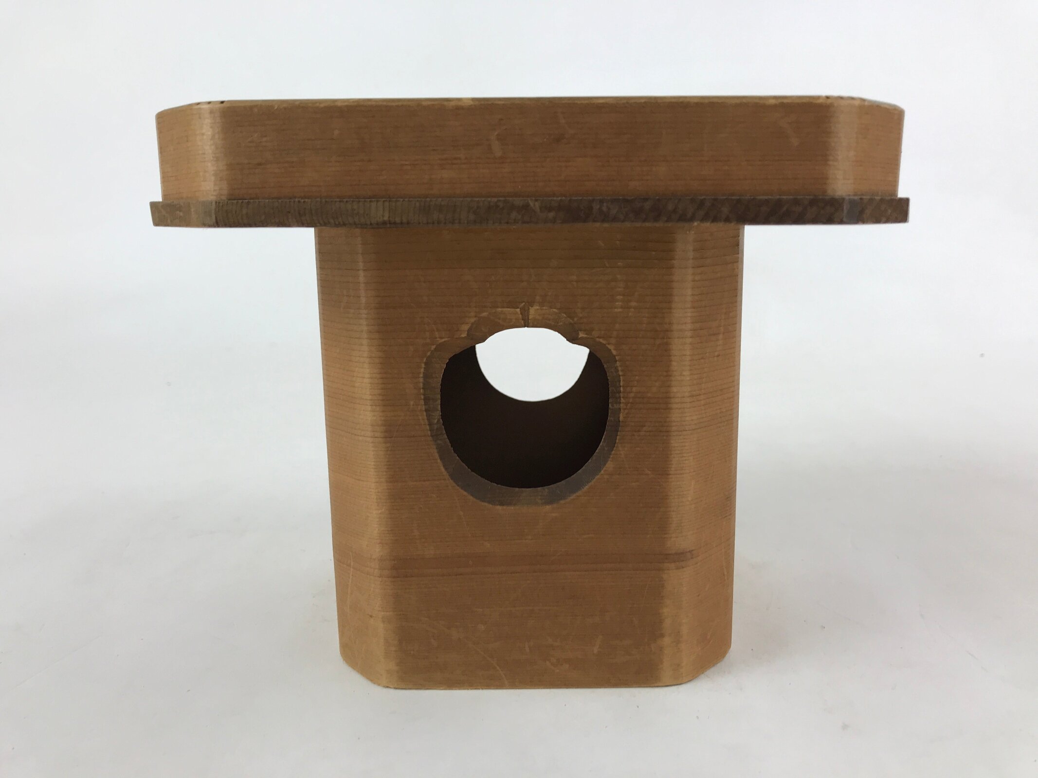 This is a vintage wooden offering tray stand for Shinto and Buddhist ceremonies called sanbou or sanpo respectively. Made of classic cypress wood, this small stand has eight sides and stands on a similarly shaped pedestal. It is used to make offerings to Shinto gods, to represent the Three Treasures of Buddhism (Sangha, Dharma, and Buddha) during religious services, as well as to present objects to noble people in ancient times.