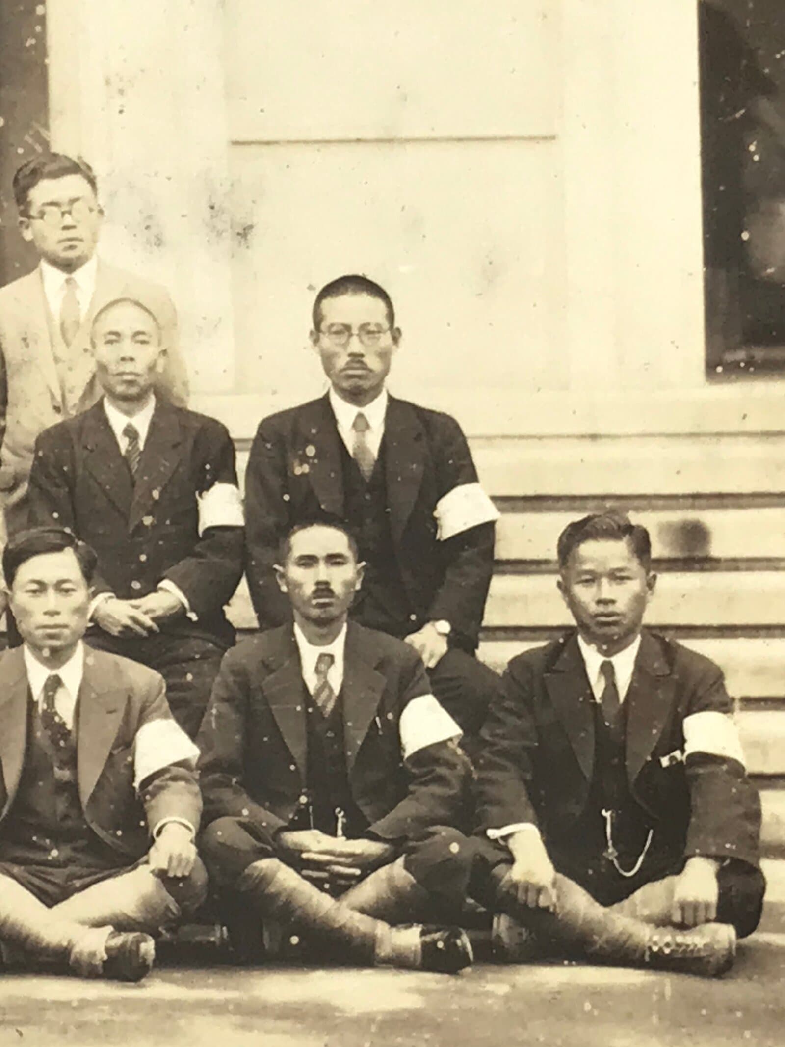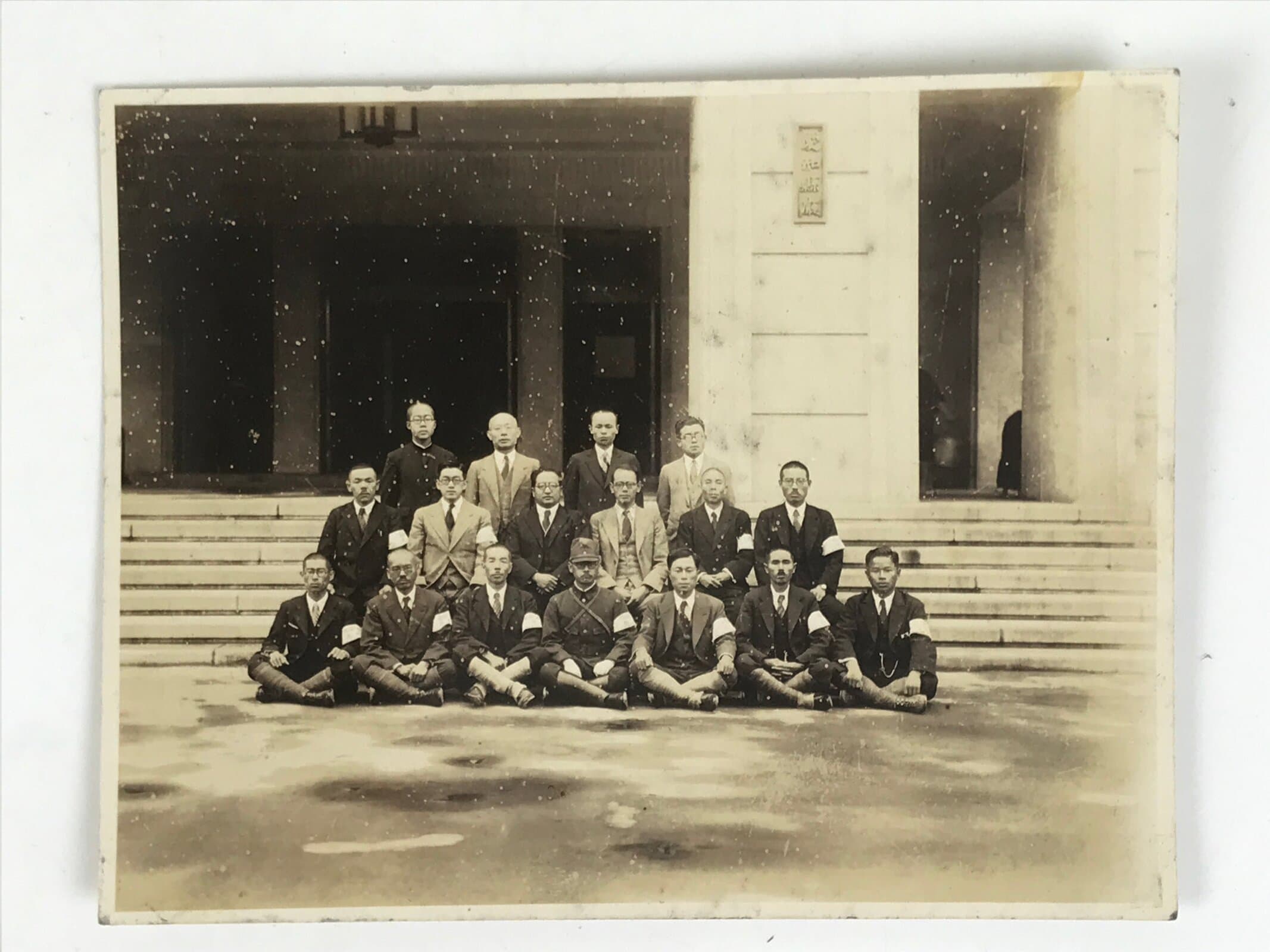 This is an original vintage Showa Era sepia tone photograph of a group of men posed in front of a building in Hsinking, China in the 1940’s. The men wear half military uniforms (bottoms) and half suits.