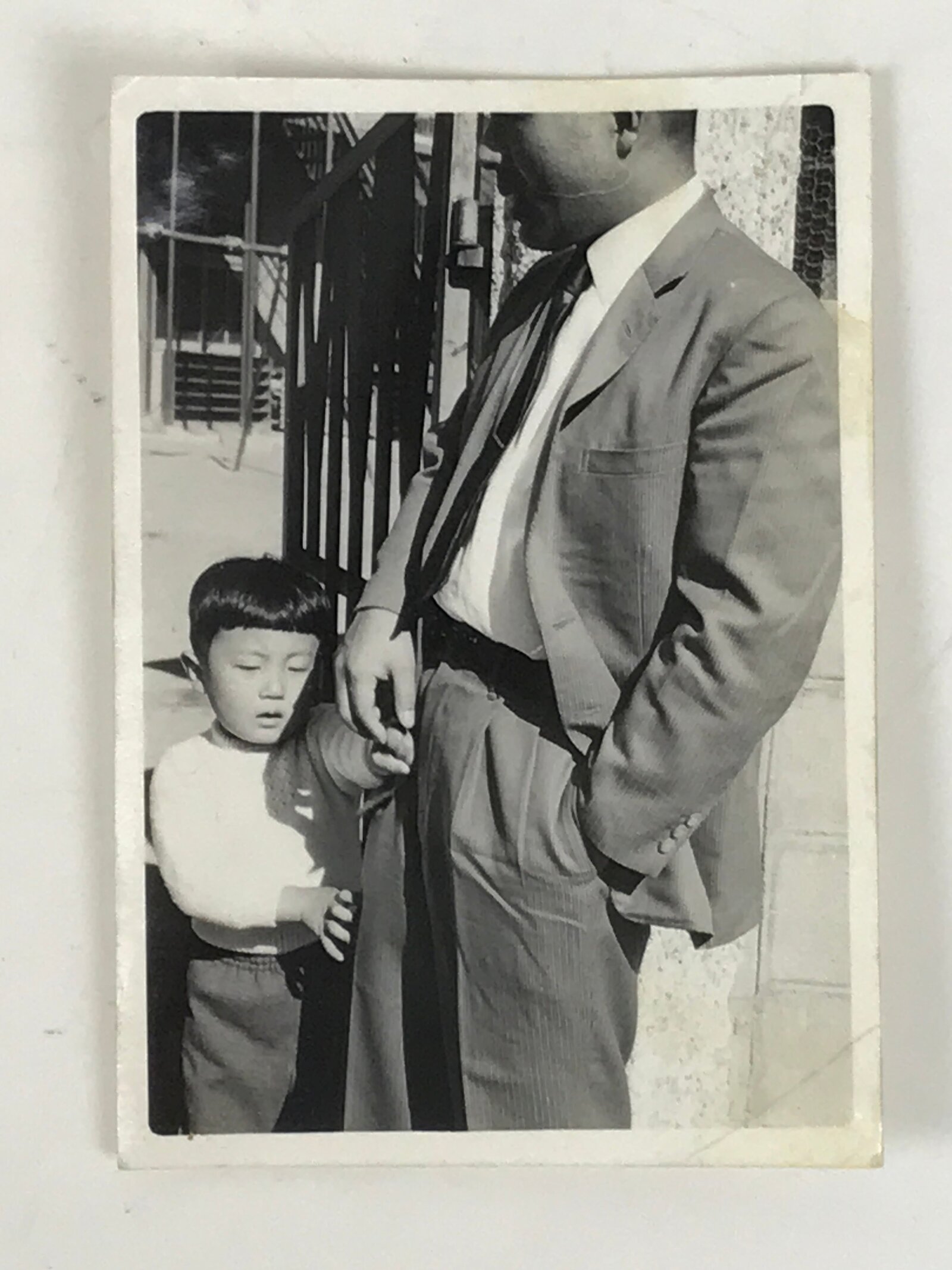 This is a Japanese vintage black and white photograph of a father and son holding hands outside a gate. The father wears a casual pinstripe suit while the little boy wears basic playclothes.