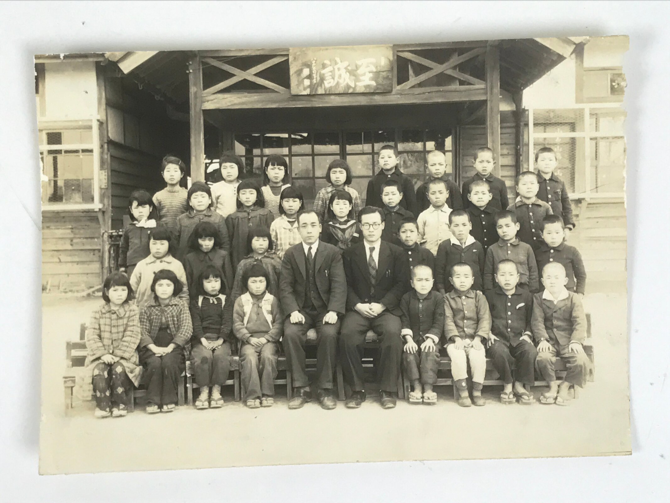 This is an original vintage Showa Era photograph of a class of elementary school students with their homeroom teacher and the school’s principal. The boys mostly wear something similar to a traditional school uniform while the girls wear mostly casual clothes.