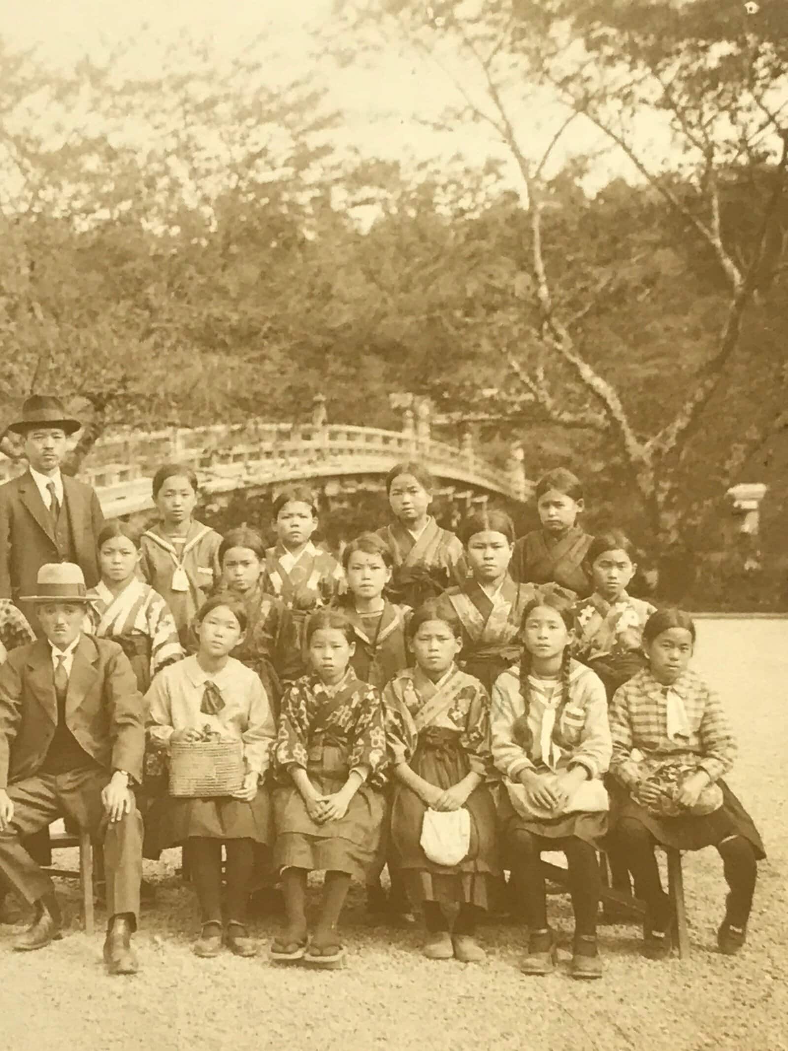 This is an original vintage early Showa Era photograph of a class of students in a soft sepia tone. The girls wear a combination of beautiful hakama with haori and traditional sailor fuku uniforms, while the boys also wear traditional uniforms and hakama. The teachers all wear suits. They are posed in front of the first torii gate and bridge of Ise Grand Shrine in Mie Prefecture.