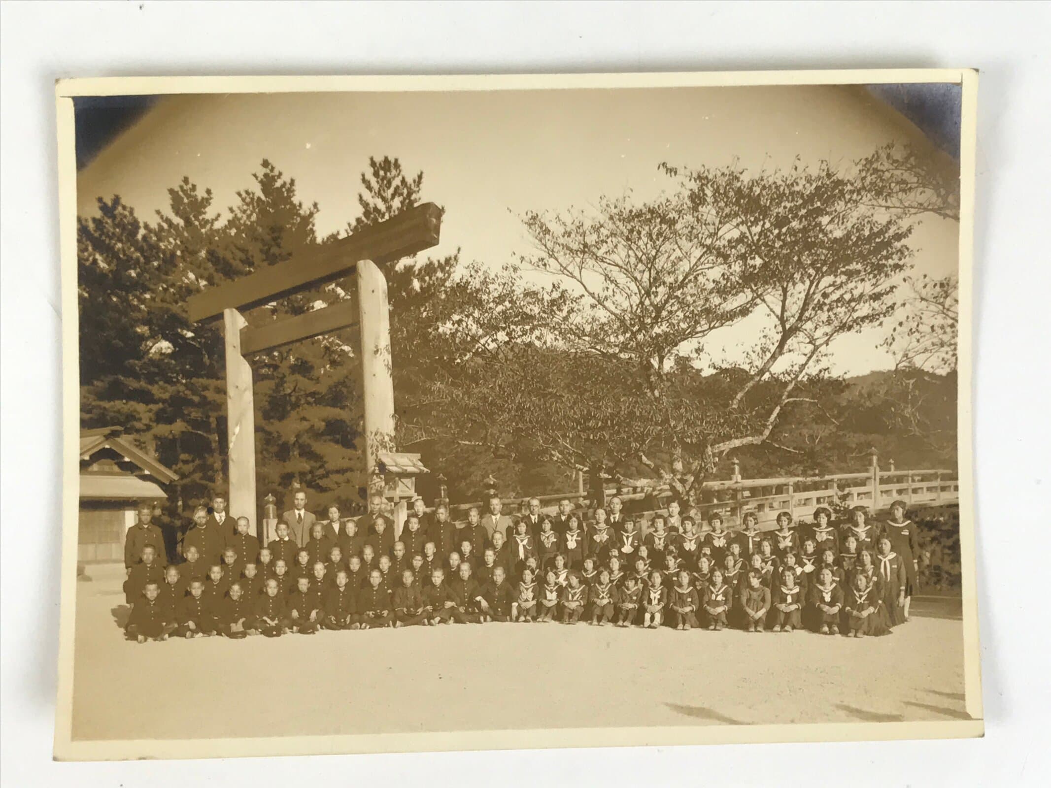 This is an original vintage early Showa Era photograph of a class of students in a soft sepia tone. Both girls and boys wear traditional school uniforms. The teachers all wear suits. They are posed in front of the first torii gate and bridge of Ise Grand Shrine in Mie Prefecture.
