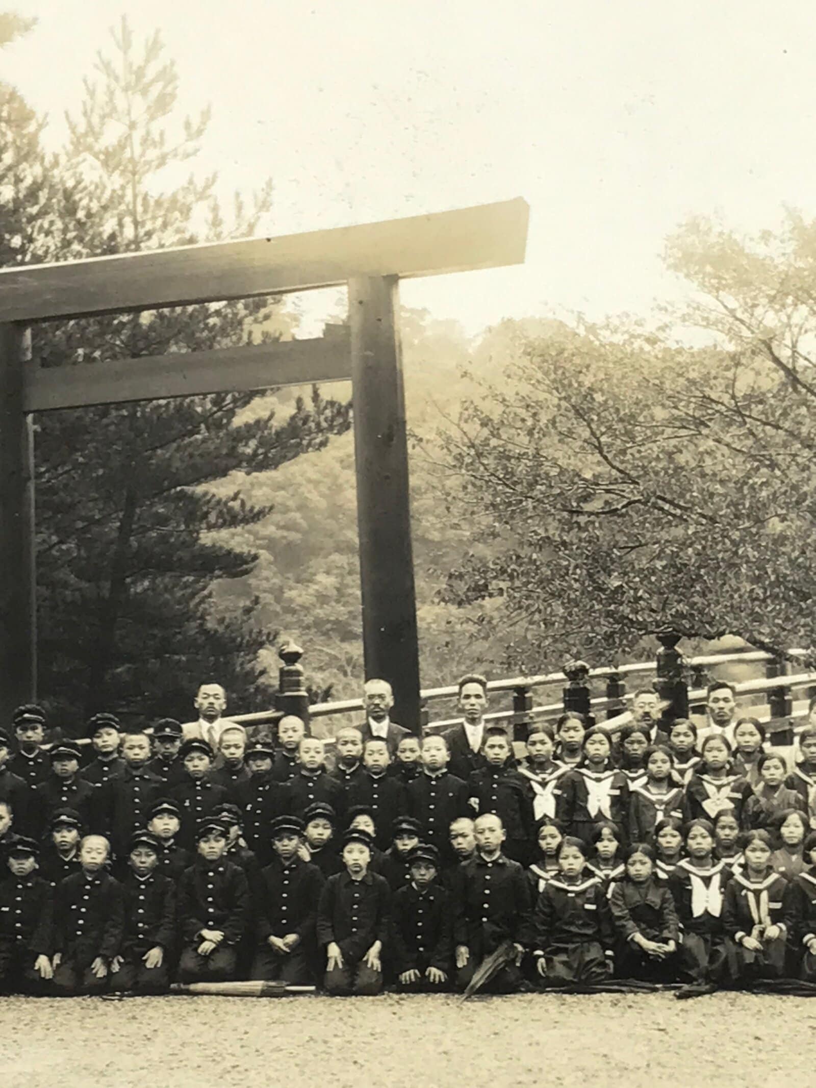 This is an original vintage Showa Era photograph of a class of students in a soft sepia tone. Both girls and boys wear traditional school uniforms. The teachers all wear suits. They are posed in front of the first torii gate and bridge of Ise Grand Shrine in Mie Prefecture.