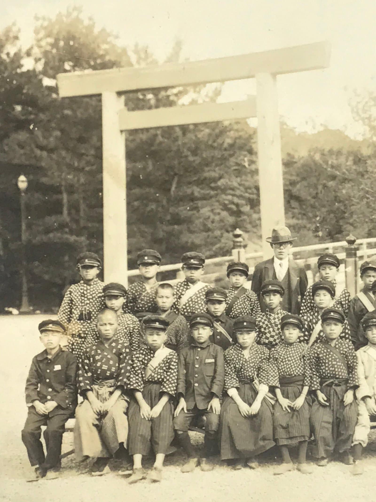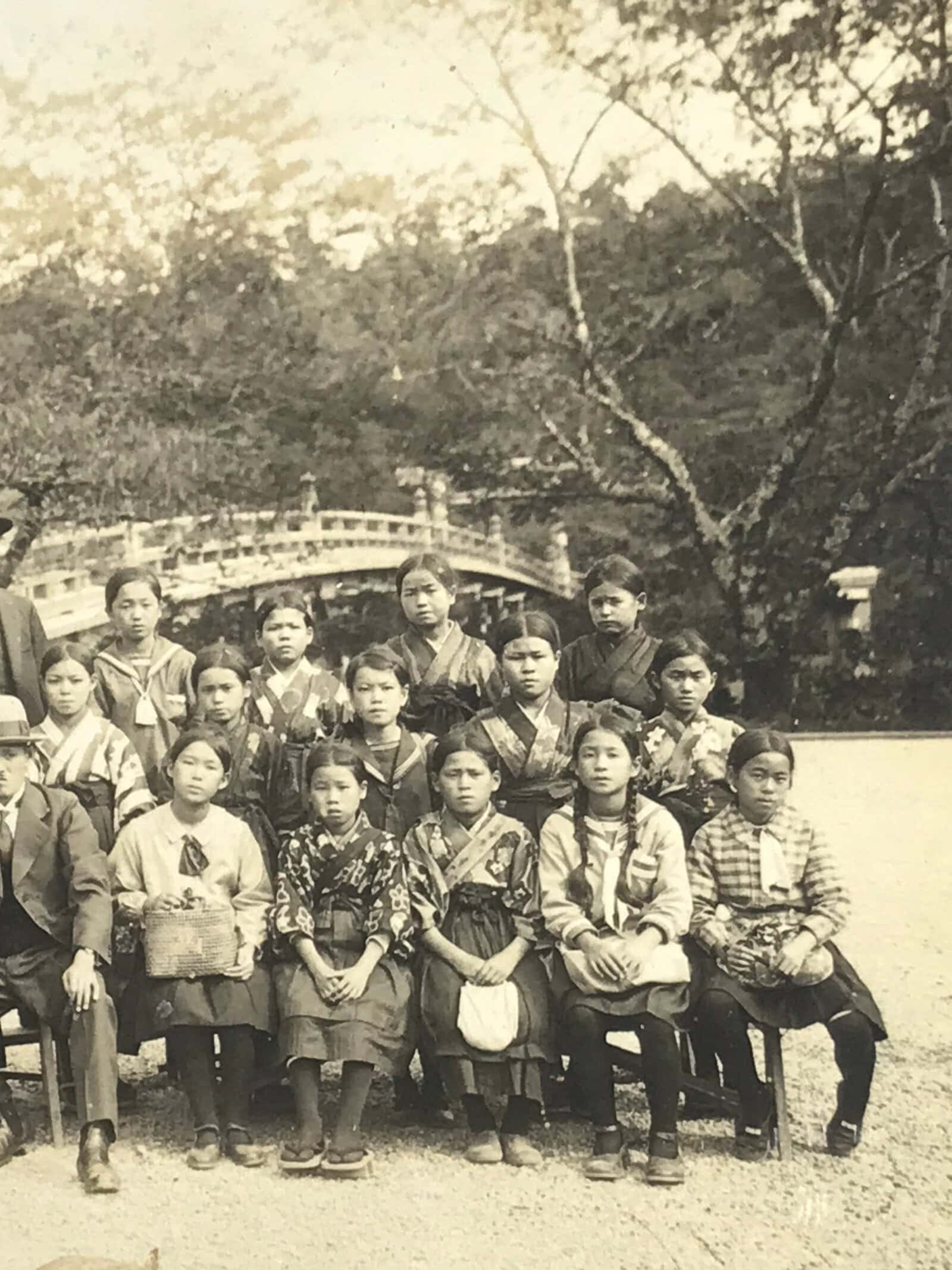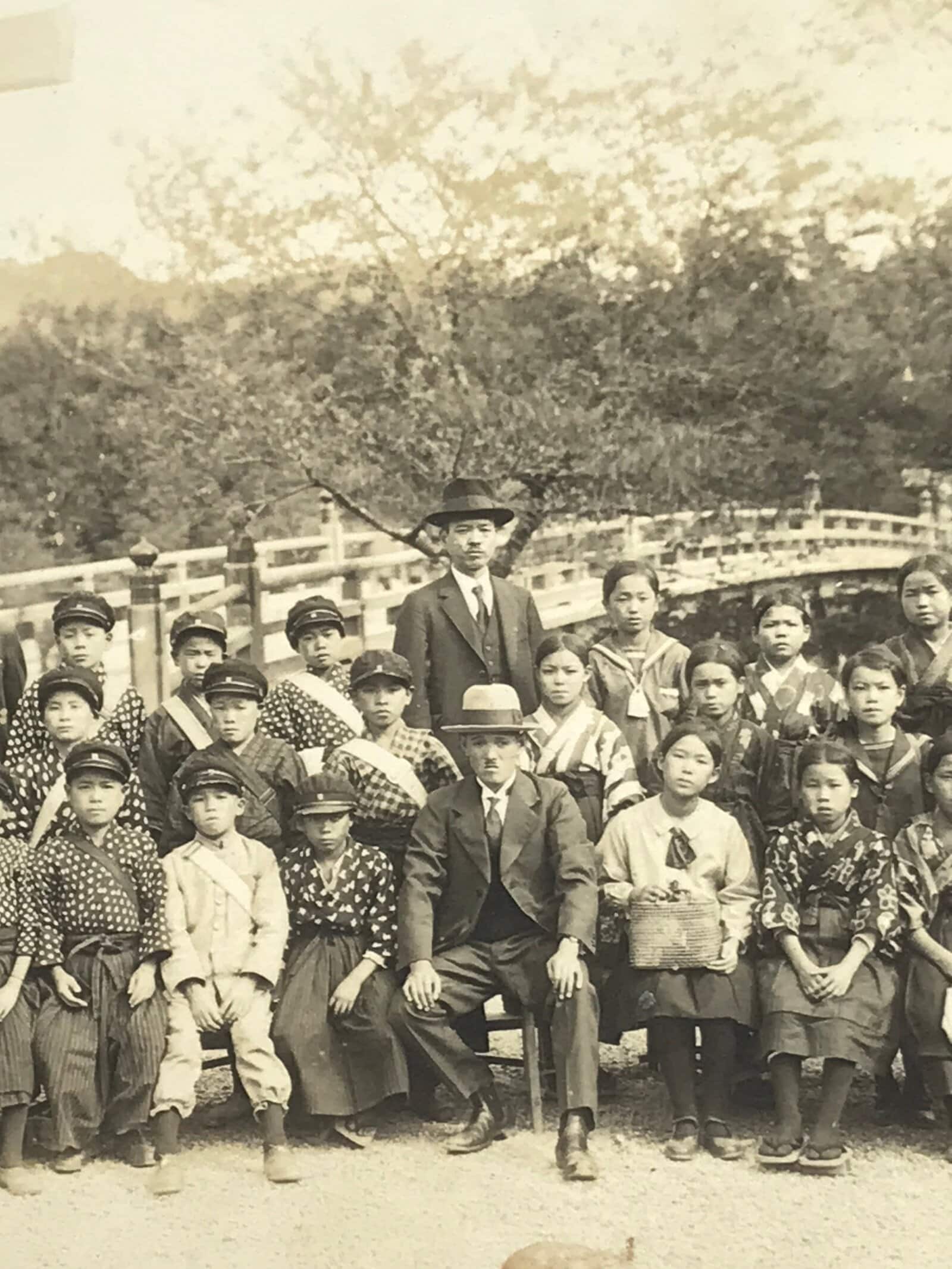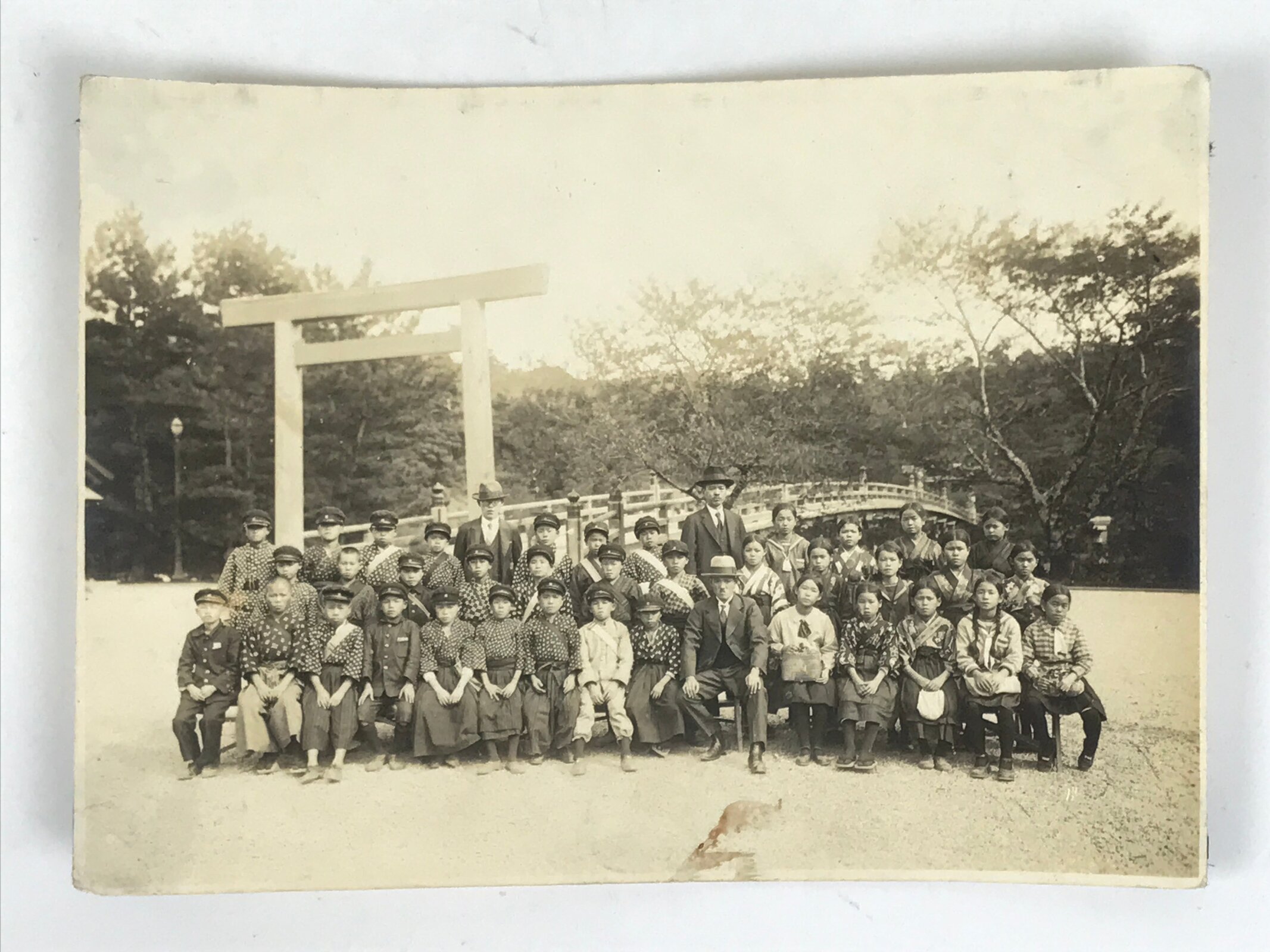 This is an original vintage early Showa Era photograph of a class of students in a soft sepia tone. The girls wear a combination of hakama with haori and traditional, casual clothes, and sailor fuku uniforms, while the boys also wear traditional uniforms and hakama with caps. The teachers all wear suits. They are posed in front of the first torii gate and bridge of Ise Grand Shrine in Mie Prefecture.