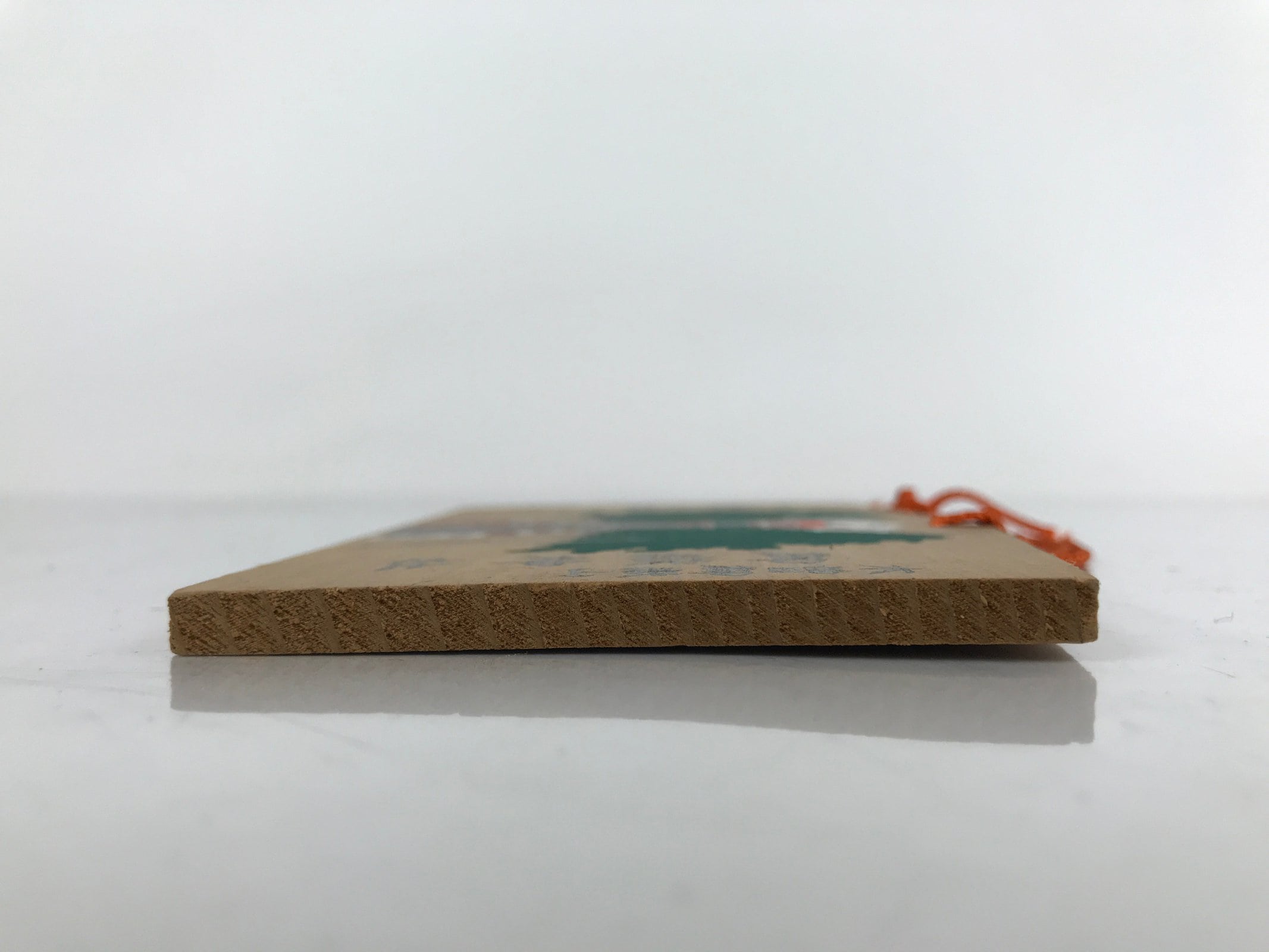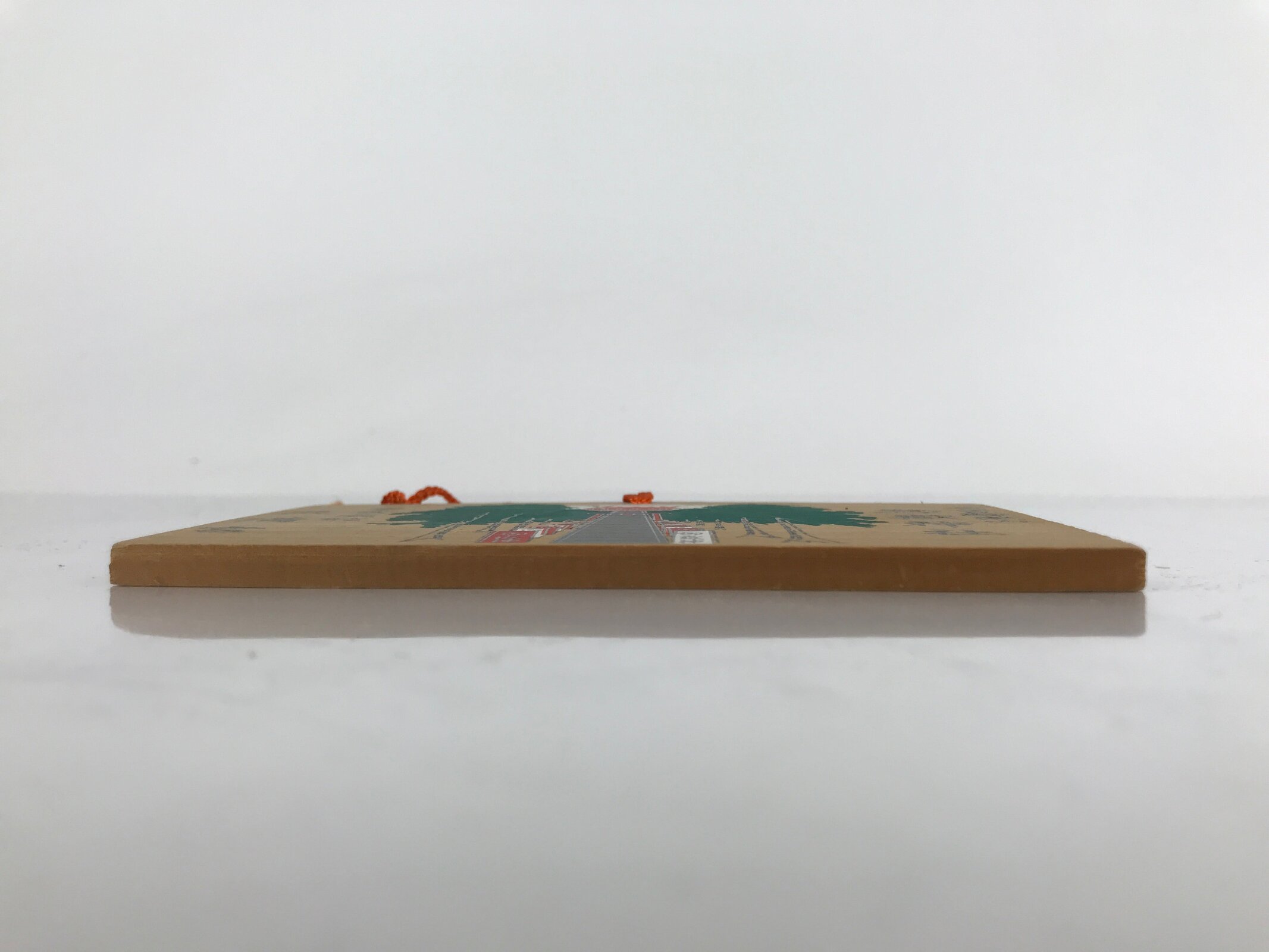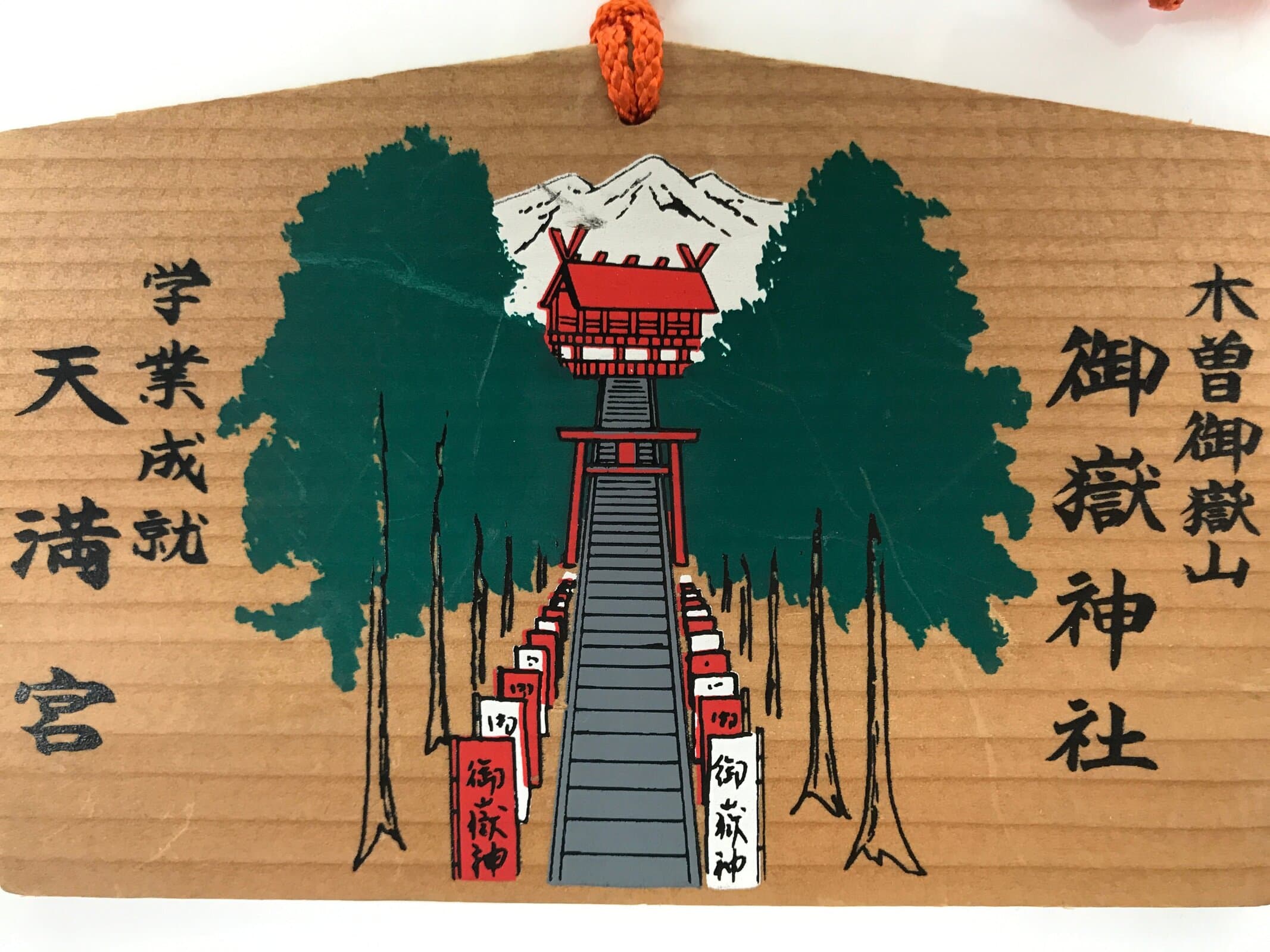 This vintage Japanese ema plaque represents stairs leading to a shrine with trees on the sides and a big mountain, Mount Ontake, on the back. It is a plaque to pray for academic success. It has some vertical inscriptions in Japanese with the name of the shrine. It has an orange braided cord.