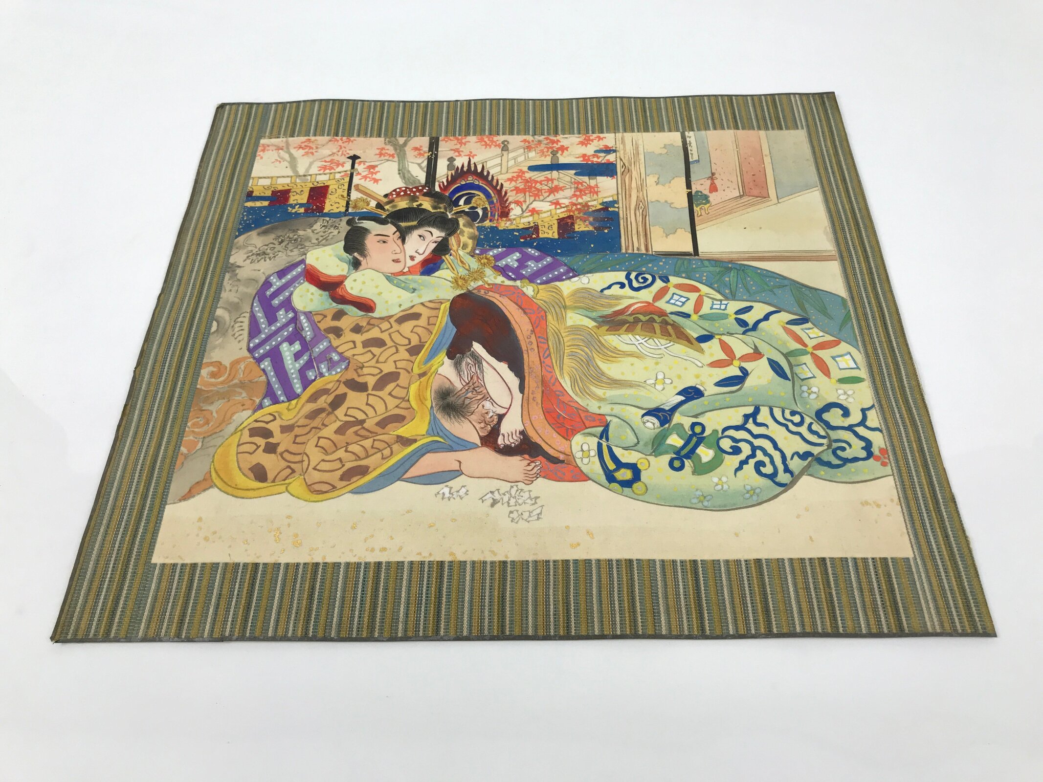 This is a Japanese erotic shunga hand-painted piece. It depicts a man and a woman, possibly an oiran. There is a picture with Momiji red leaves in the background. The shunga picture is painted on silk attached to a thick washi paper.