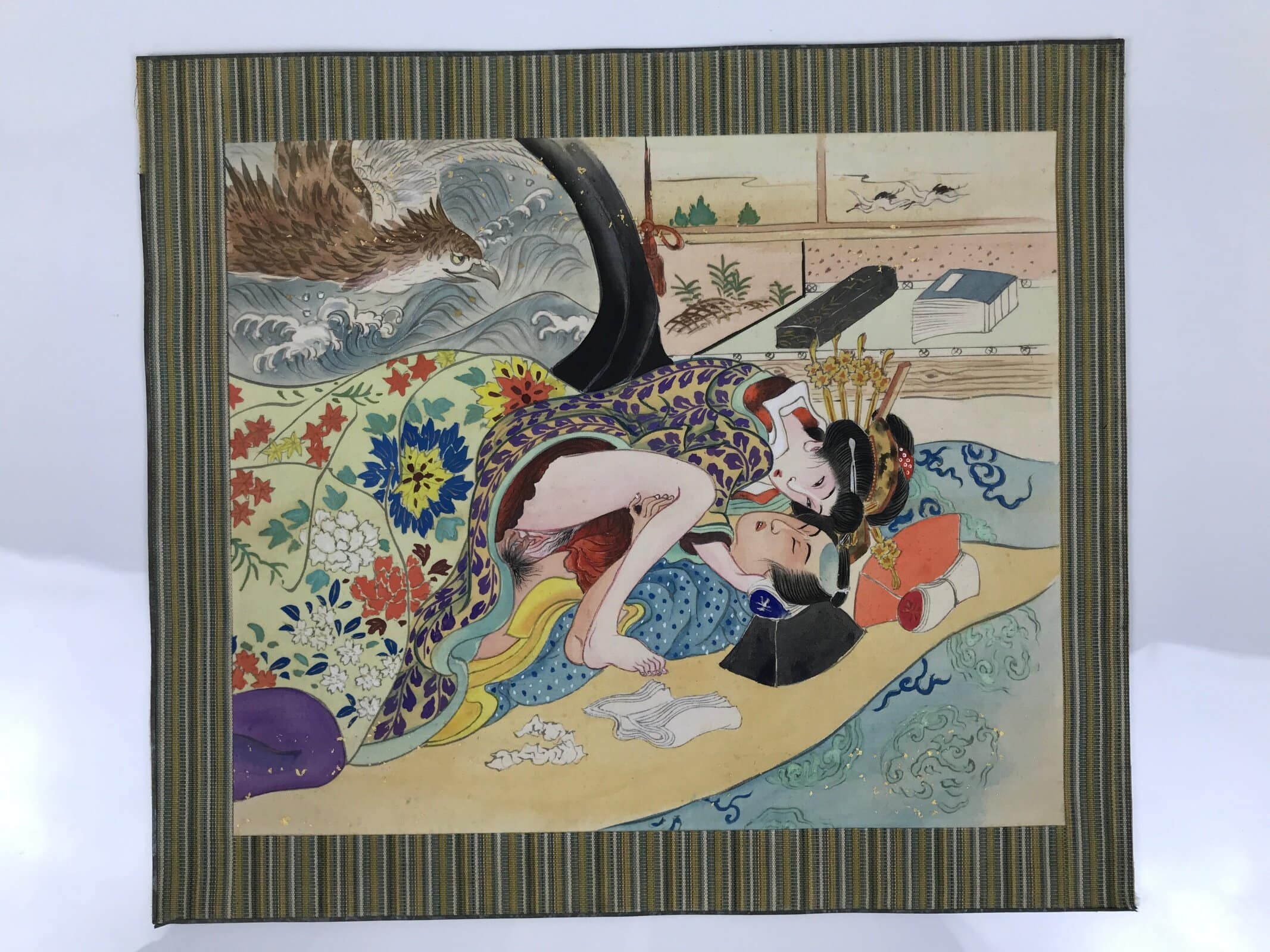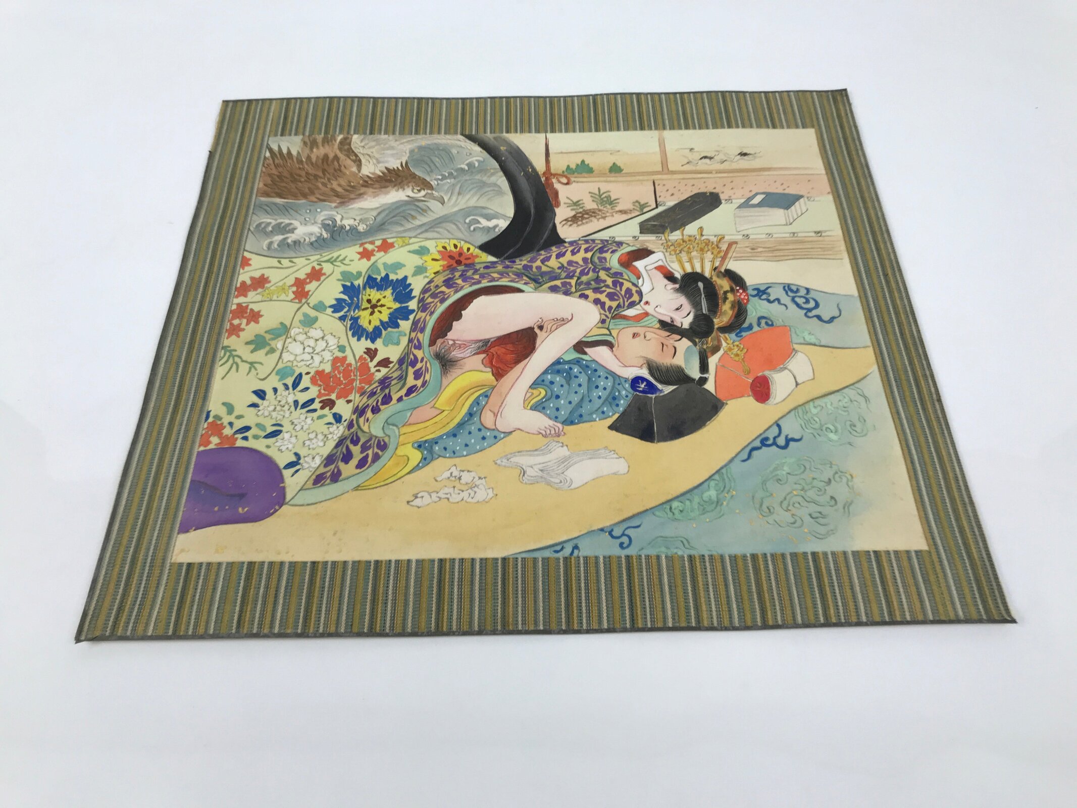 This is a Japanese erotic shunga hand-painted piece. It depicts a man and a woman, possibly an oiran. The couple is indoors. There is a detail with a bird flying over waves on the left of the scene. The picture is painted on silk, attached to a thick sheet of washi paper.