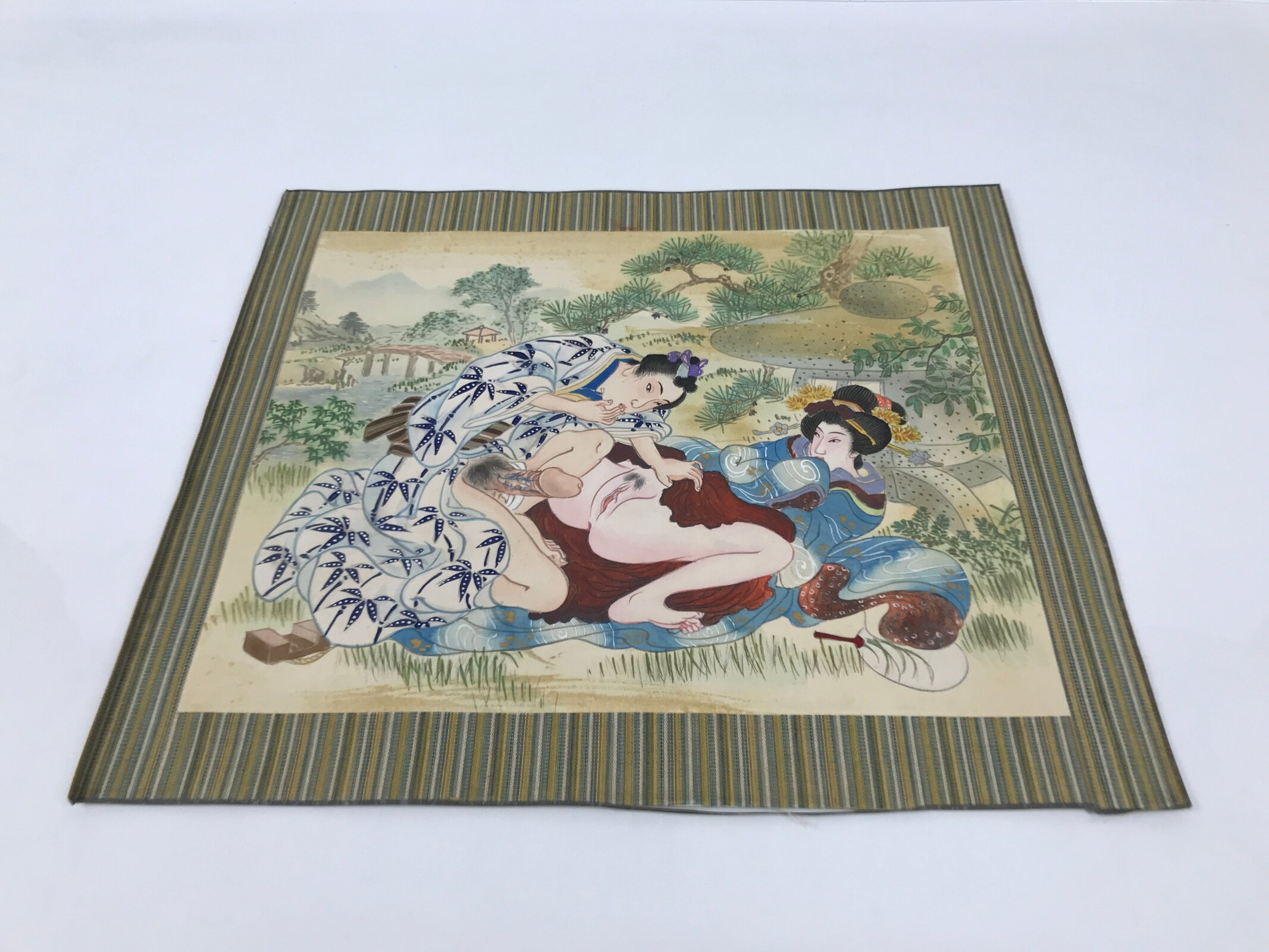 This is a Japanese erotic shunga hand-painted piece. It depicts a man and a woman outside in a garden. The picture is painted on silk, attached to a thick sheet of washi paper.