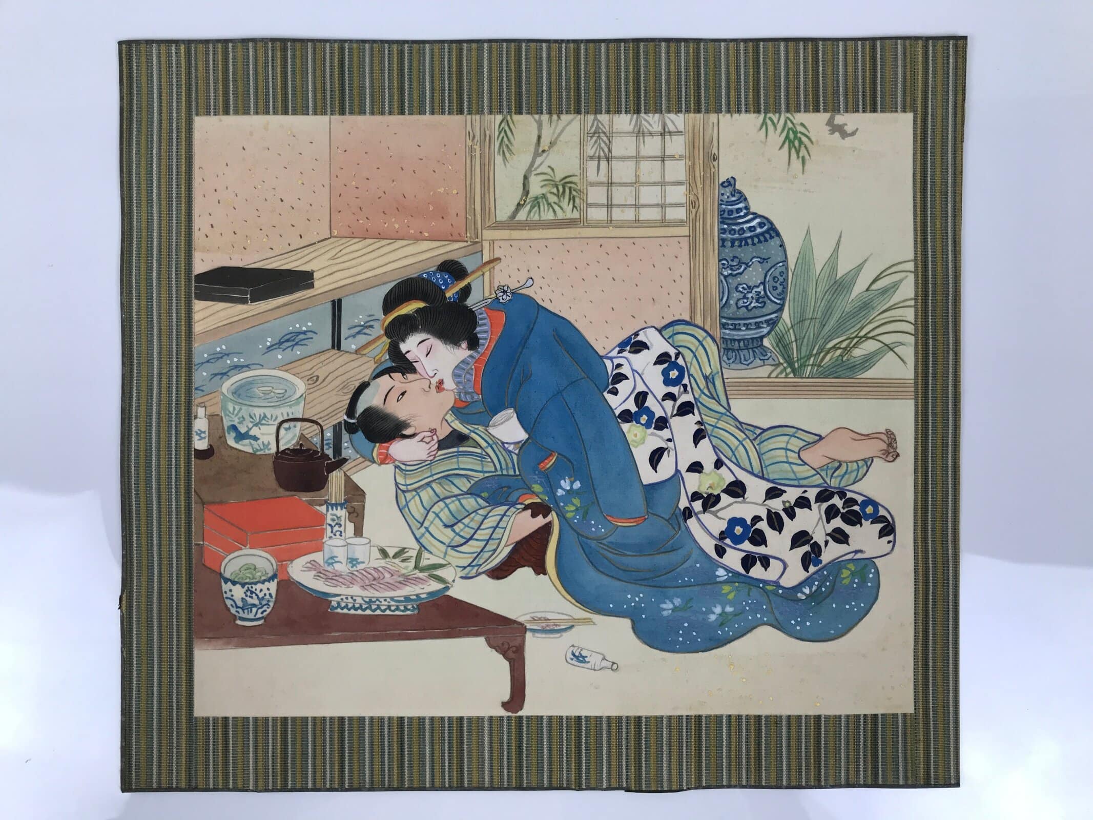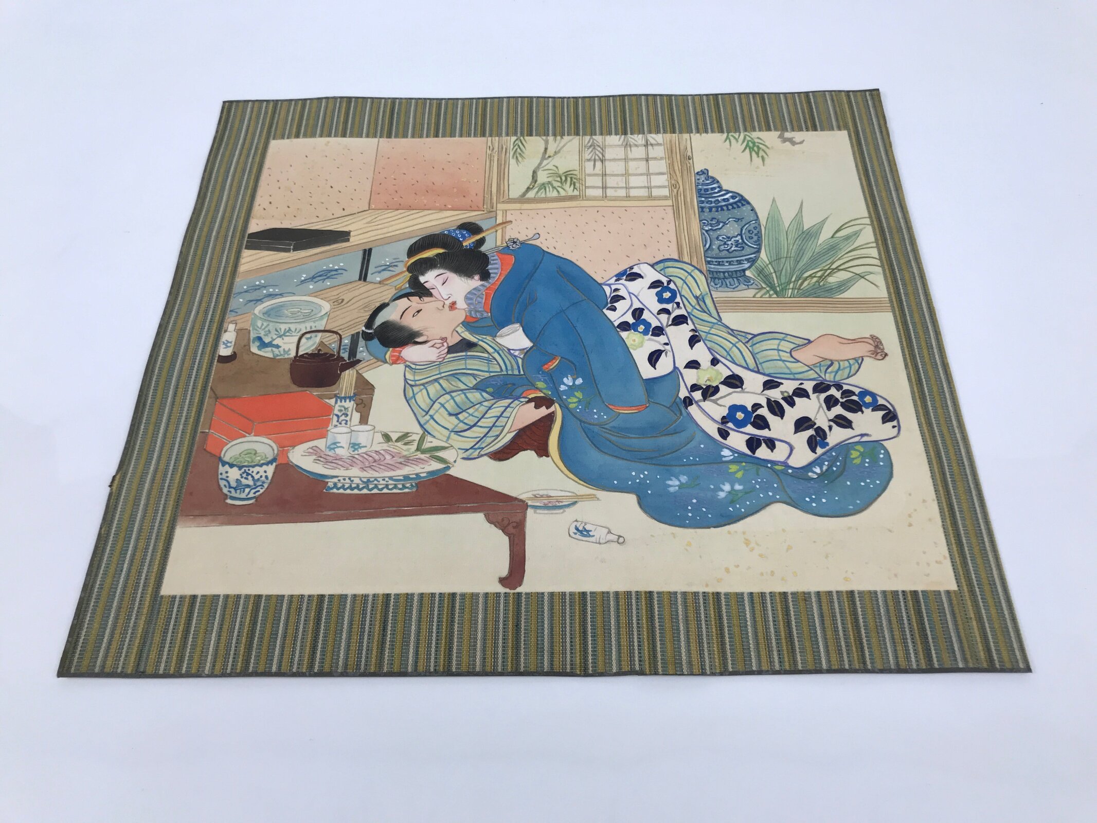 This is a Japanese erotic shunga hand-painted piece. It depicts a man and a woman kissing. There are tables with a plate of sashimi fish, a jubako bento box, a teapot, and other utensils on the left. The shunga picture is painted on silk, attached to a thick sheet of washi paper.