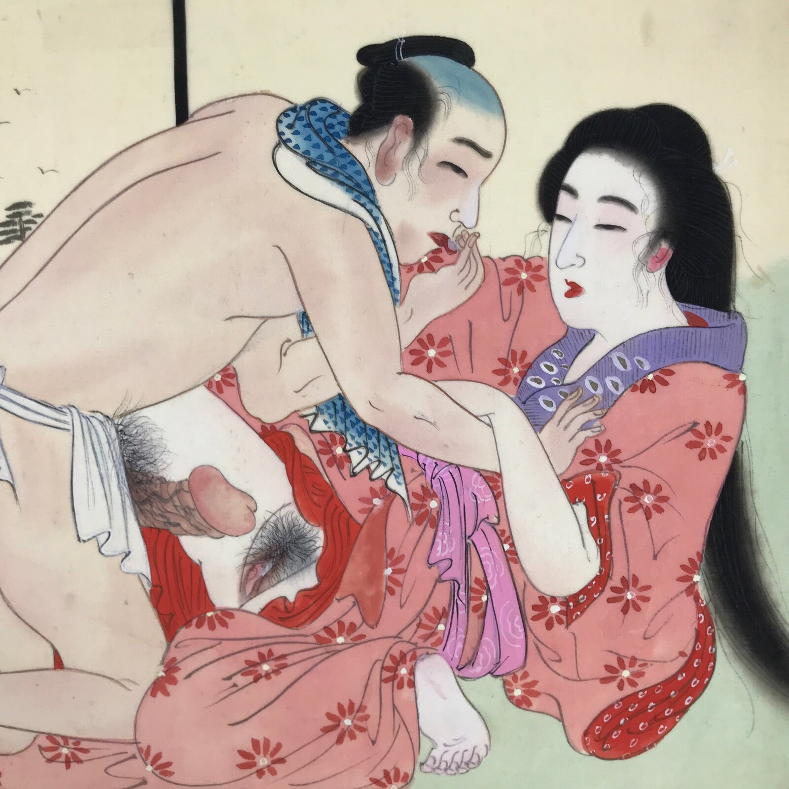 This is a Japanese erotic shunga handpainted piece, likely a reproduction, by Toyokuni III and Hiroshige Utagawa. It depicts a woman with a naked man. It is painted on silk, and afterwards placed inside a thick paper frame with a protective plastic sheet.